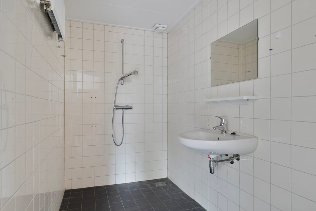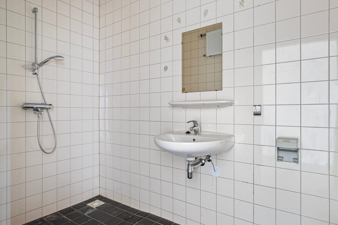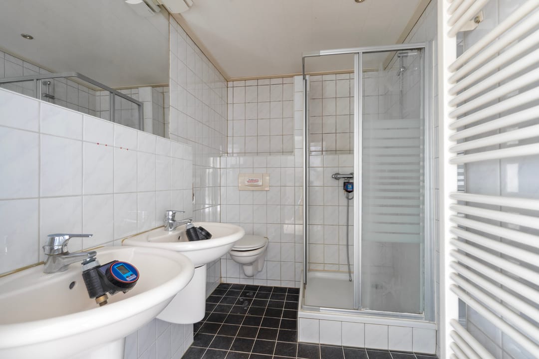 De badkamers is voorzien van een douchhoek, dubbele wastafel en toilet.