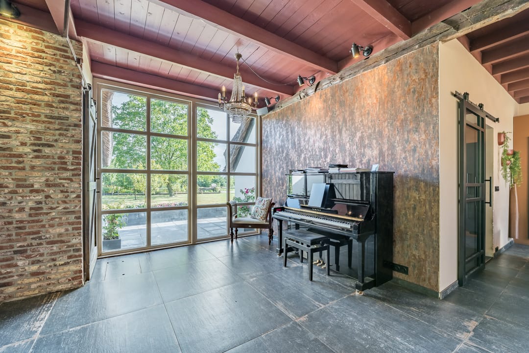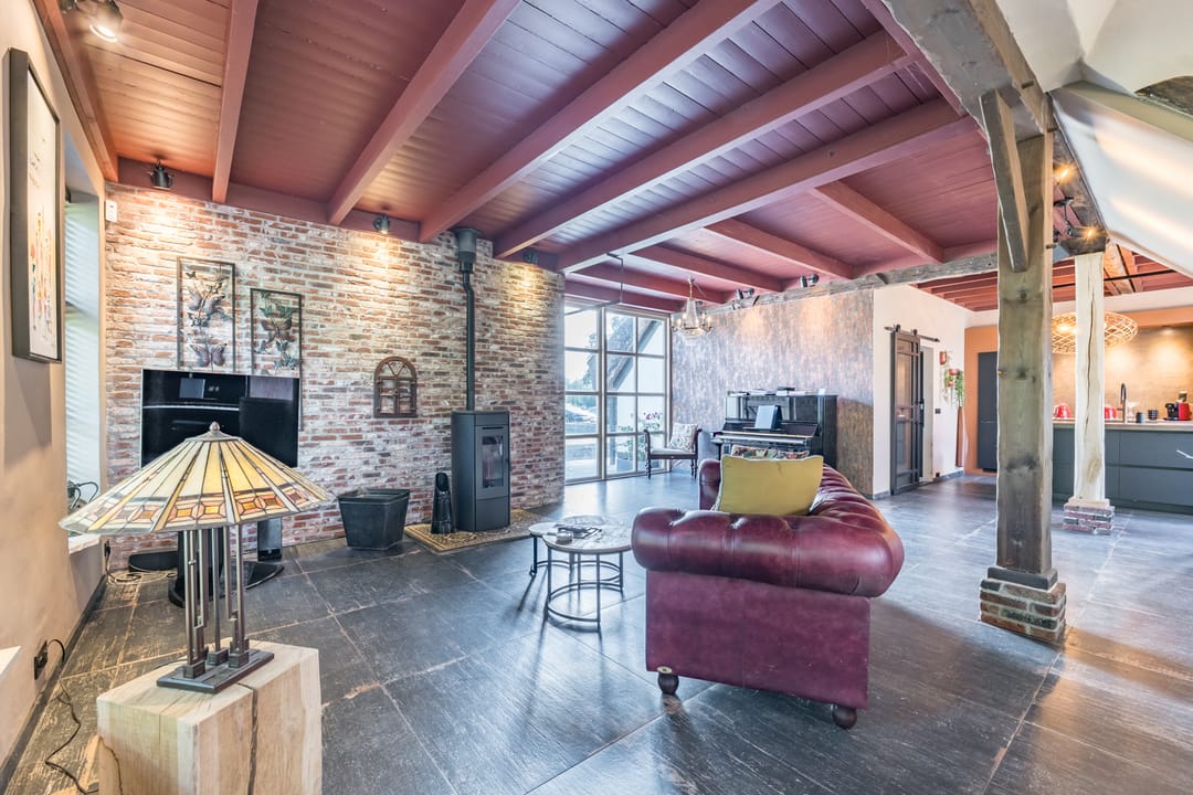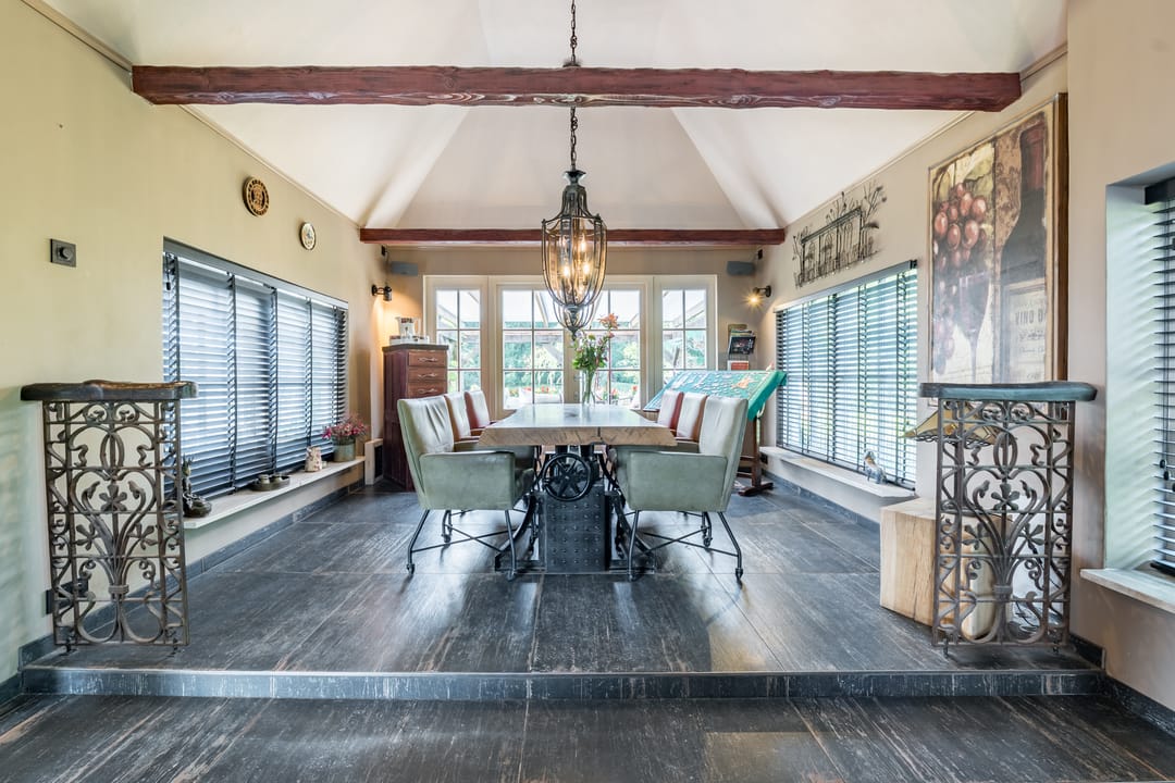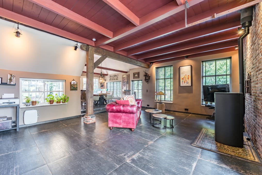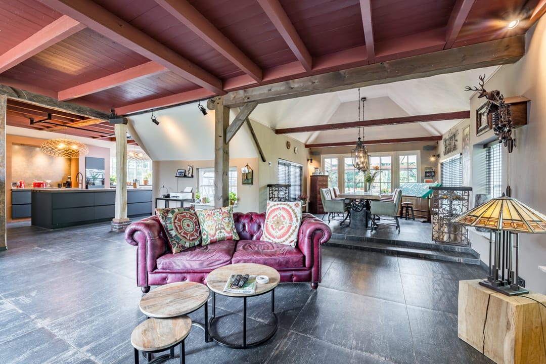 De boerderij is met veel liefde, aandacht en vakmanschap verbouwd. Binnen valt direct de royale, lichte woonkamer op met een karakteristieke gebintconstructie en openslaande deuren naar de tuin. De leefkeuken vormt het hart van het huis – op maat ontworpen en hoogwaardig afgewerkt, met daarnaast een eetgedeelte dat ruimte biedt voor een imposante eettafel voor lange diners of informele bijeenkomsten.