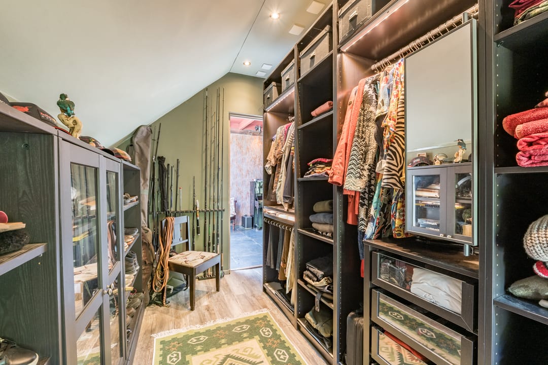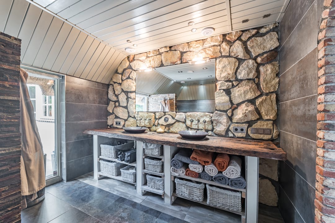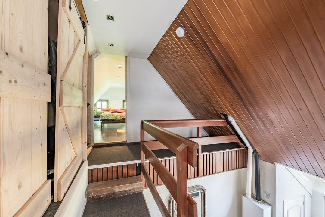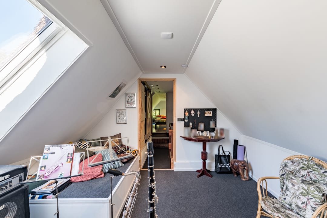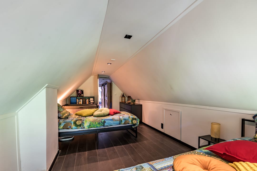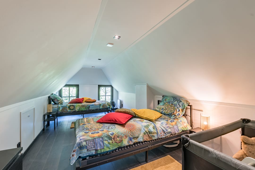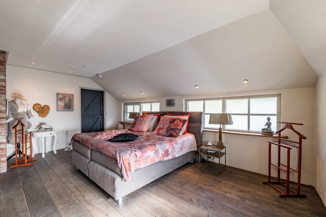 Op de begane grond bevindt zich een riante slaapkamer met luxe badkamer en-suite. Een opvallend detail is het wastafelmeubel, vervaardigd uit oude Franse wagondelen – een stijlvolle combinatie van geschiedenis en eigentijds wooncomfort. Op de verdieping twee ruime slaapkamers, geschikt als slaapvertrek, werkruimte of logeerkamer.