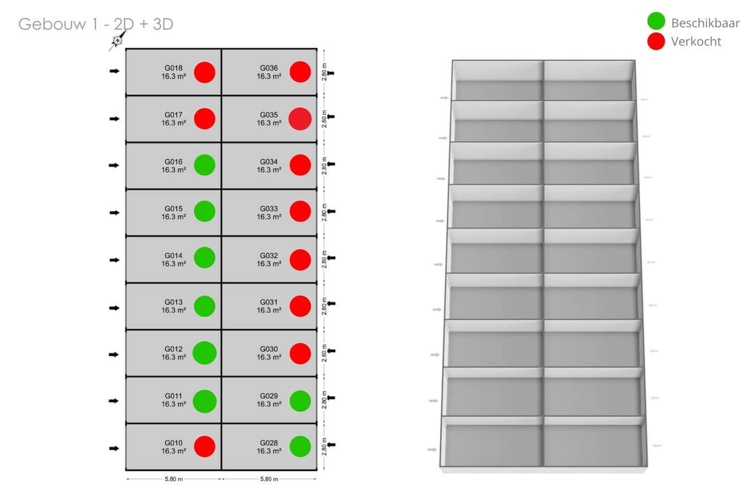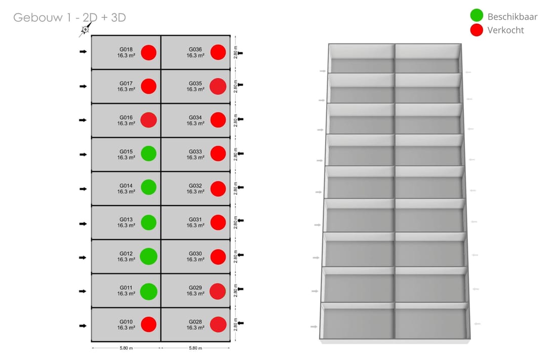 Van de 18 garageboxen zijn er nog een aantal beschikbaar, deze zijn aangegeven op de plattegrond. De garageboxen bieden extra opslagruimte of een plek om uw auto veilig te stallen.