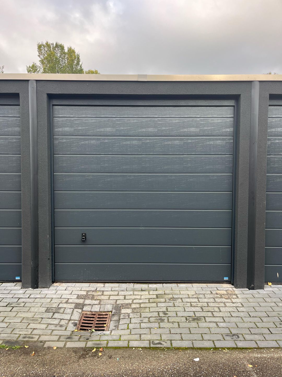 Prefab betonnen garage, betonnen vloer, oppervlaktebelasting tot 350 kg/m2, voertuigbelasting voor voertuigen tot 2,5 ton, bitumen dakbedekking, buitengevel in antraciet pleisterwerk, elektrische sectionaaldeur Hörmann met handzender, elektrische installatie met Led plafondlamp, 1 schakelaar/ stopcontact combinatie.