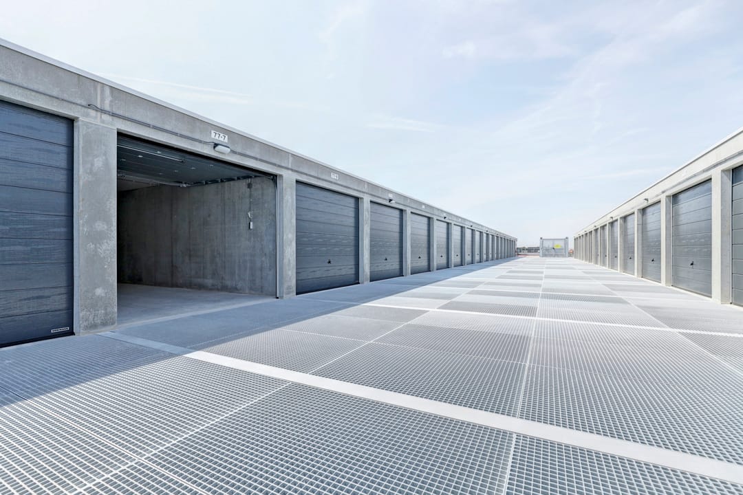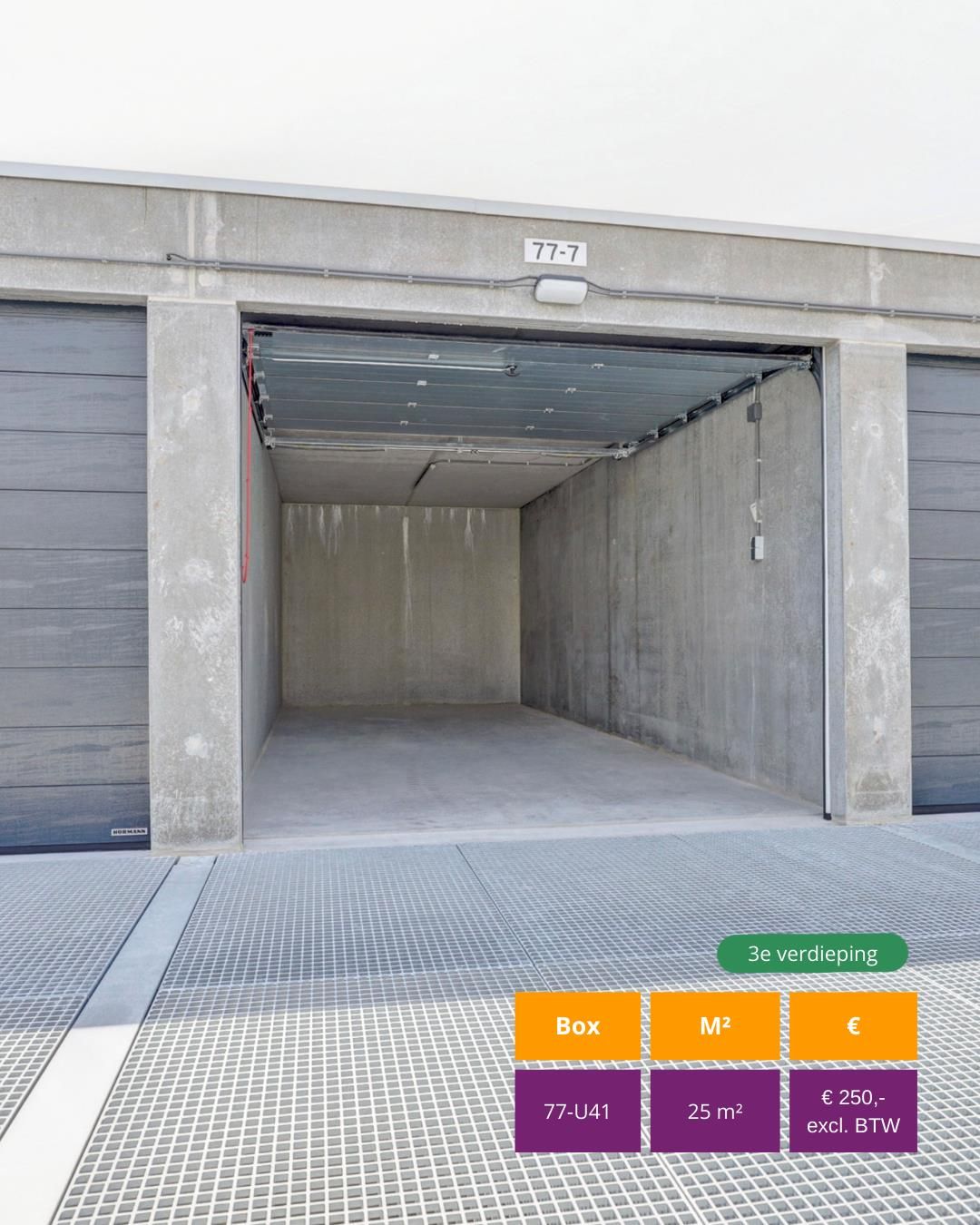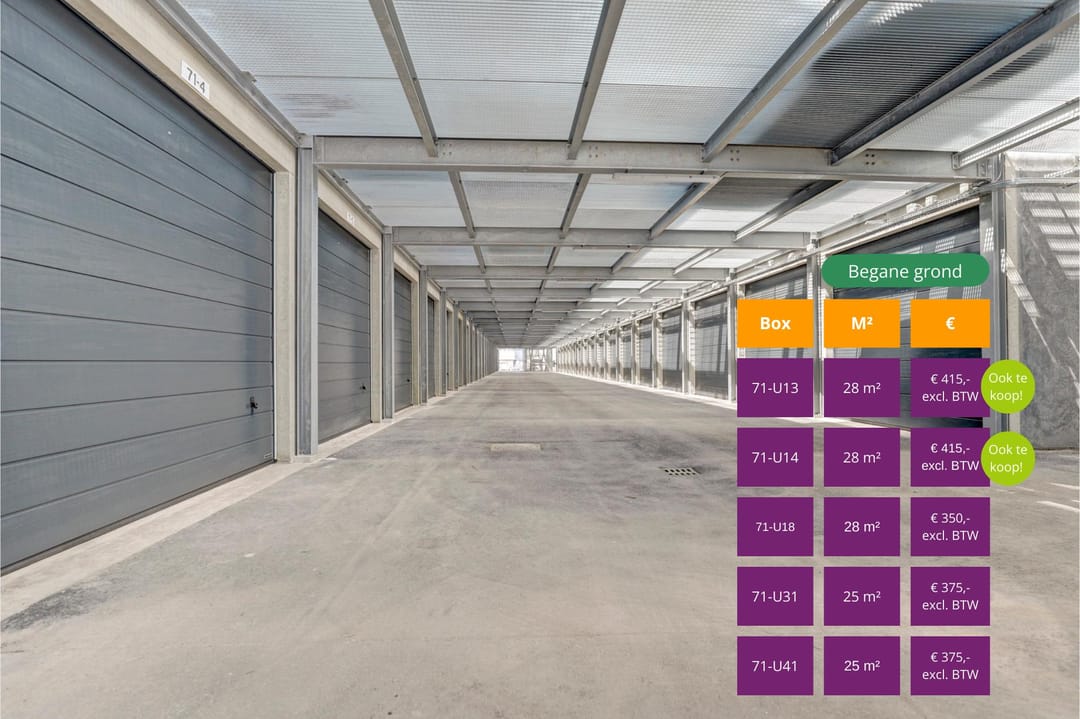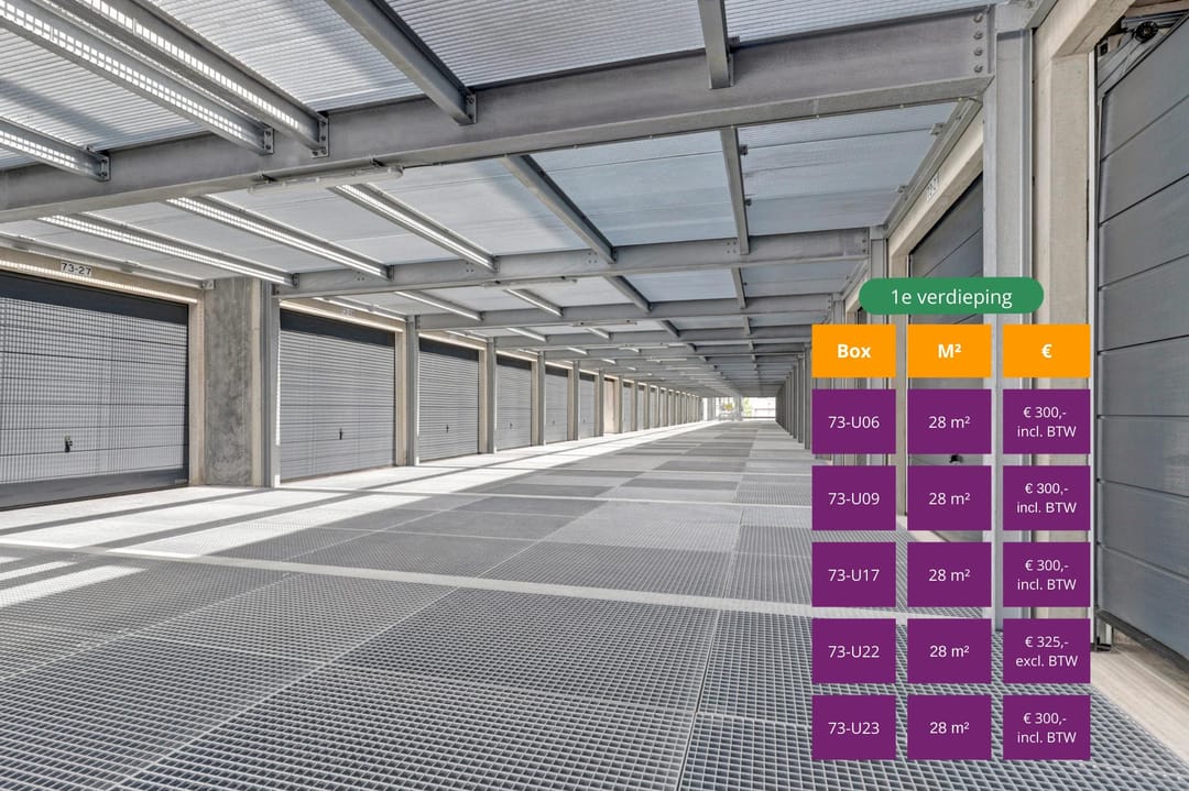 - 73-U09, 28 m², deze box beschikt over een elektrische overhead deur met een loopdeur en 3-puntsluiting.