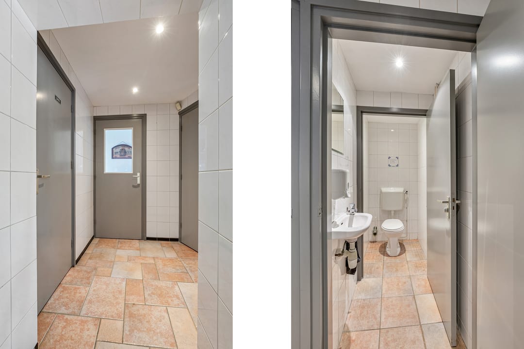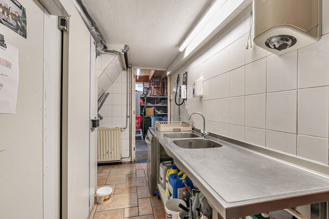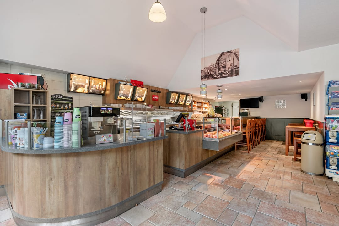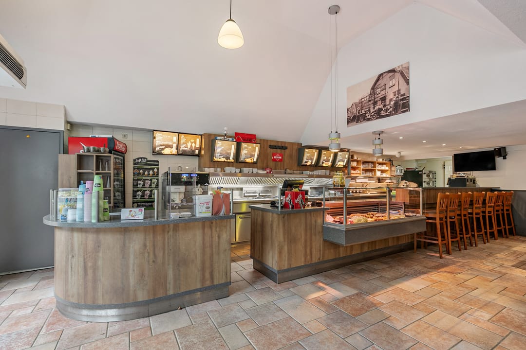 Bij binnenkomst aan de voorzijde betreedt u direct het verkoop- en zitgedeelte, dat is ingericht als cafetaria met een ruime balie en nette afwerking. Achter de verkoopruimte bevindt zich de keuken met professionele apparatuur, waar efficiënt gewerkt kan worden. Aan de achterzijde liggen de opslagruimte en personeelsvoorzieningen, evenals de toiletten voor gasten. Aan de voorzijde bevindt zich een gezellig terras, ideaal voor gasten die willen plaatsnemen in de zon. Direct naast het pand is bovendien een ruim parkeerterrein, wat de bereikbaarheid en het gebruiksgemak aanzienlijk vergroot.