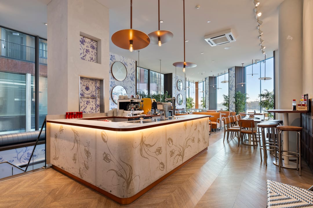 Het ligt pal naast de grote Albert Heijn en tegenover het bekende restaurant Sea Palace. De zaak wordt verder omringt door zowel grote kantoren, zoals dat van Booking.com en Tomtom, sportschool, de Openbare Bibliotheek, Conservatorium en een groot aantal woningen en winkels zoals de mediamarkt. Bovendien is het strategisch gelegen op de route van het station naar Nemo, wat zorgt voor een constante stroom van toeristen, bewoners en zakelijke bezoekers.