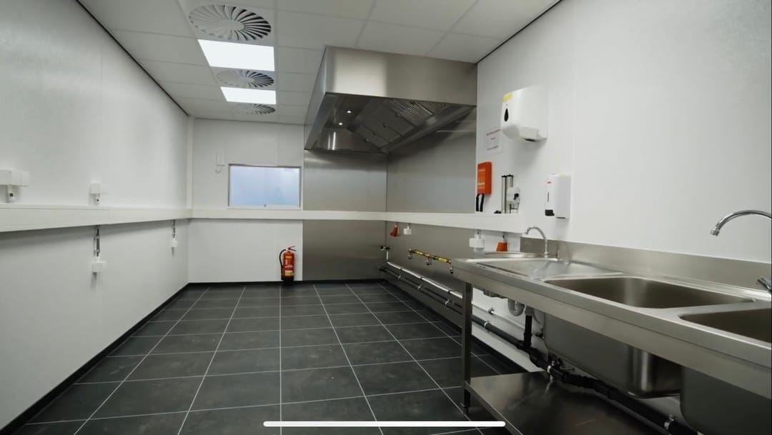 - Inclusief: Afzuiging (2.640 m3/h), spoelbak, airco
