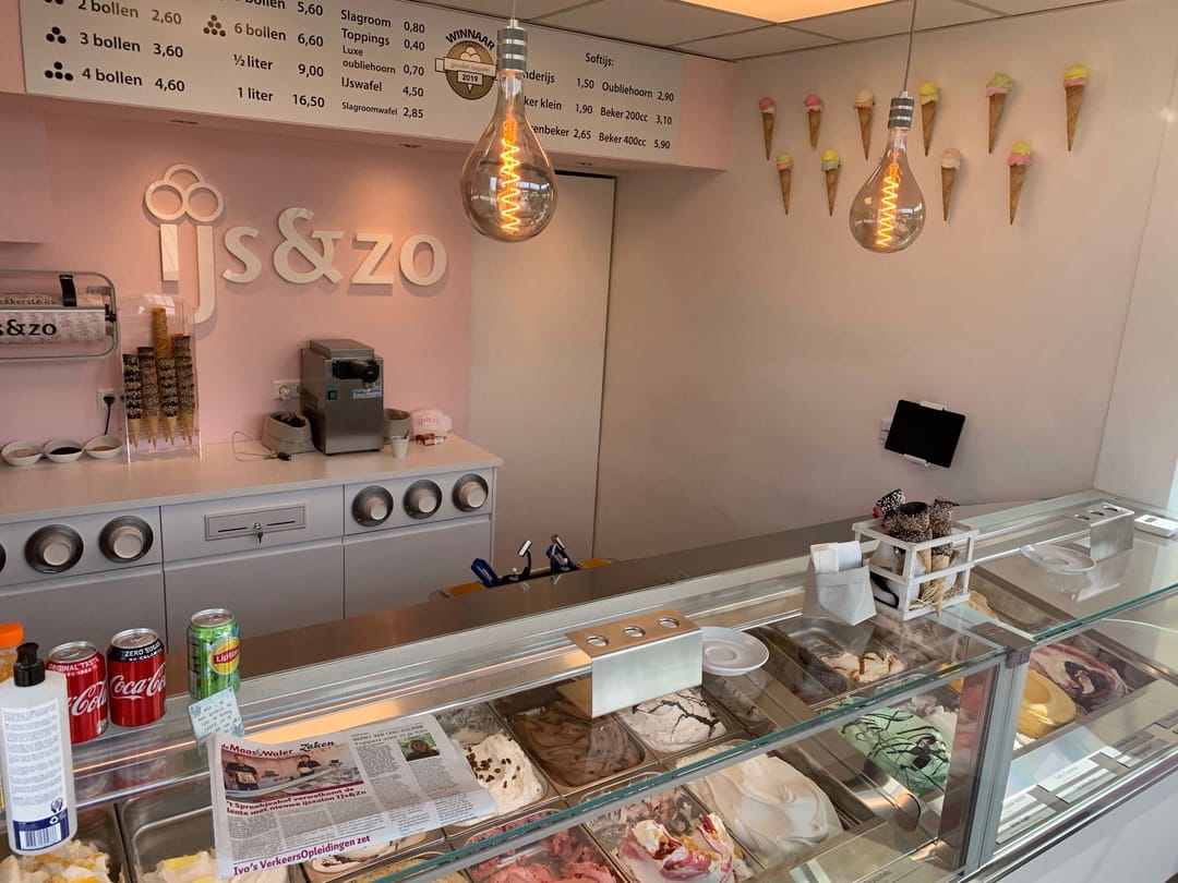 De IJssalon is toegankelijk middels een ingang aan de zijkant. De keuken is centraal gelegen in het pand en beschikt over een spoelkeuken en opslagruimte met koel-vriescel. Er is een zeer ruime kelder aanwezig. Op de 1e verdieping is een woning welke apart verhuurd wordt en niet tot het gehuurde behoort.