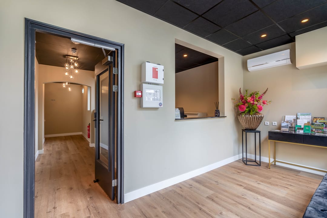 Smaakvol ingerichte hal/entree met receptie, airconditioning, fraaie pvc-vloer en meterkast. Via de gang met trapopgang zijn de kamers op de verdieping bereikbaar. Op de begane grond bevinden zich drie hotelkamers.