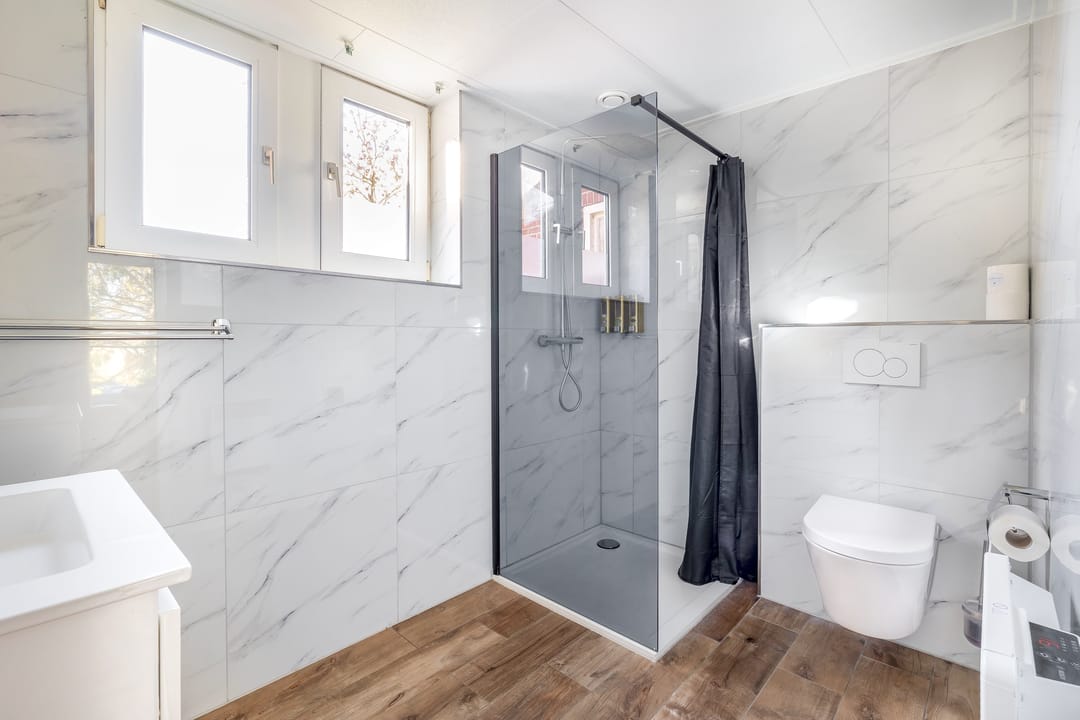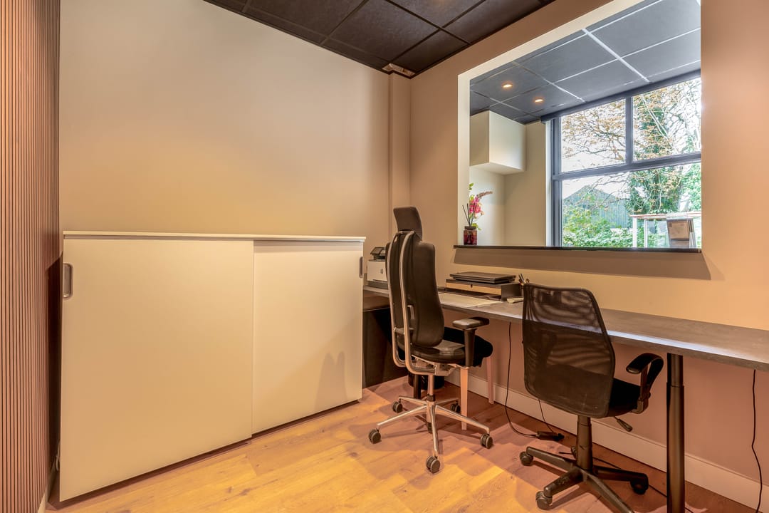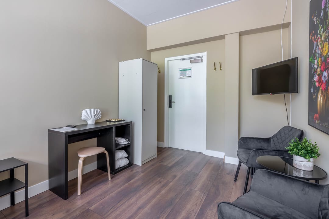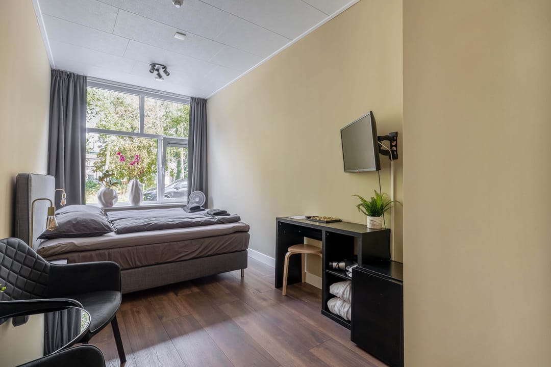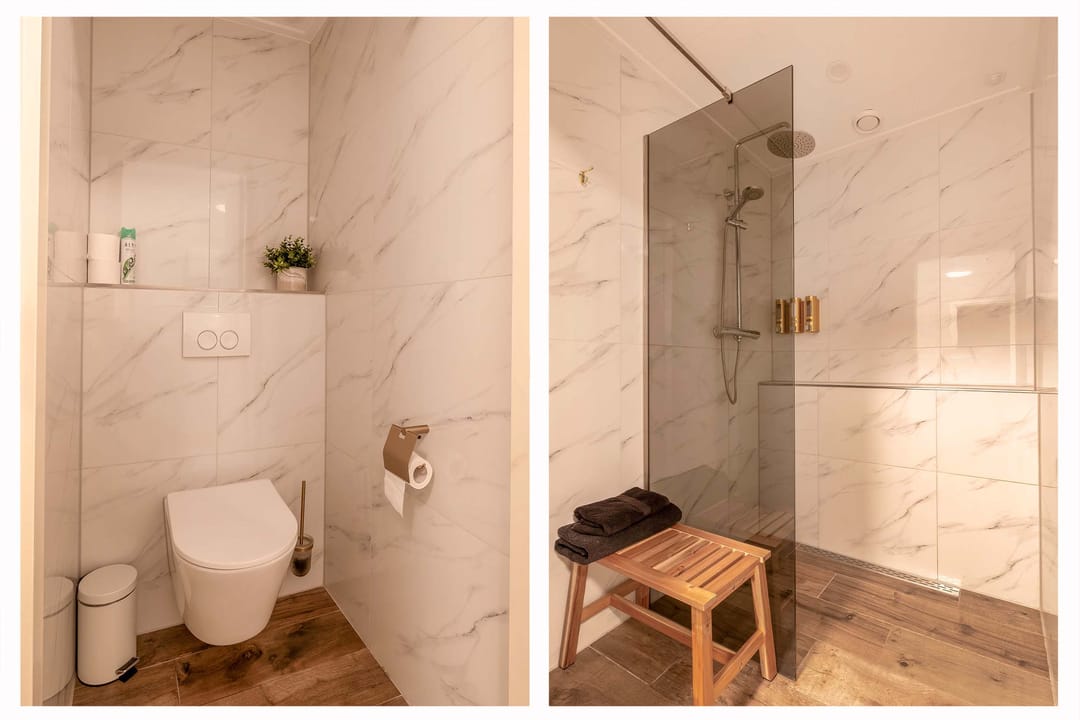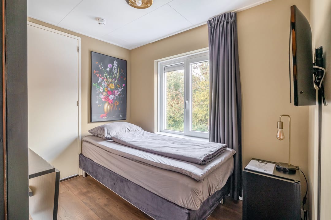 Twee smaakvol ingerichte eenpersoonskamers met bed, kast en stoel. De kamers zijn uitgerust met airconditioning, koelkast, smart tv en een moderne laminaatvloer. De badkamer is voorzien van een douchecabine, wastafelmeubel en wandcloset.