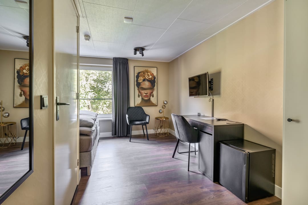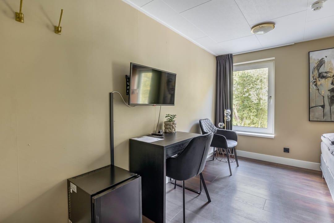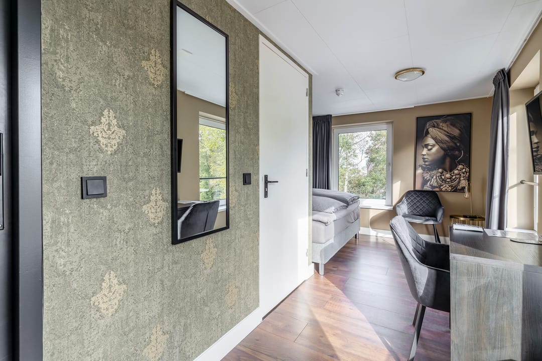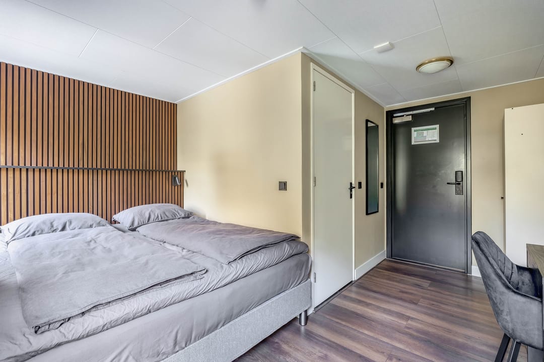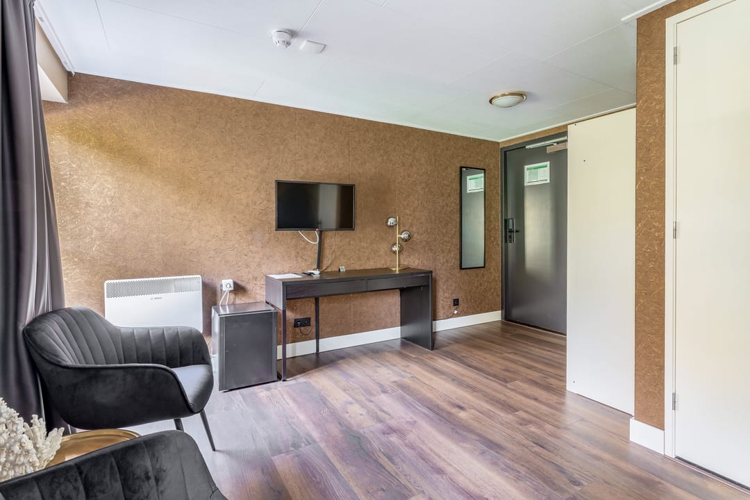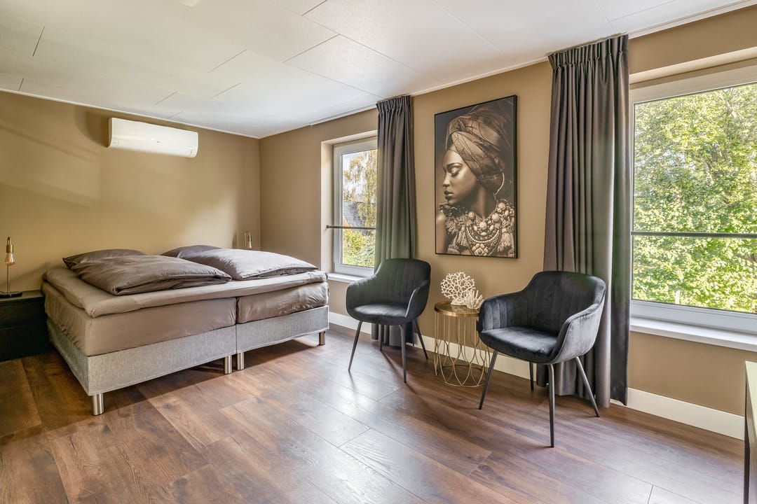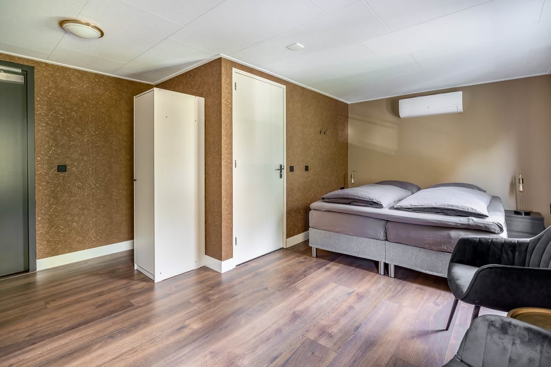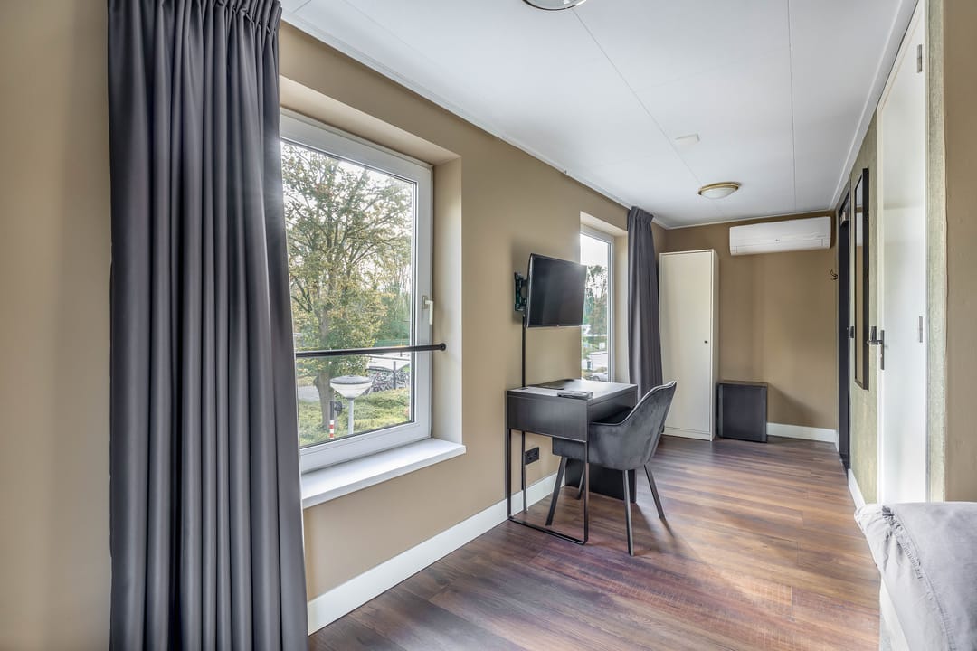Deze ruime en stijlvol afgewerkte tweepersoonskamer beschikt over nachtkastjes, een zitgedeelte met twee stoelen en een bureau. Voorzien van smart-tv, koelkast, airconditioning en een hoogwaardige laminaatvloer. De moderne badkamer is uitgerust met een douchecabine, wastafelmeubel en wandcloset.