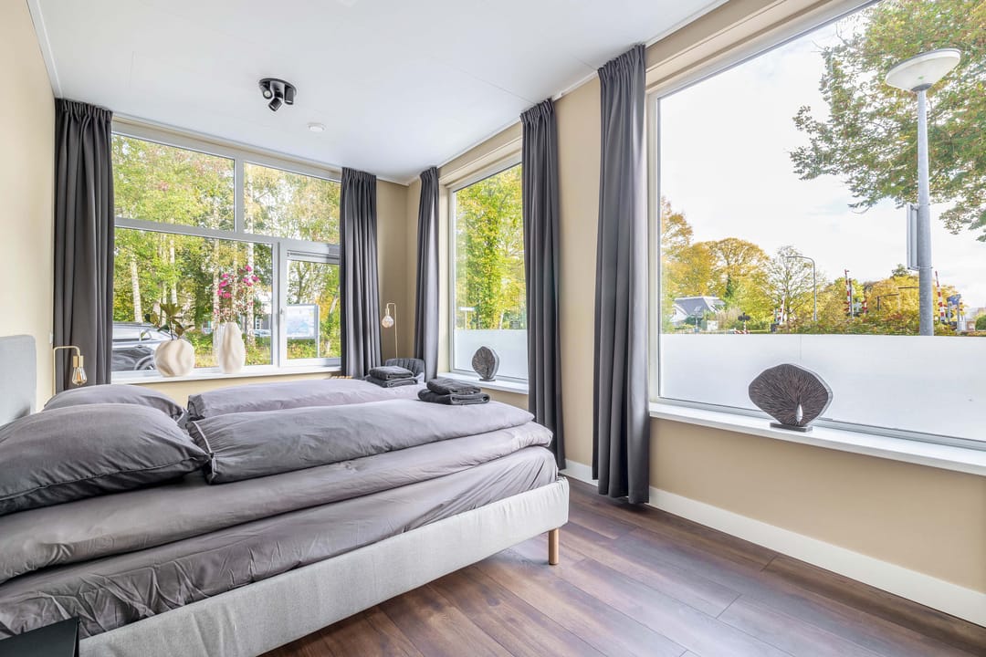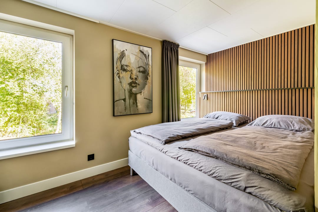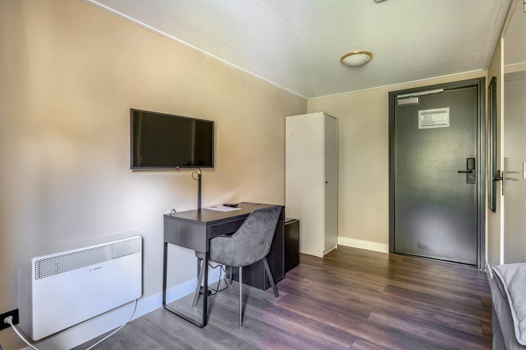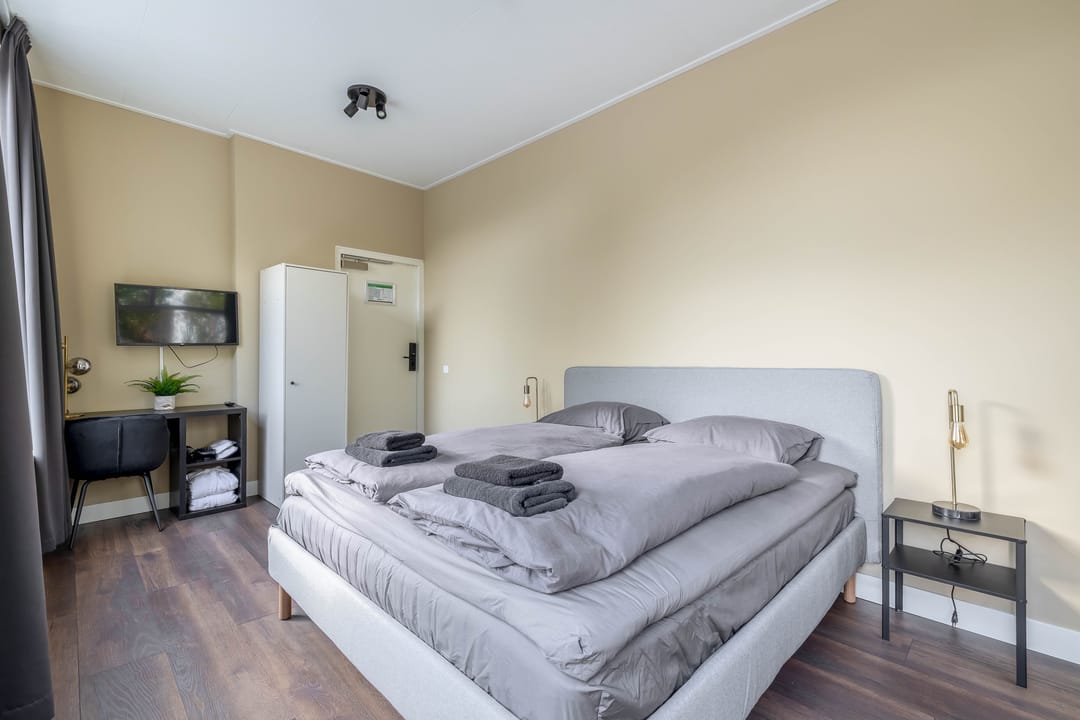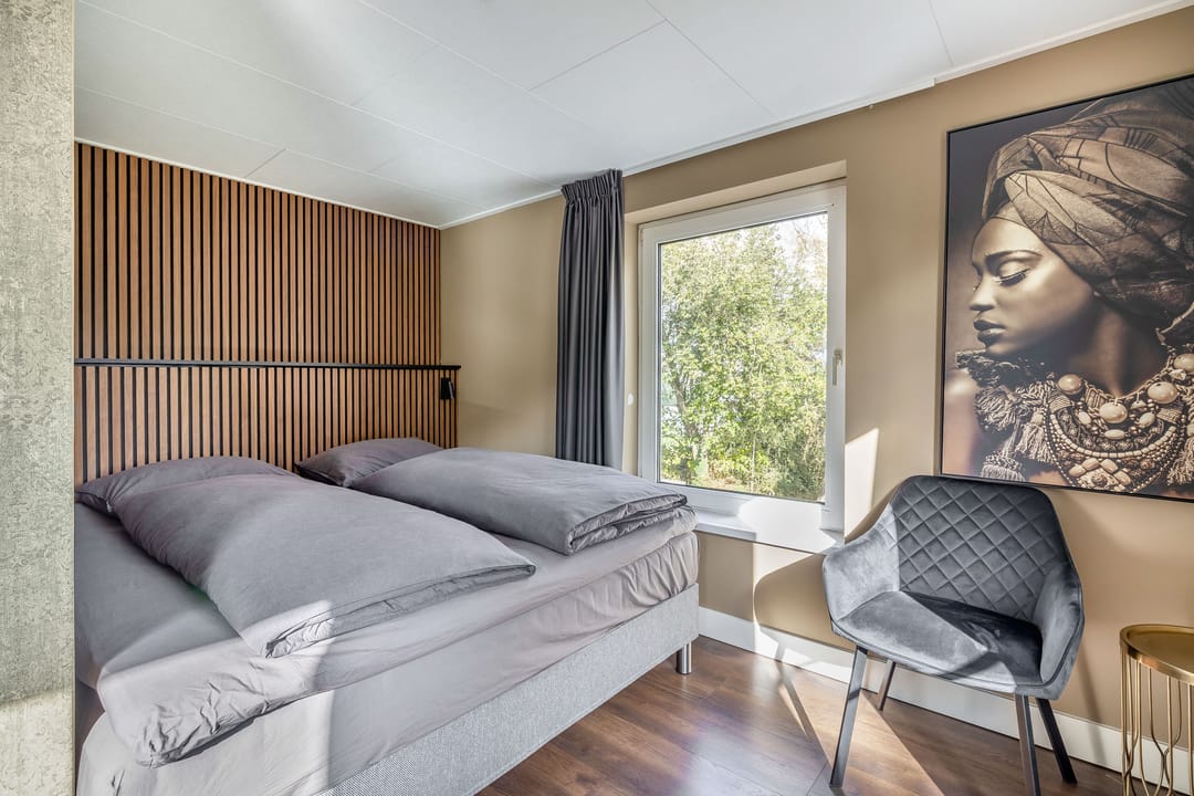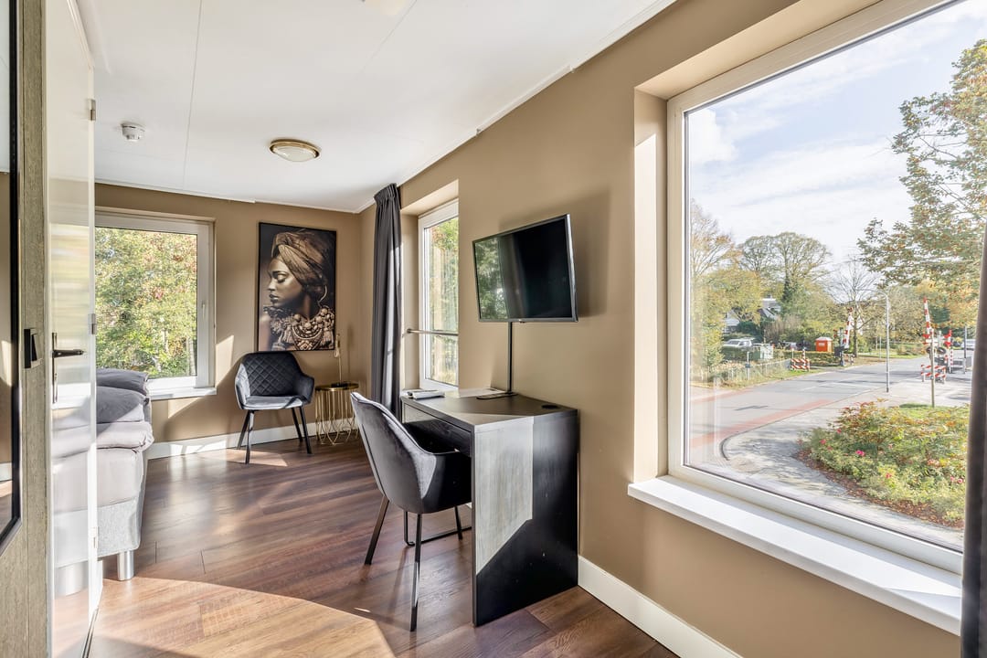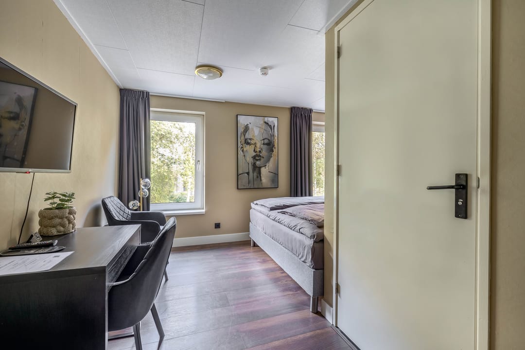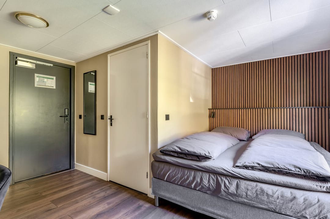 Deze ruime en stijlvol afgewerkte tweepersoonskamer beschikt over nachtkastjes, een zitgedeelte met twee stoelen en een bureau. Voorzien van smart-tv, koelkast, airconditioning en een hoogwaardige laminaatvloer. De moderne badkamer is uitgerust met een douchecabine, wastafelmeubel en wandcloset.