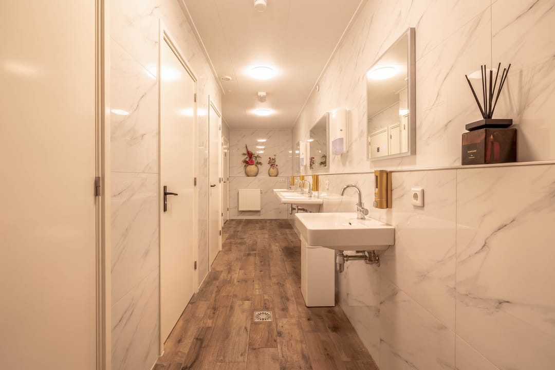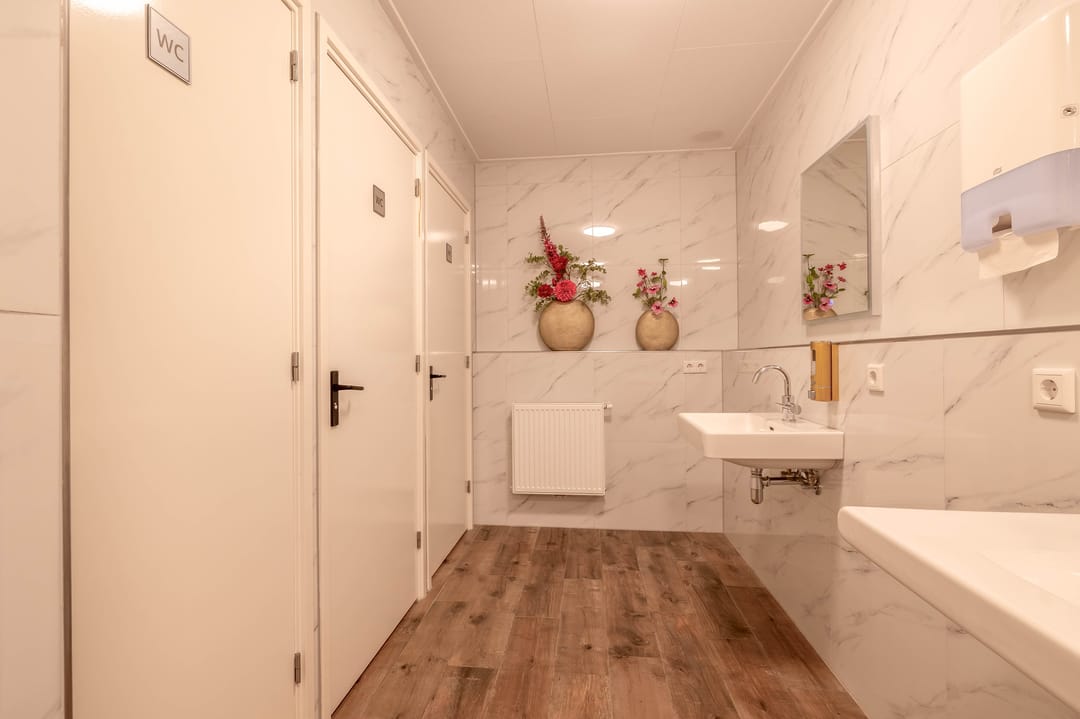 De drie kamers op de begane grond maken gebruik van stijlvol eigen sanitair, gelegen op de gang. Hier bevinden zich drie moderne doucheruimtes, drie wandclosets en vier wastafels, allemaal hoogwaardig en smaakvol afgewerkt