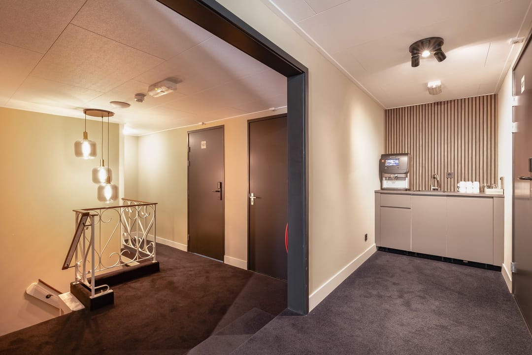 Op de overloop bevindt zich een elegante pantry met koffieapparaat voor optimaal gastencomfort. Vanuit deze ruimte zijn zeven verzorgde hotelkamers bereikbaar.