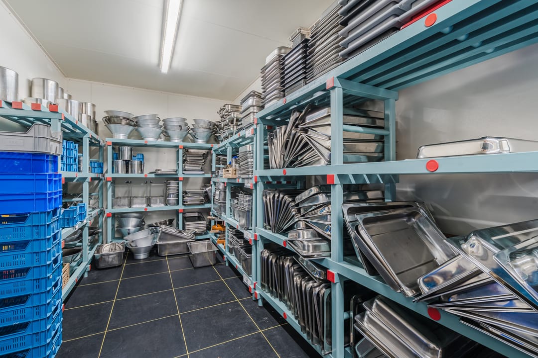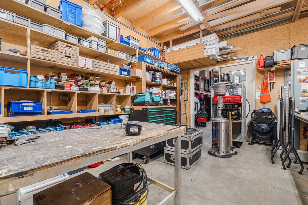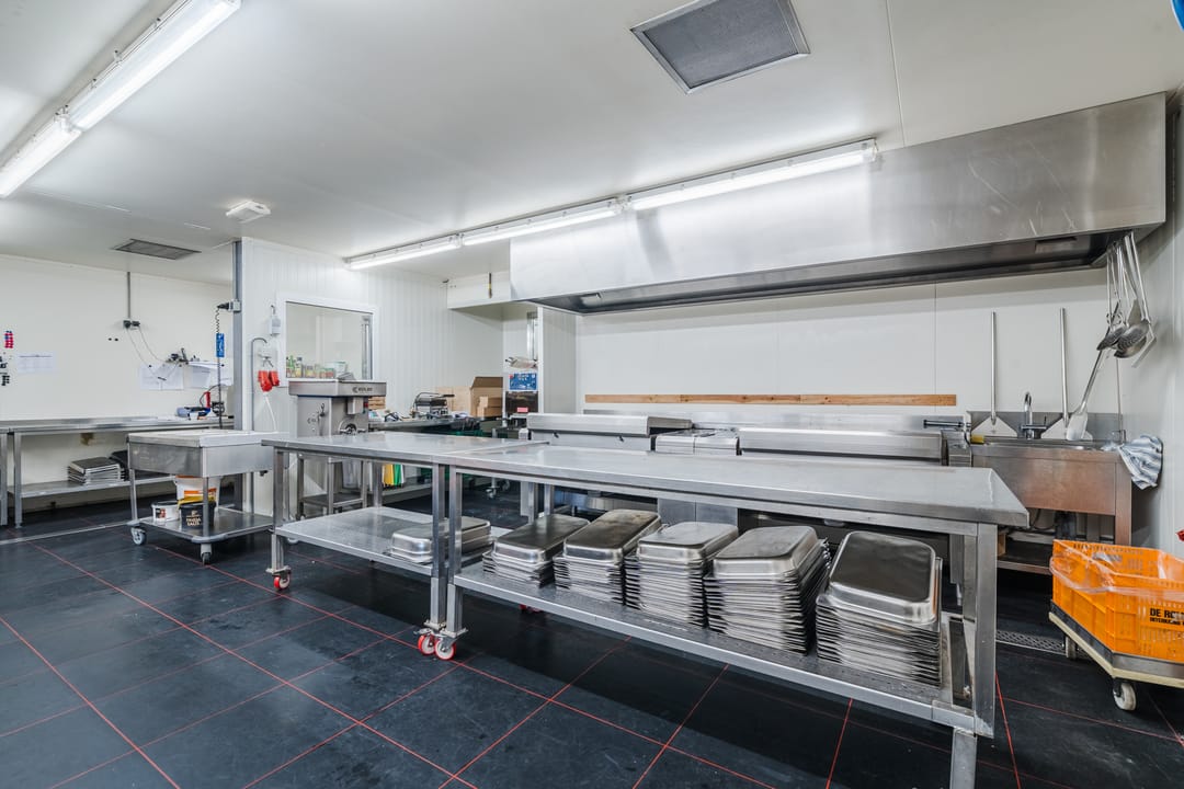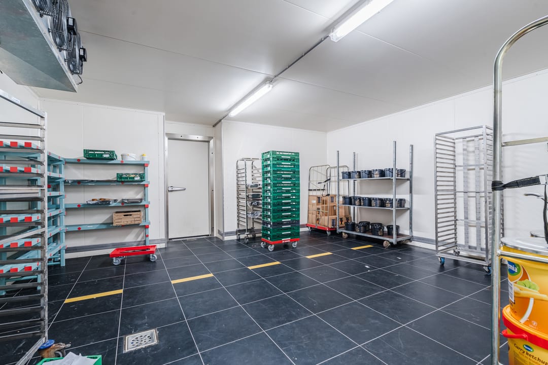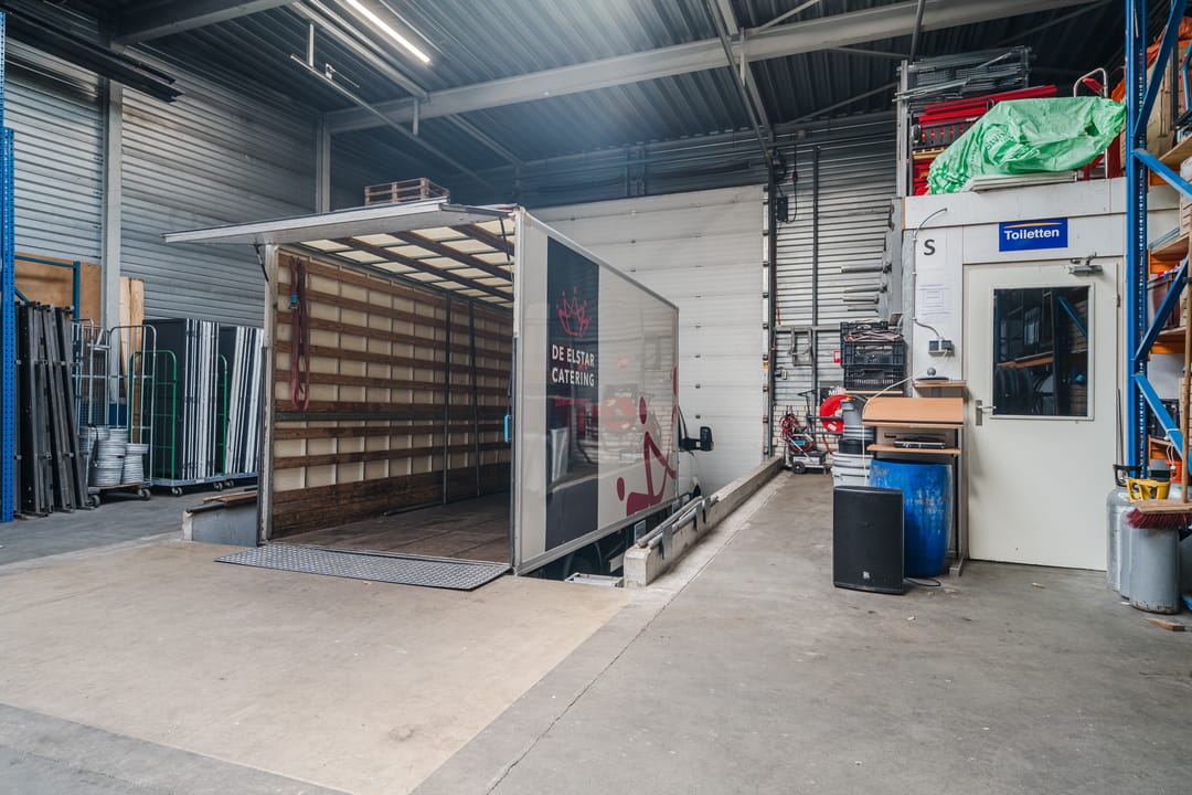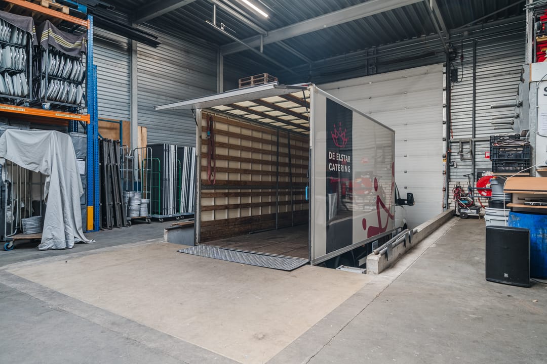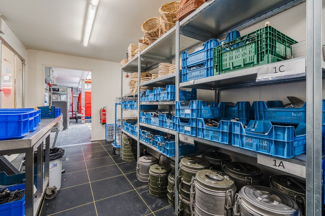 - Een royale loods voor opslag van materialen, benodigd voor grootschalige cateringopdrachten of voor de verhuur.