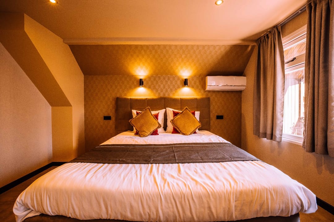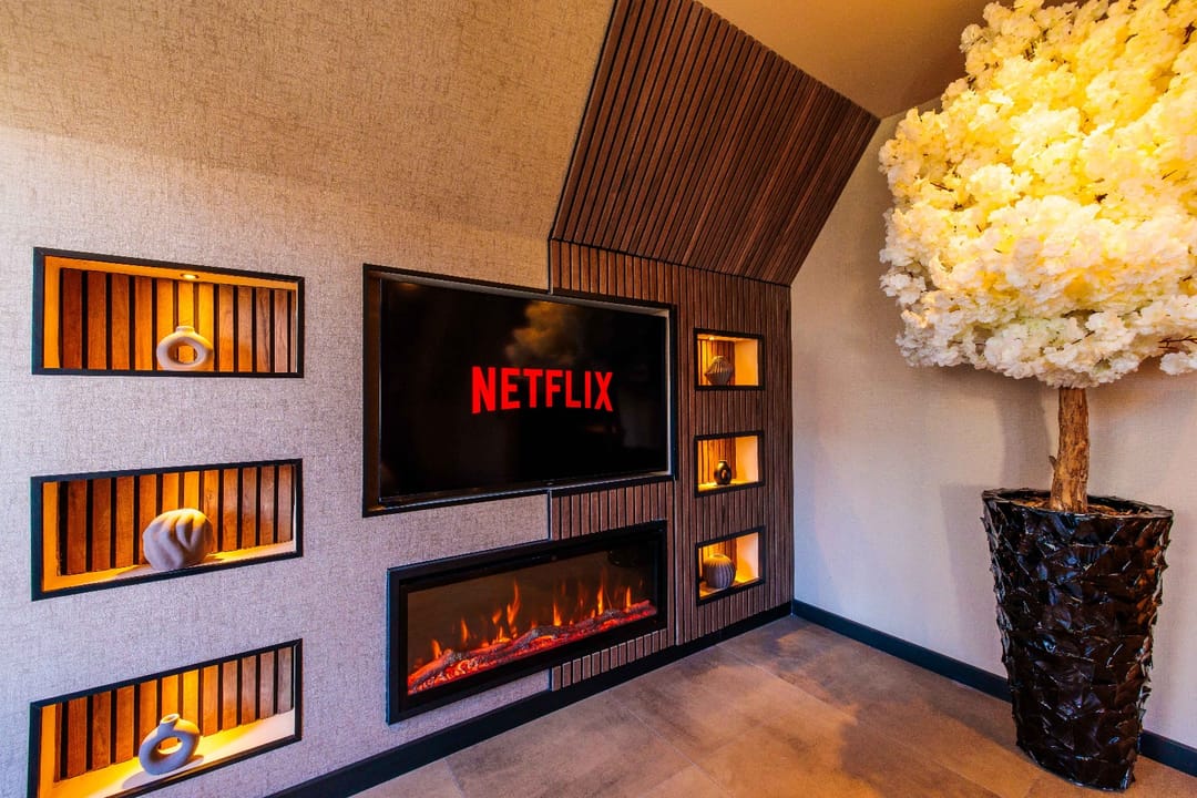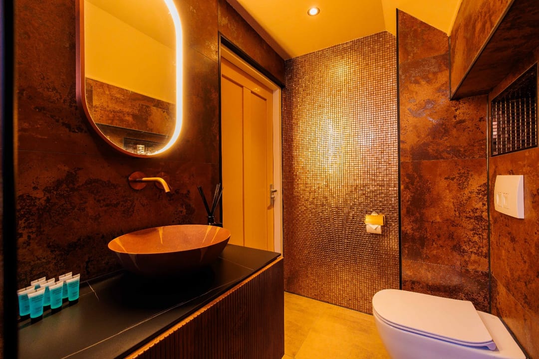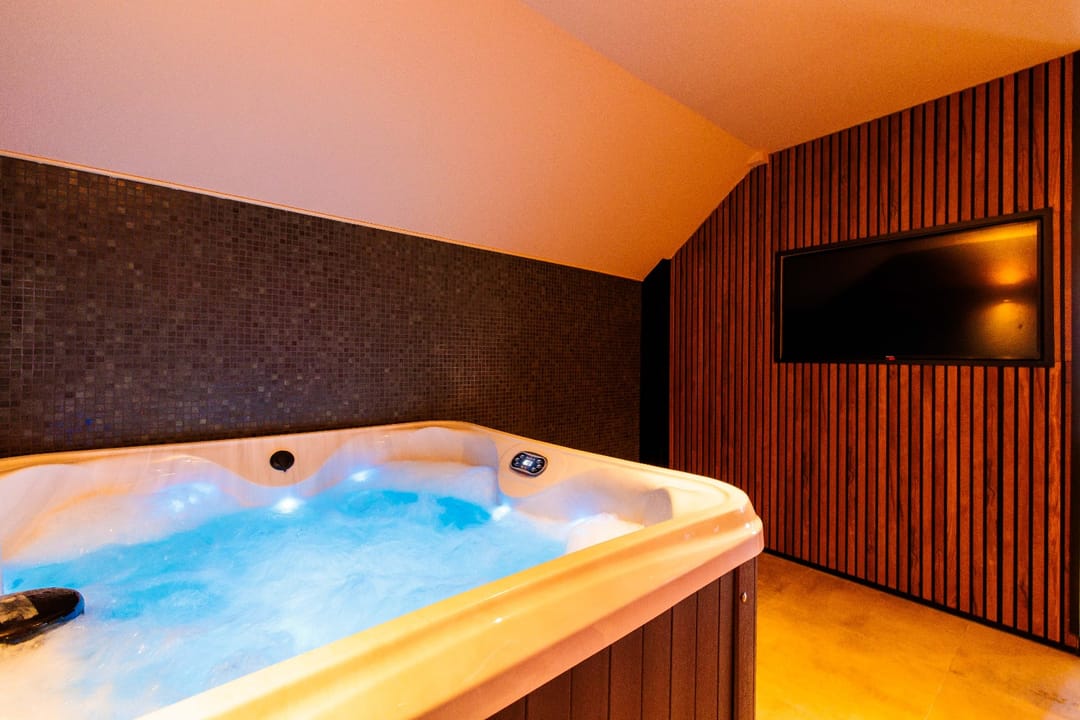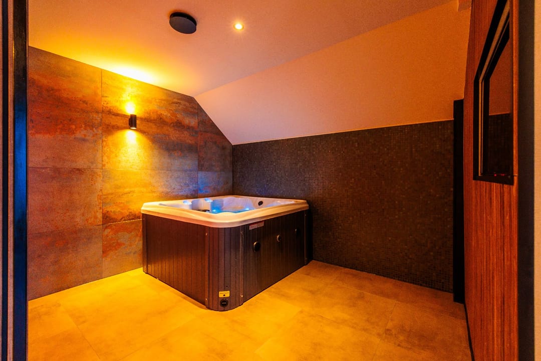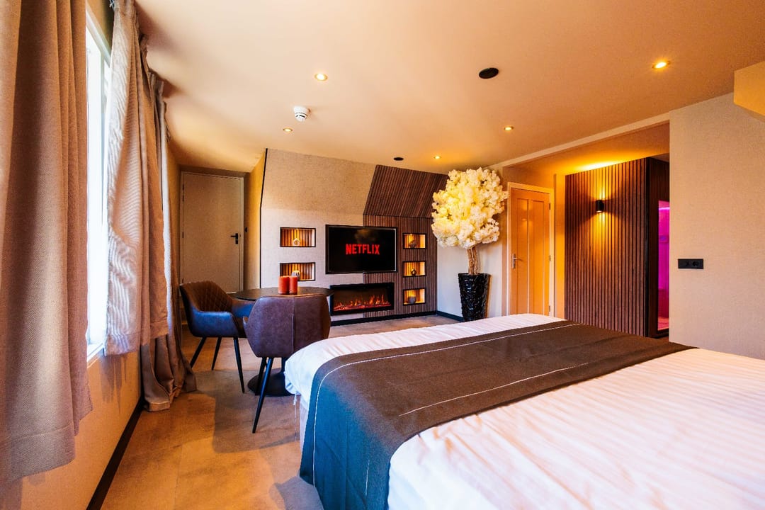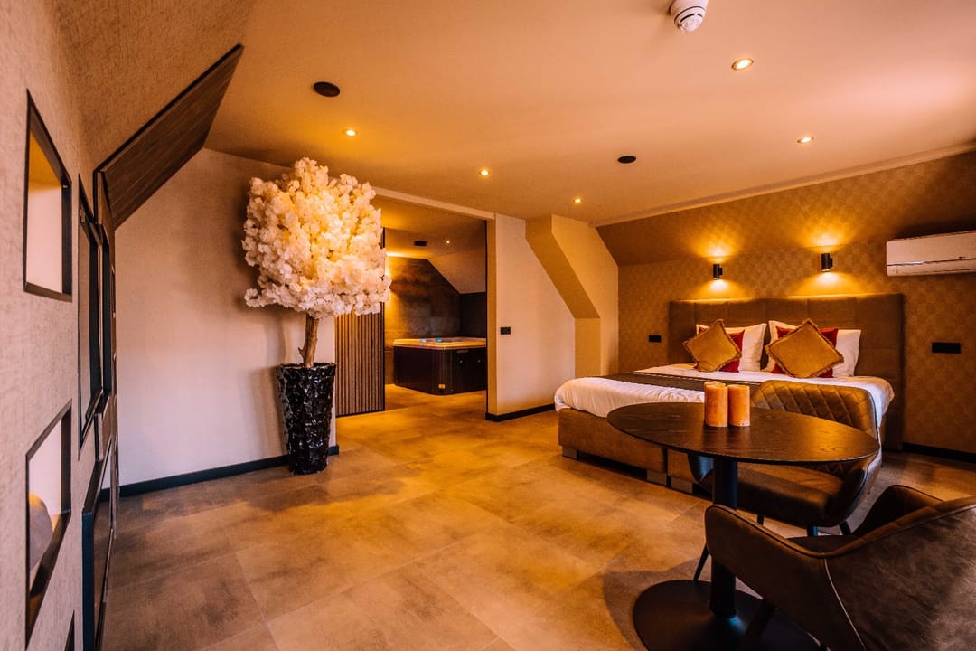 “Opkamer” met toegang naar balkon; airco; luxe badkamer met inloopdouche, wastafel in meubel, zwevend toilet; luxe wellnessruimte met sauna en whirlpool. Finse sauna met (8-kleuren) verlichting. Whirlpool met jets/massage en (5-kleuren) verlichting.