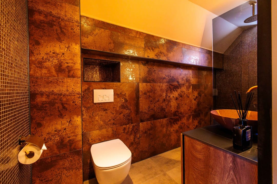 “Rustkamer” airco; keukenblok met koelkast; luxe badkamer met hoekdouchecabine, wastafel in meubel, zwevend toilet en handdoekradiator.