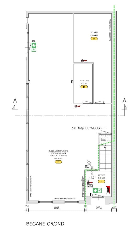 Hal/entree met meterkast, trapopgang en toegang naar restaurant; restaurant (bereikbaar via voor- en zijkant) met bar, trapkast en openslaande deuren; toiletruimte met wastafel en toiletgroep (dames- en herentoilet); royale keuken met diverse inbouwapparatuur: diepvries, koelkasten, 6-pits gaskookplaat, brander, afzuigkap en close-in boiler; koelcel en c.v. ketelruimte.