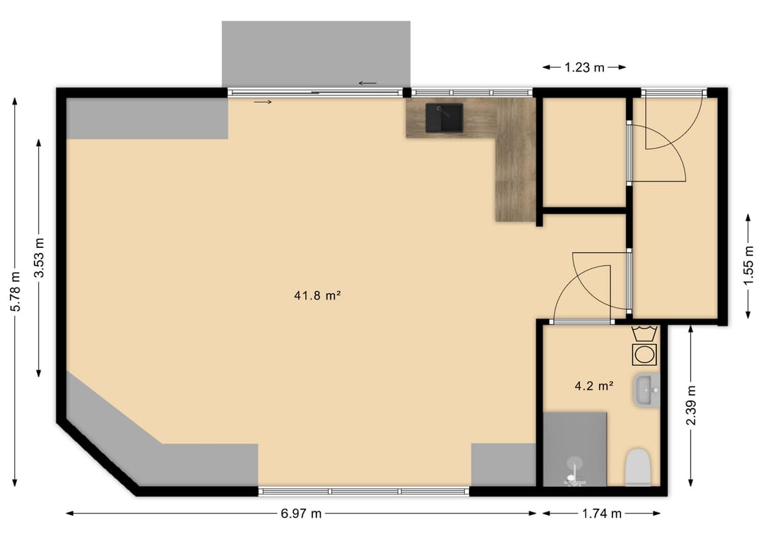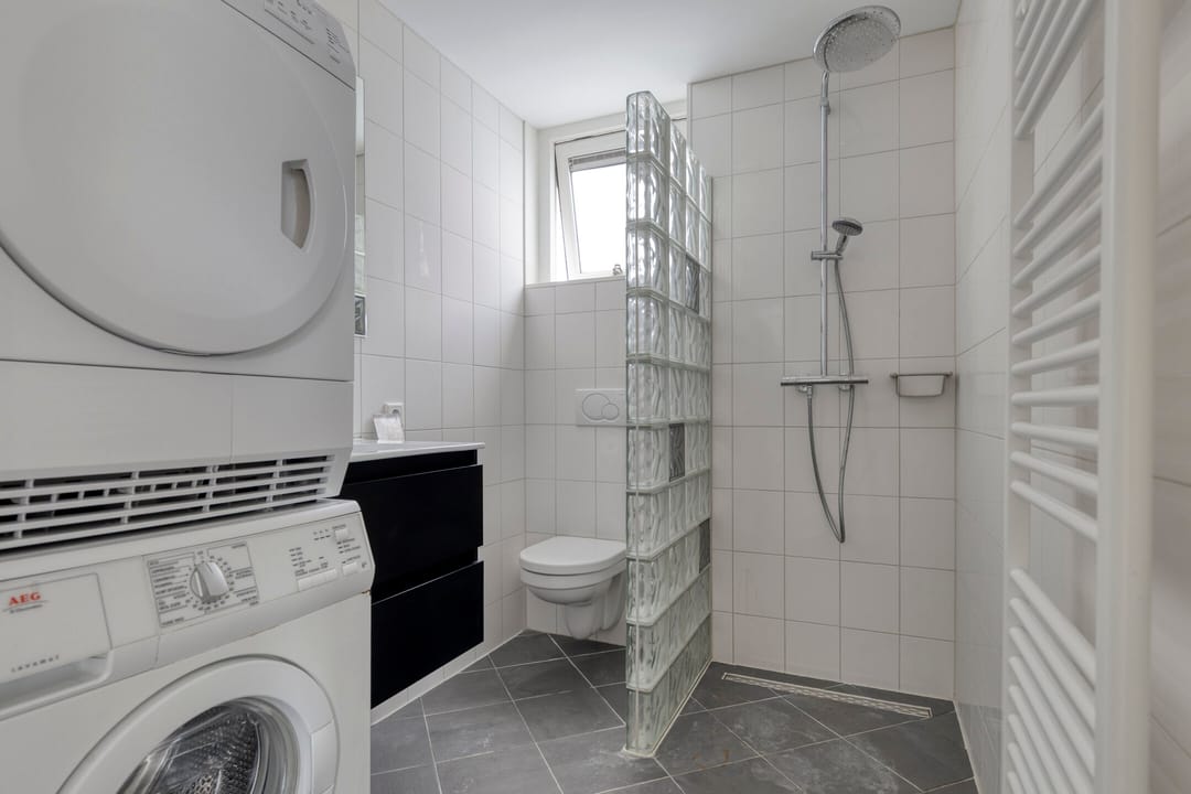 Het bovengelegen zelfstandige bedrijfsappartement (41,8 m²) beschikt over eigen voorzieningen, waaronder een keuken en een badkamer met wasmachine en droger. Separate aansluitingen voor gas, water en elektra zijn aanwezig.
