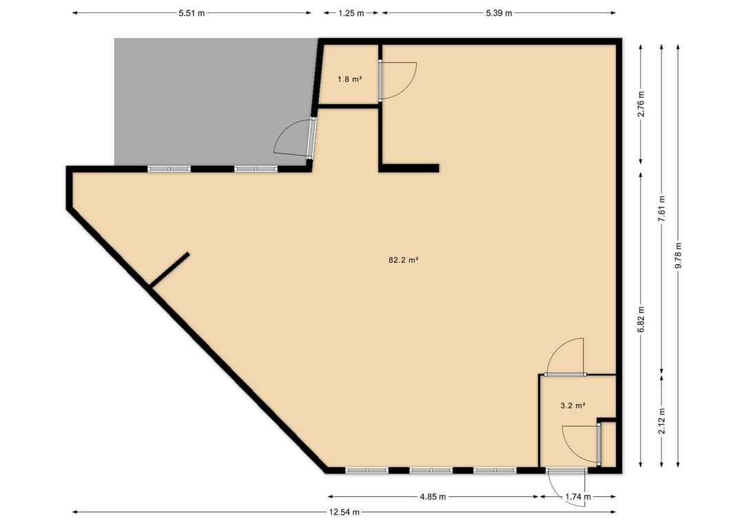 De begane grond (82,2 m² BVO) betreft een open, casco ruimte met een hoofdentree aan de Burgemeester Mooijstraat en een secundaire entree aan de Dorpsstraat. De ruimte is vrij indeelbaar naar wens. Aan de achterzijde is een overkapt buitenterrein van circa 13 m² aanwezig.