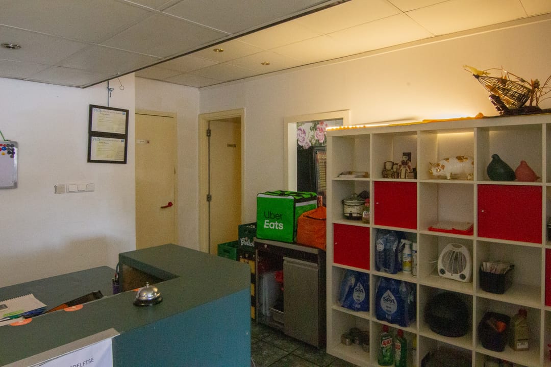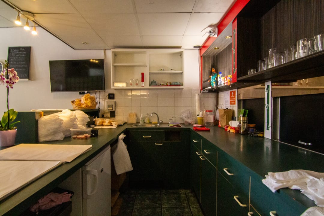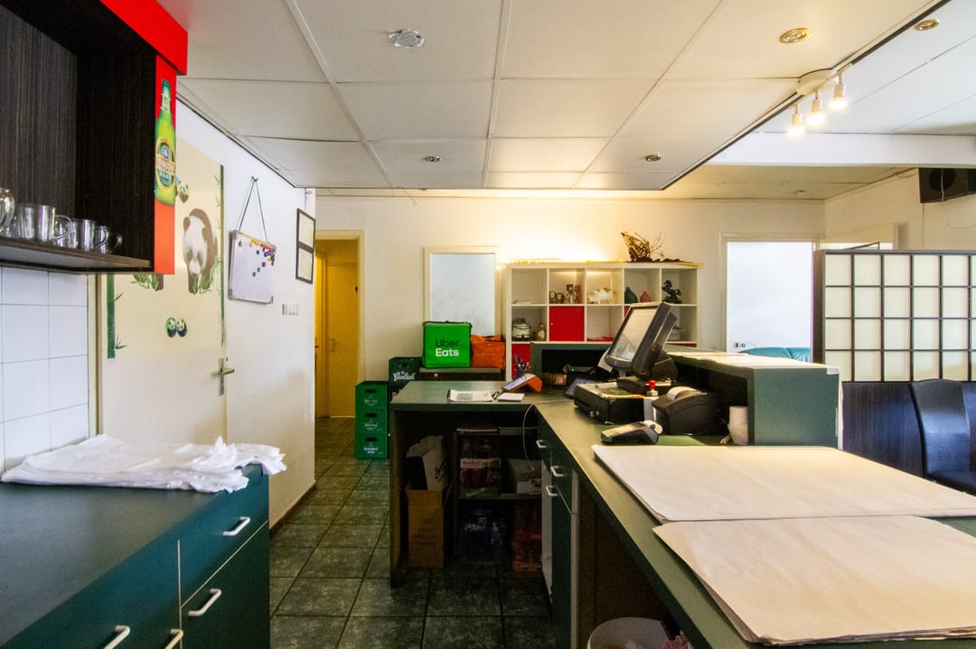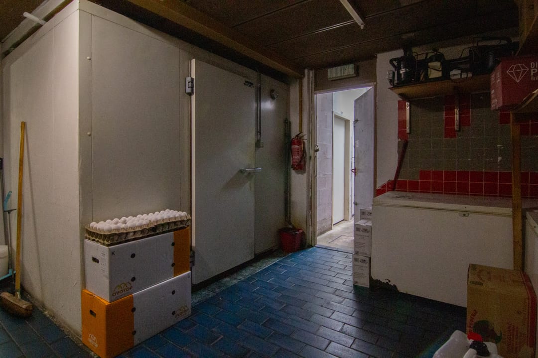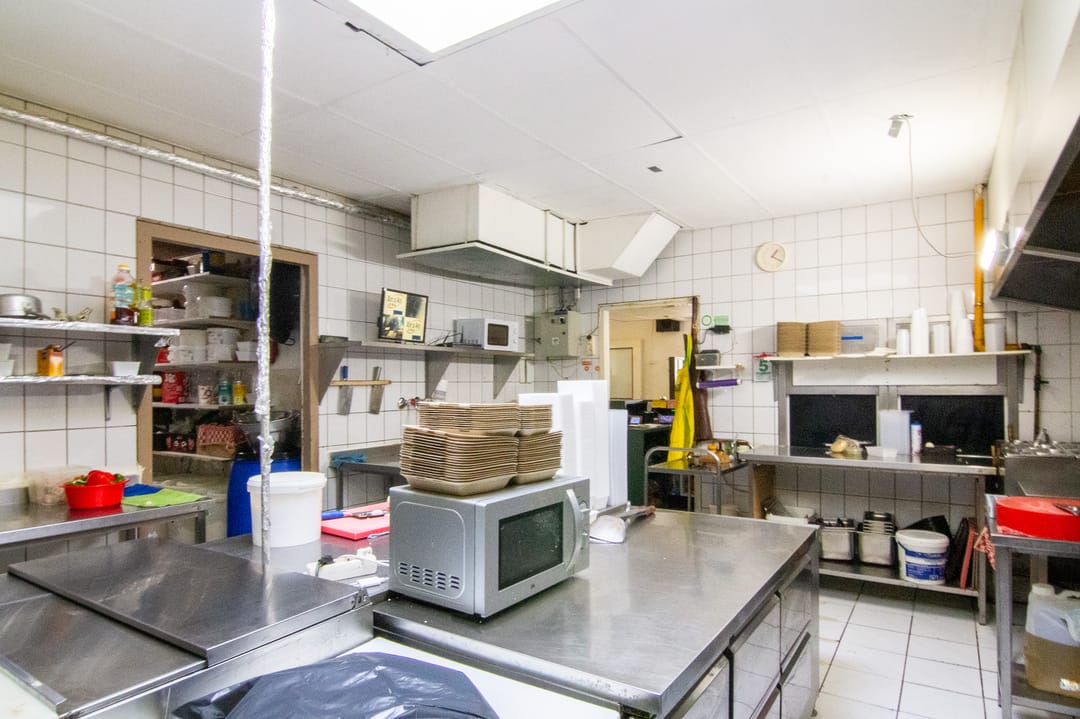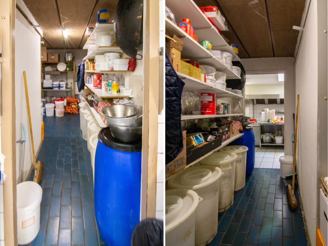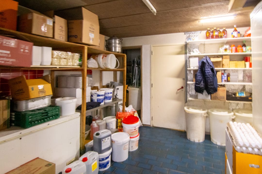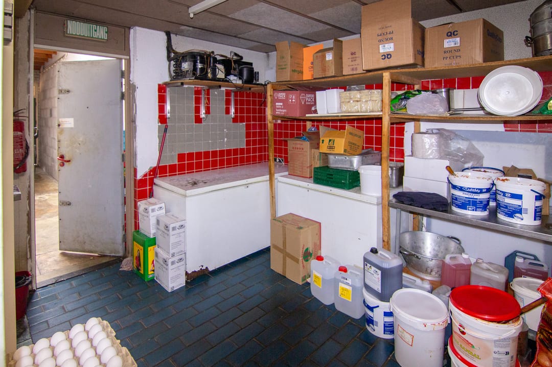 Achter de toonbank bereik je de keuken. Vanuit de keuken kan je naar de opslag waar ook een koelkast aanwezig is. Tevens vind je hier ook de achteruitgang.