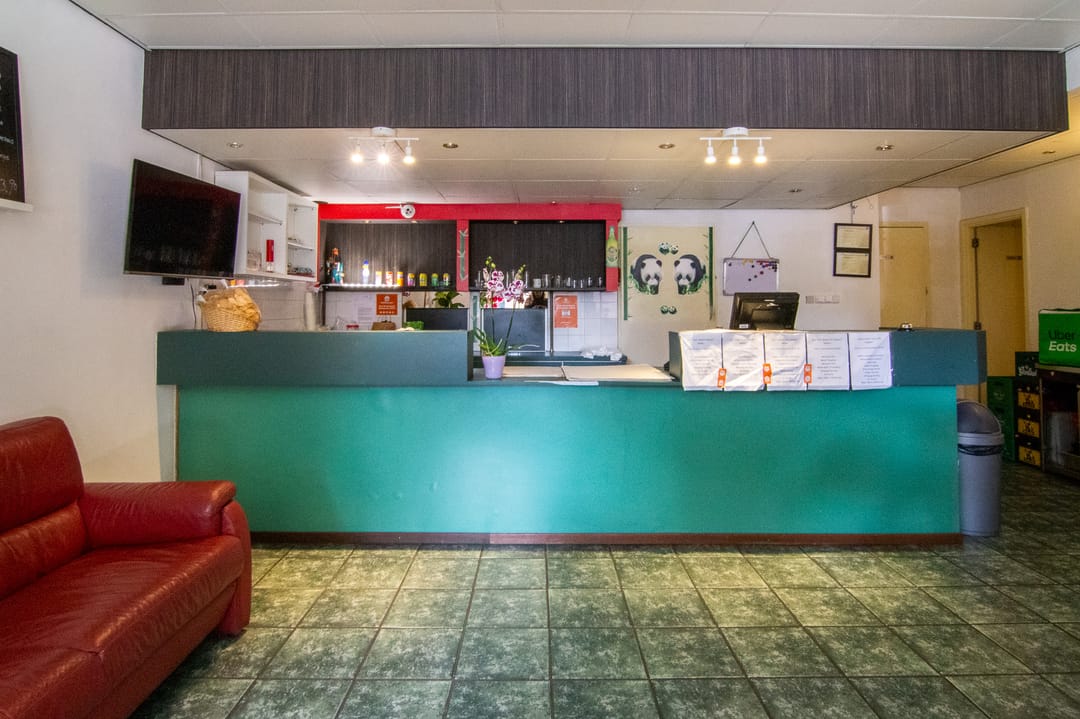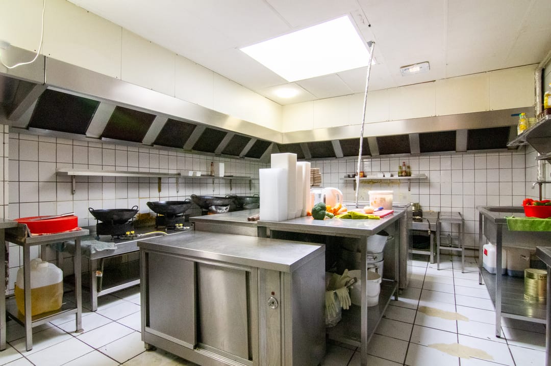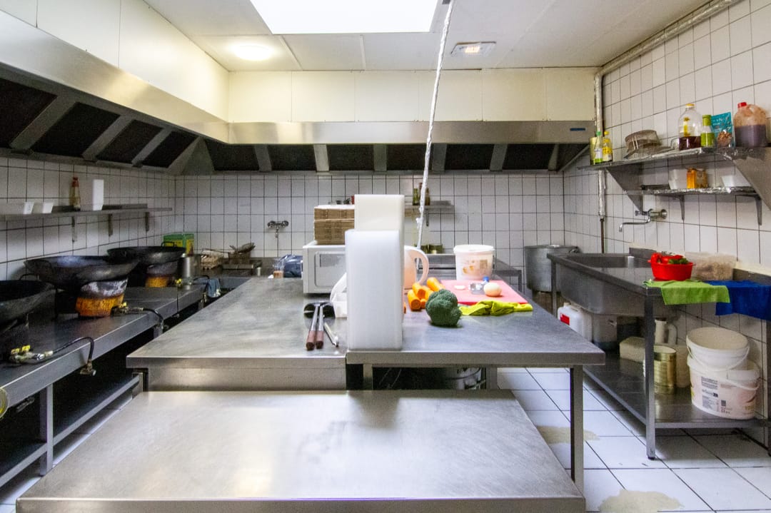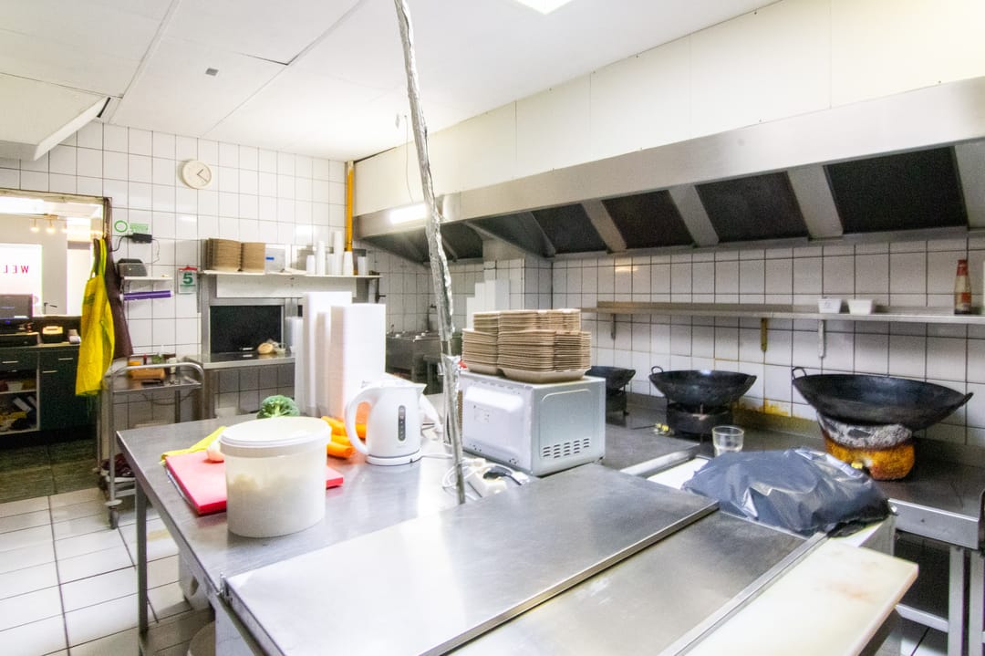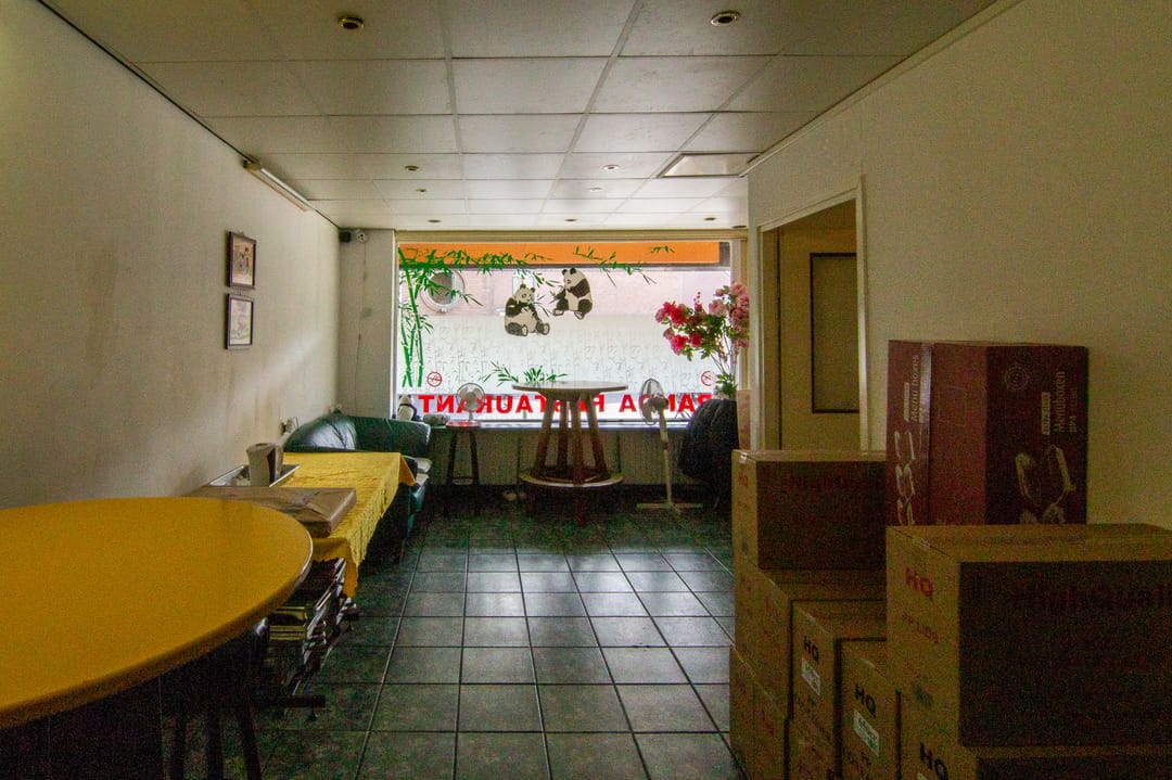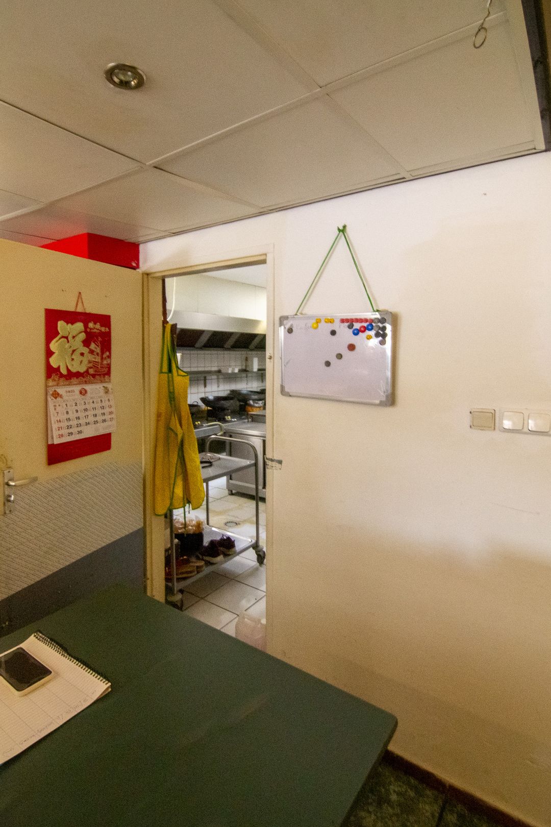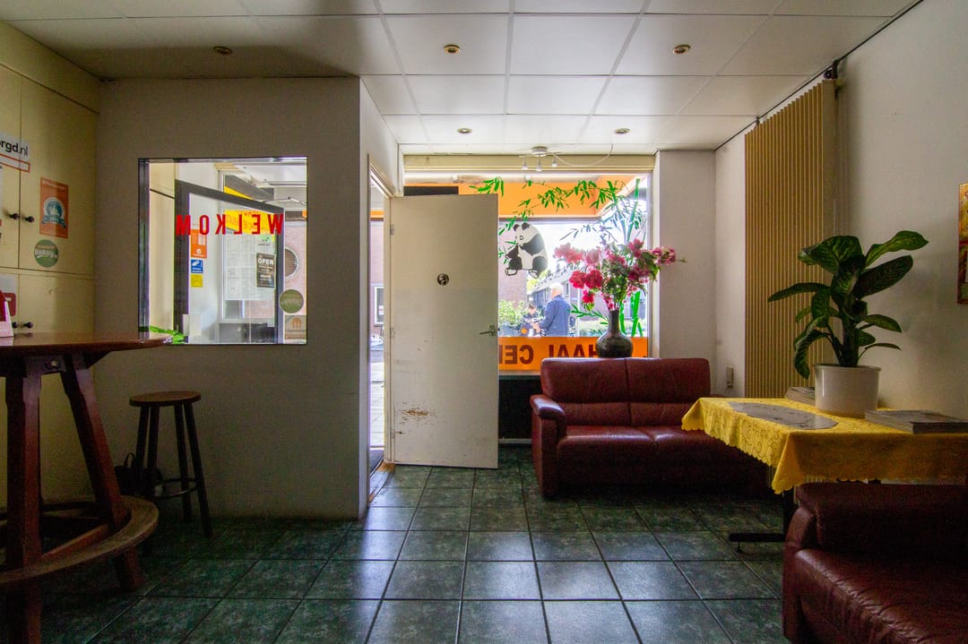 Achter de toonbank bereik je de keuken. Vanuit de keuken kan je naar de opslag waar ook een koelkast aanwezig is. Tevens vind je hier ook de achteruitgang.