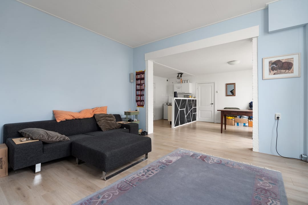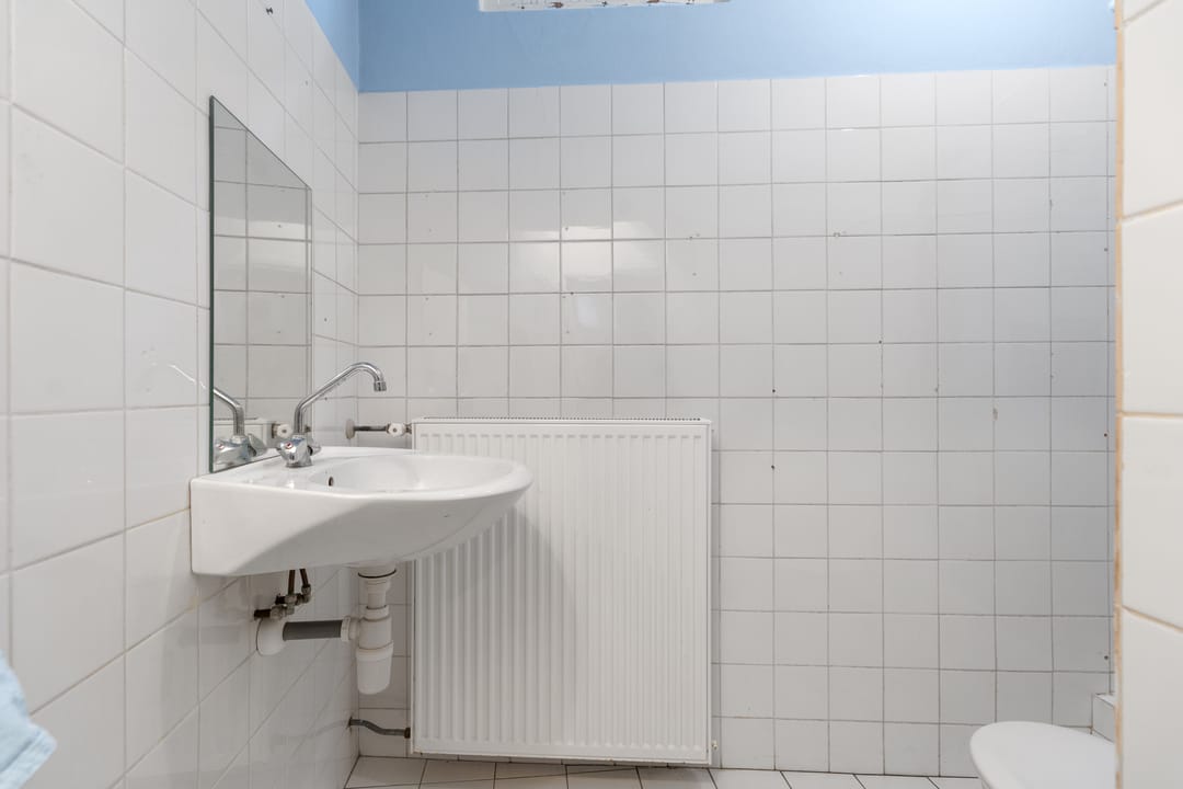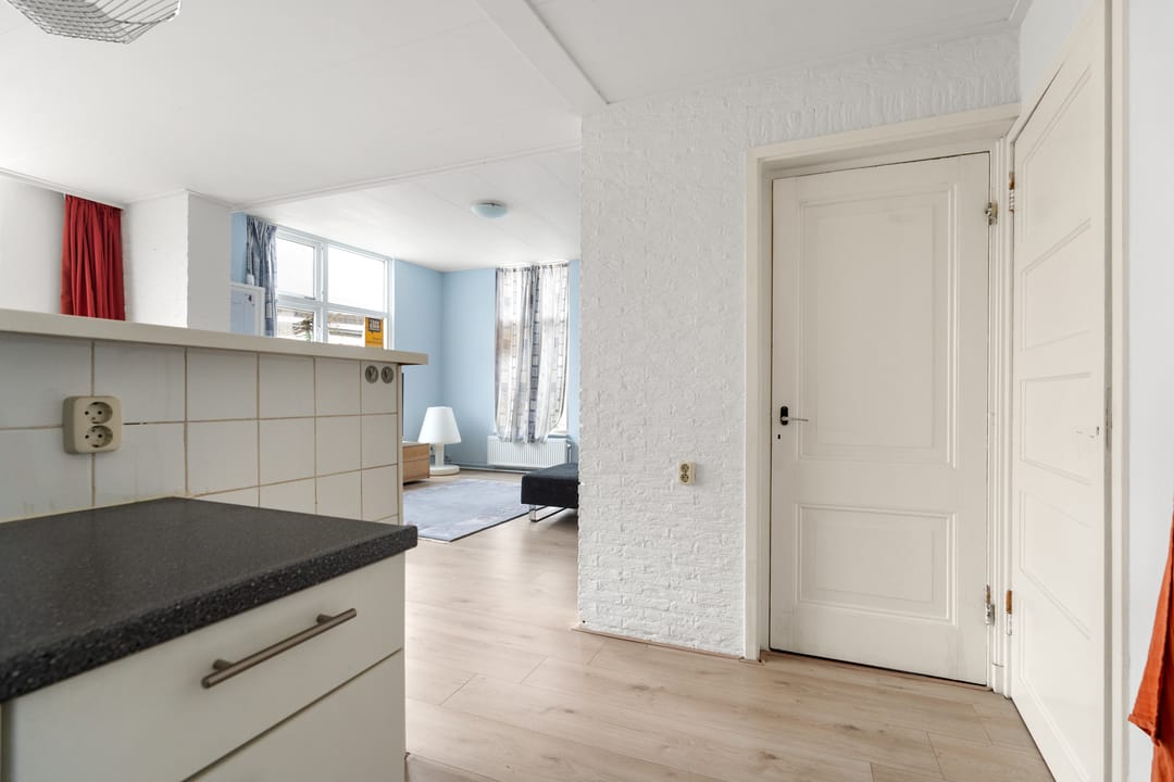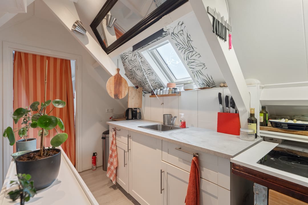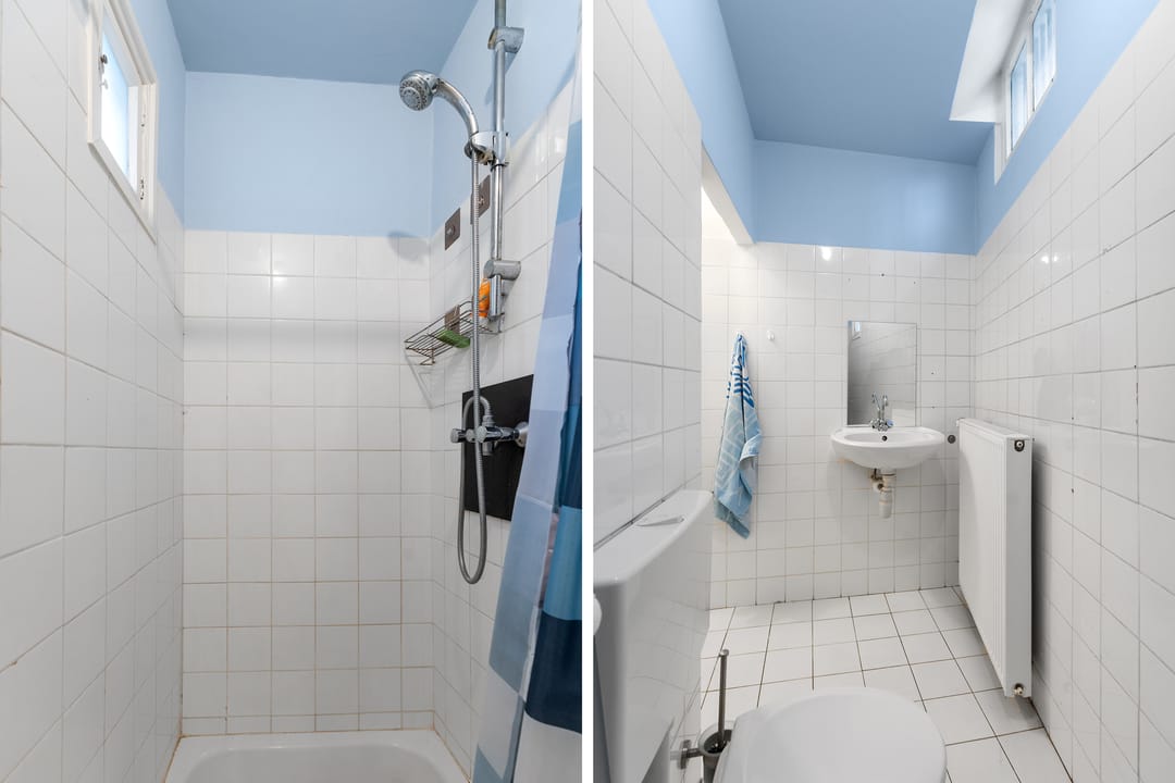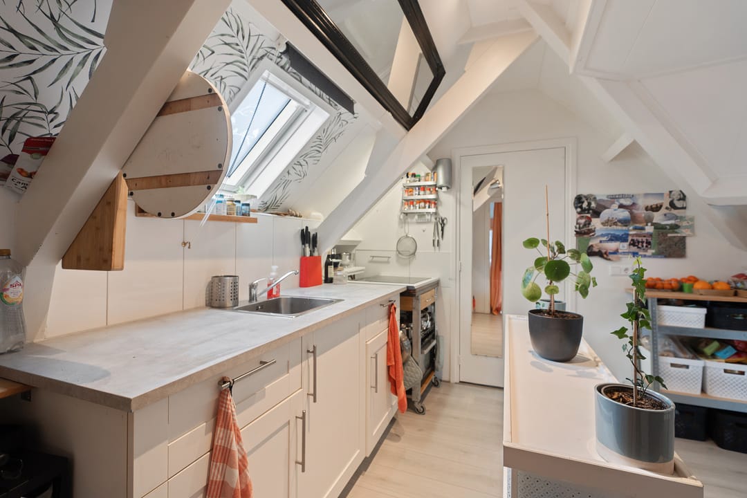 Overloop, eenvoudige bovenwoning met keuken, douche, toilet en 2 slaapkamers.