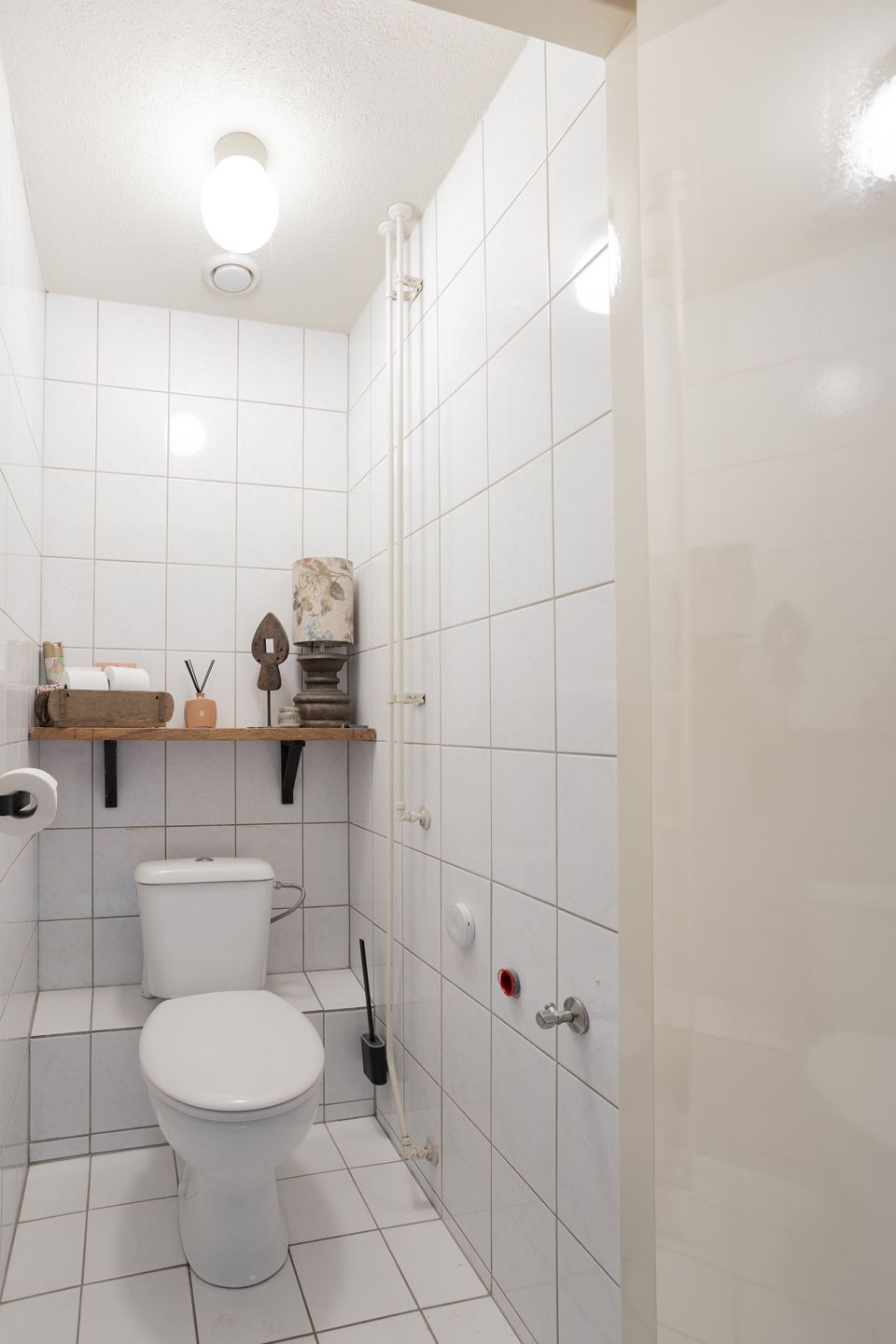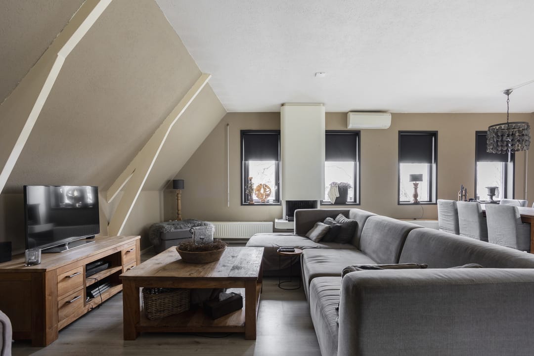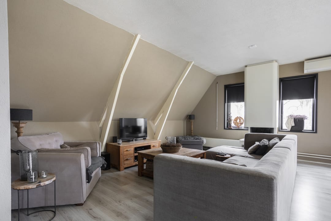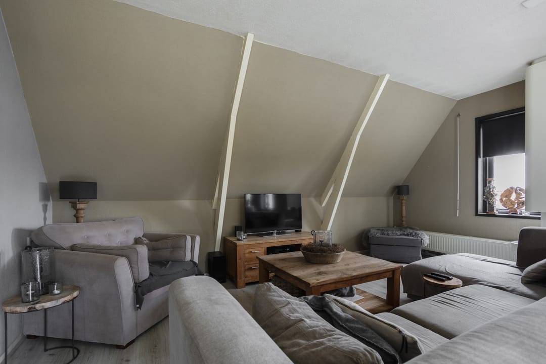 In de hal bereikt men via de trap een zeer ruime bovenwoning bestaande uit een hal met toilet, keuken, woonkamer, badkamer met ligbad, 3 slaapkamers en een groot dakterras.