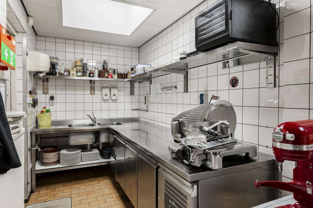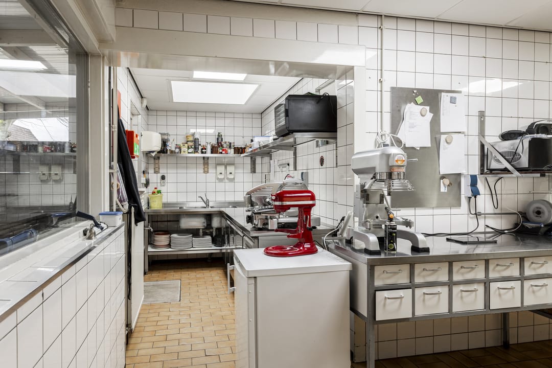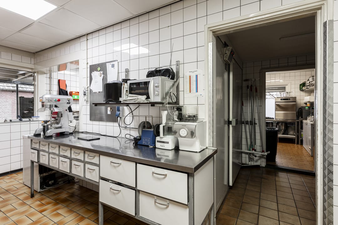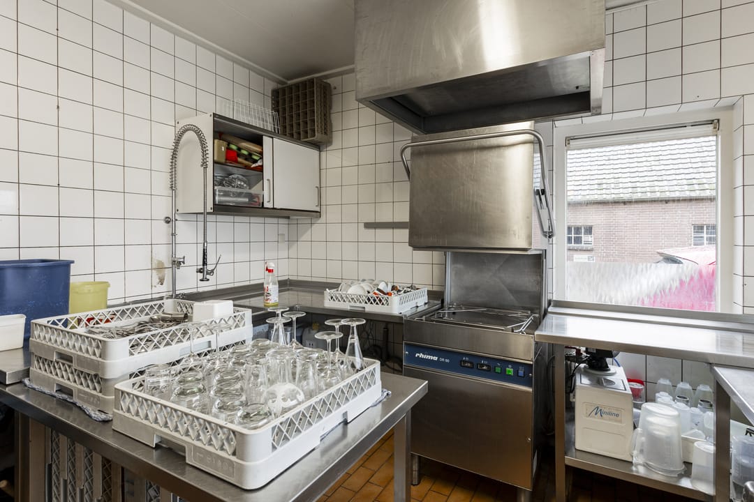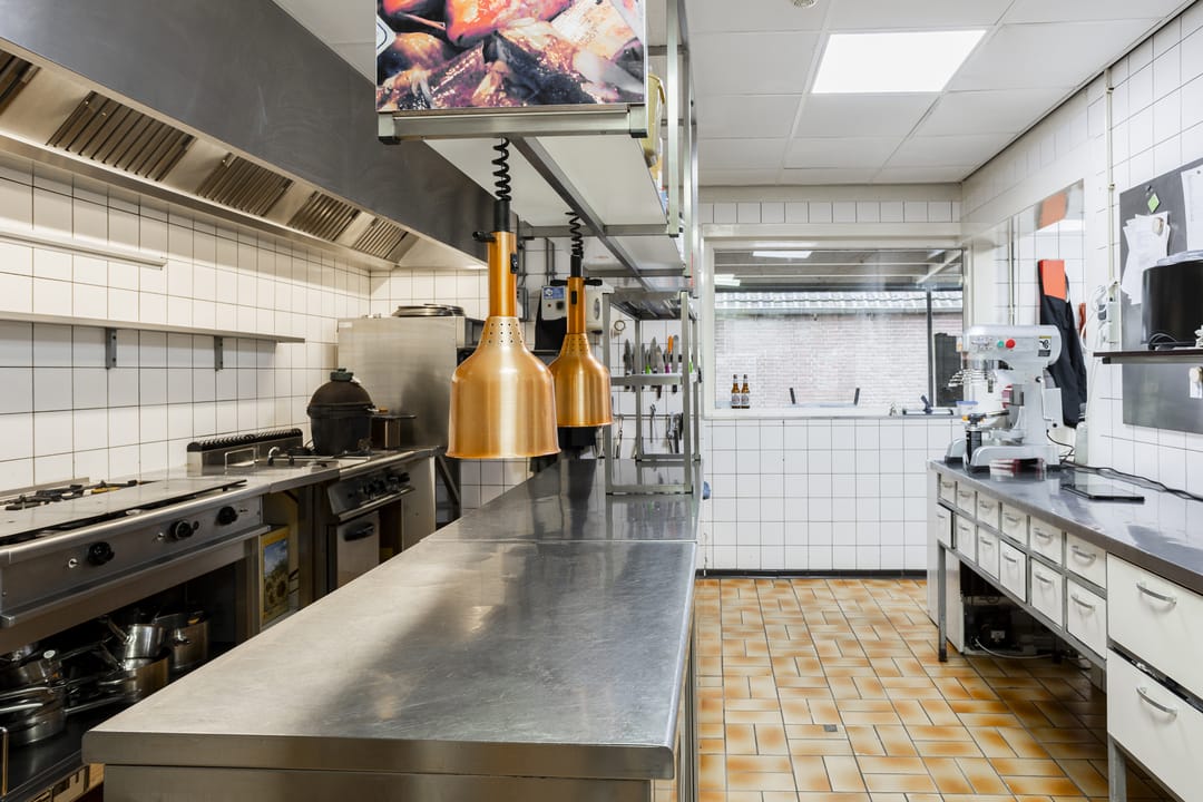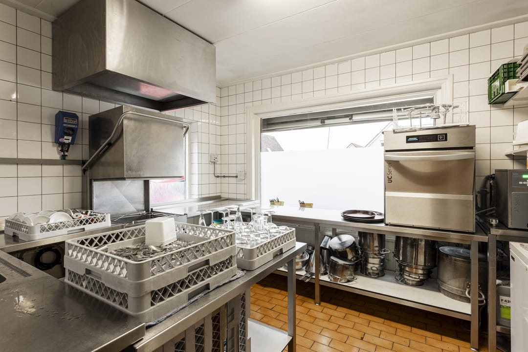 In het midden van de diverse restaurantgedeeltes bevindt zich de ruim opgezette en volledig geoutilleerde keuken, met afzonderlijk spoelgedeelte. Tot slot beschikt de begane grond over moderne toiletgroepen. In de kelder en een zolder is opslagruimte voorhanden, terwijl aan de zijkant van het object nog een besloten terras is gesitueerd.