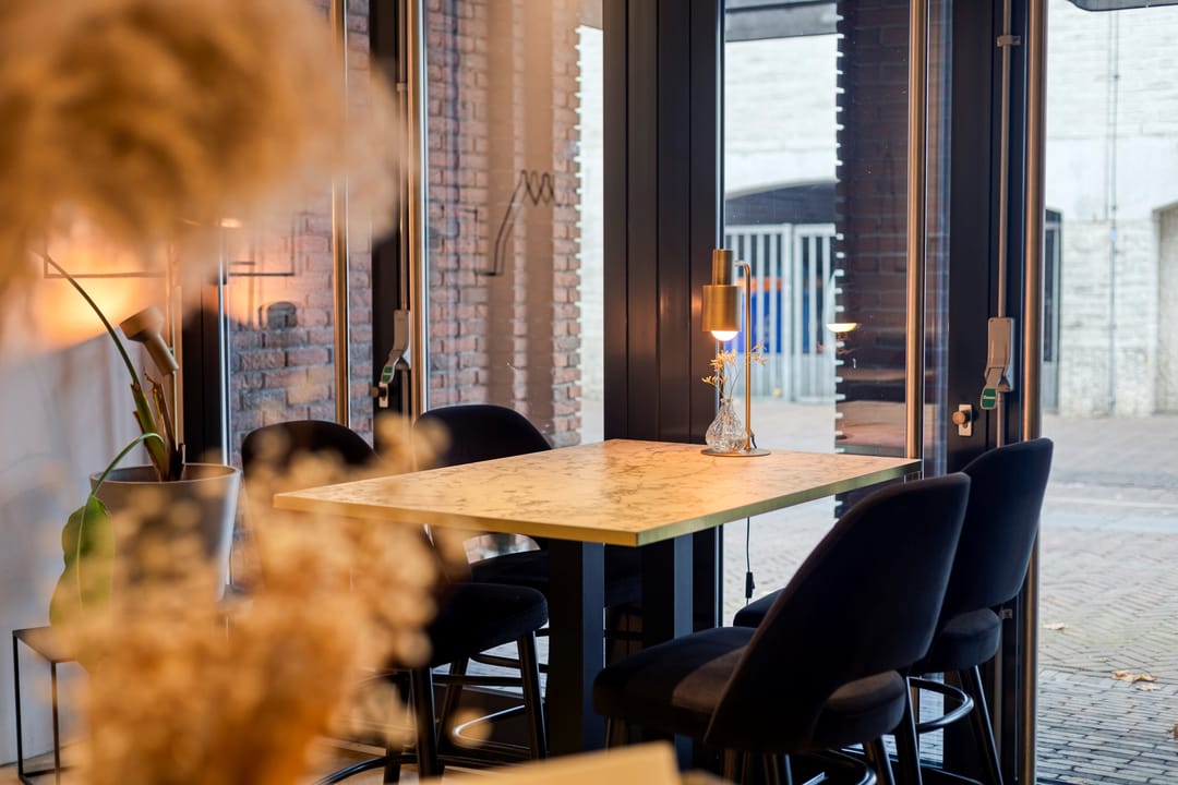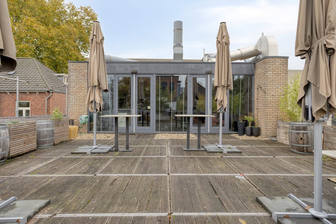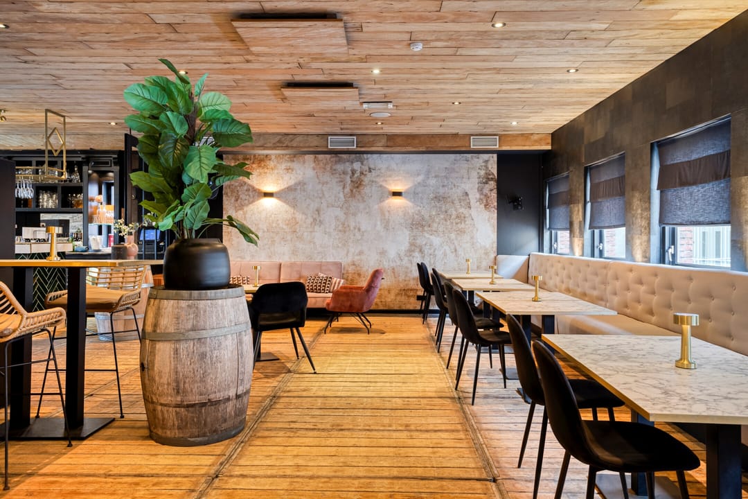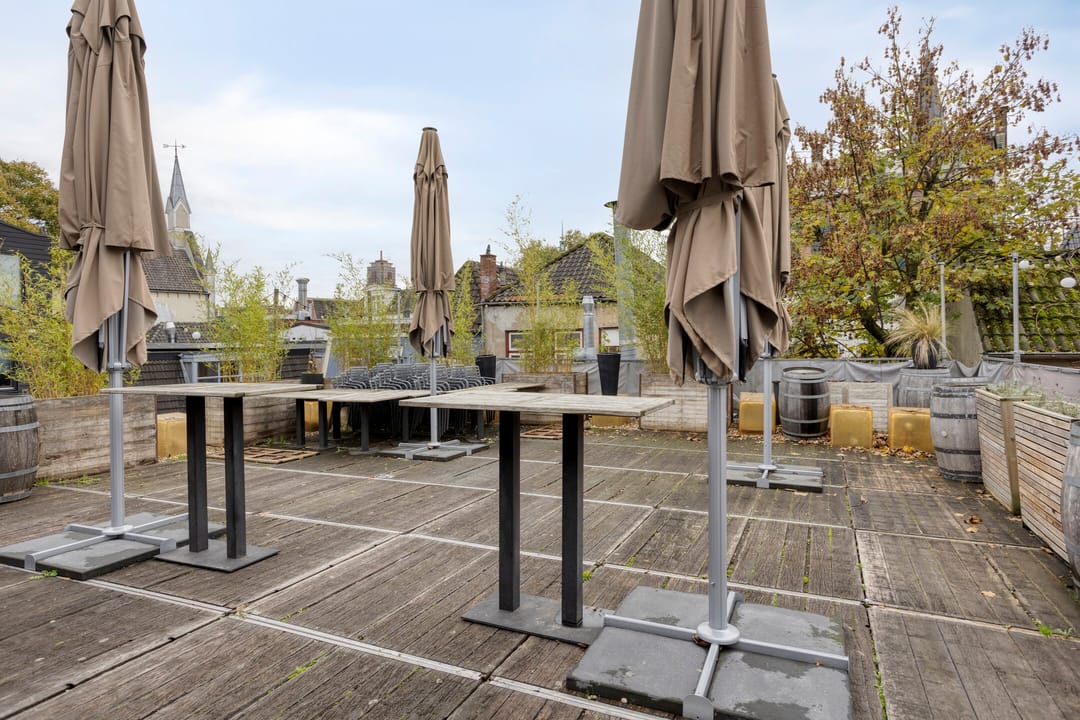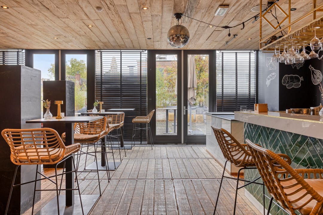 Op de eerste verdieping ligt een uniek dakterras waar je zomers de zon pakt en intiem dineert, uit de wind, in de luwte. Aangrenzend bevindt zich een aparte ruimte met bar: perfect voor private dining, borrels en intieme vieringen — tot en met een bruiloft in klein comité. Ook dat maakt BRUUT tot een veelzijdig podium voor een ambitieuze ondernemer.