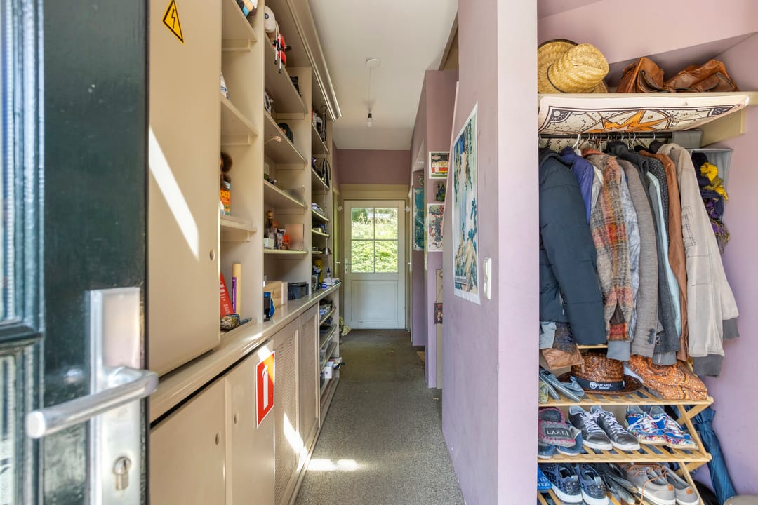 Via de entree in het midden van de voorgevel is de hal te bereiken. Vanuit de hal is er toegang tot de vertrekken aan zowel de linker- als rechterzijde van het pand. Beide ruimtes zijn voorzien van een toilet. Het rechter vertrek beschikt daarnaast over een keuken. Een vaste trap in de hal biedt toegang tot de eerste verdieping, waar zich twee kamers en extra opbergruimte bevinden.