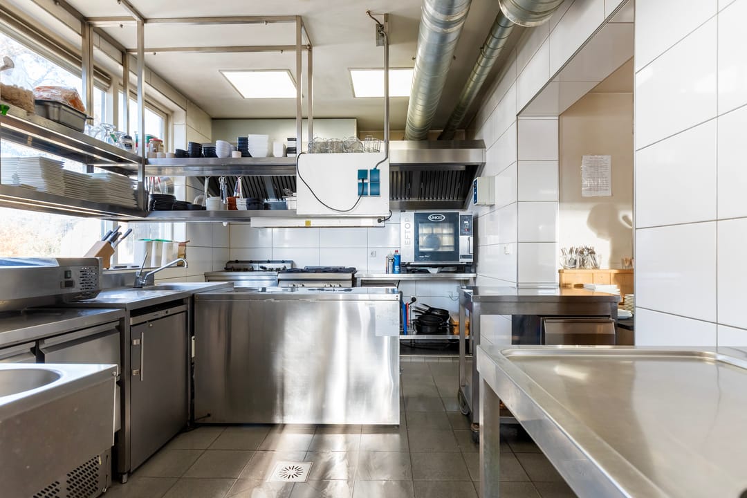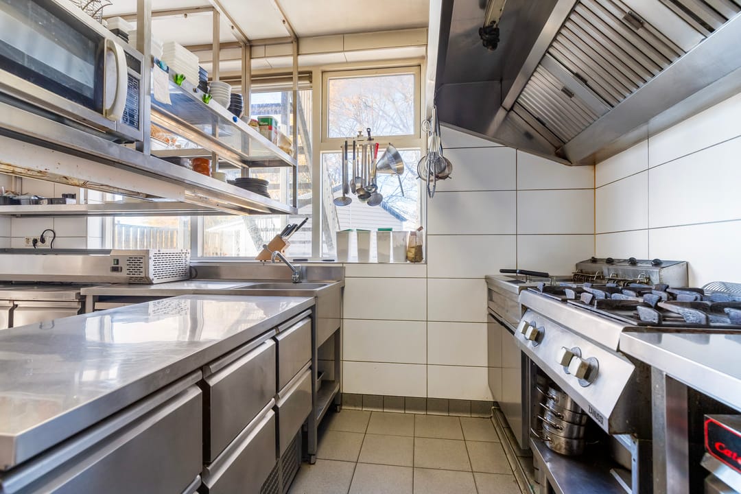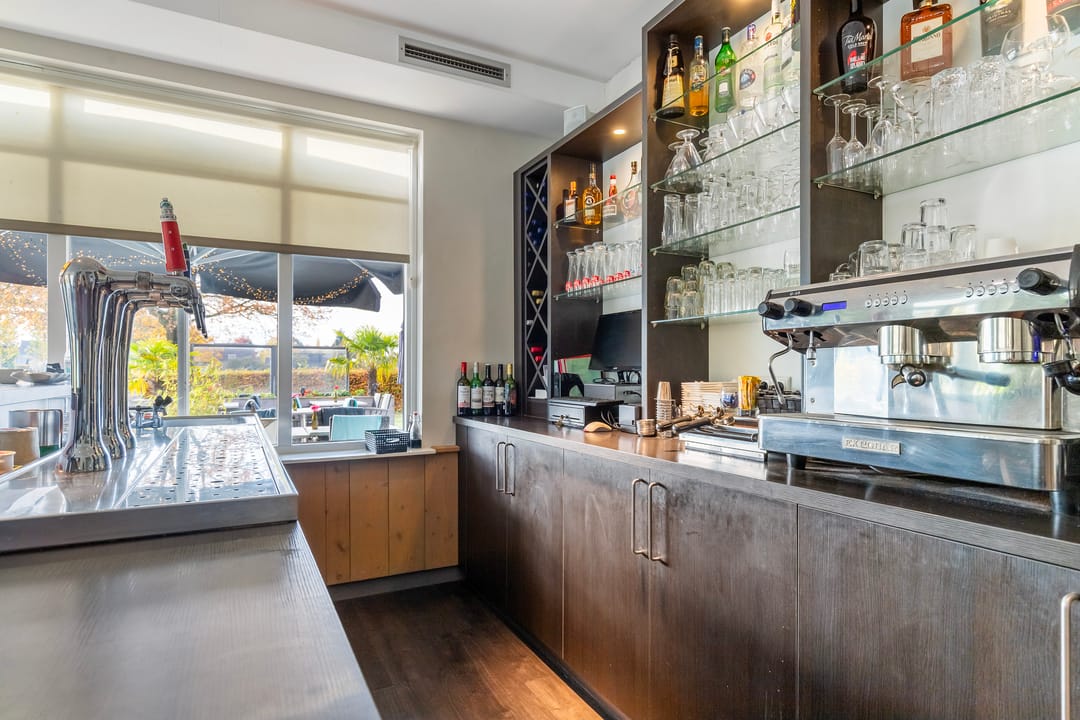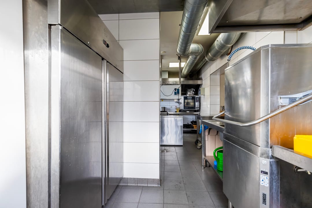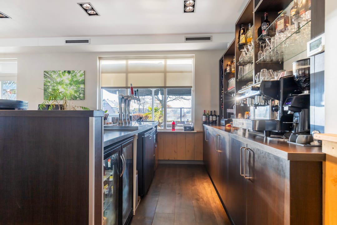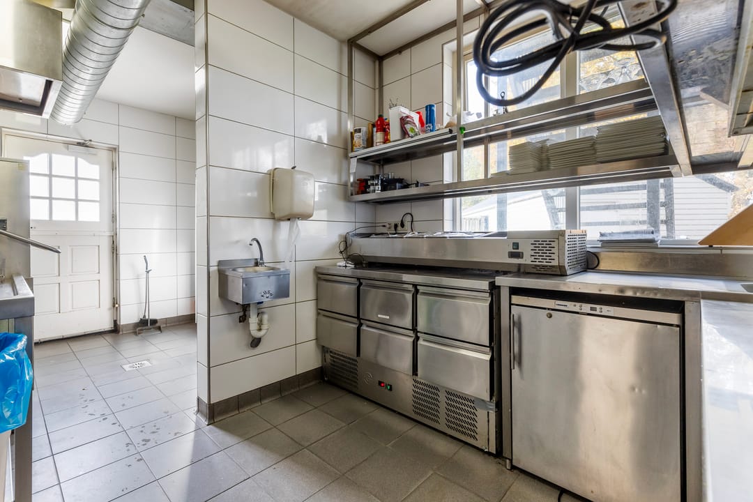 De professionele keuken is volledig uitgerust en vormt het hart van de horeca. Tegenover de lounge bevindt zich de bar, voorzien van tapinstallatie, koelingen en spoelgedeelte.