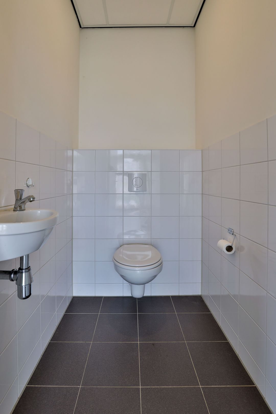 Eigen entree aan voorzijde, kantoor/winkelruimte van ca. 22m²; hal; 2e grote en zeer lichte ruimte van ca. 33m², voorzien van eigen zijentree en dubbele openslaande tuindeuren; keurige moderne toiletruimte met wandcloset en fontein; keukenruimte/ kantine met groot werkblad.