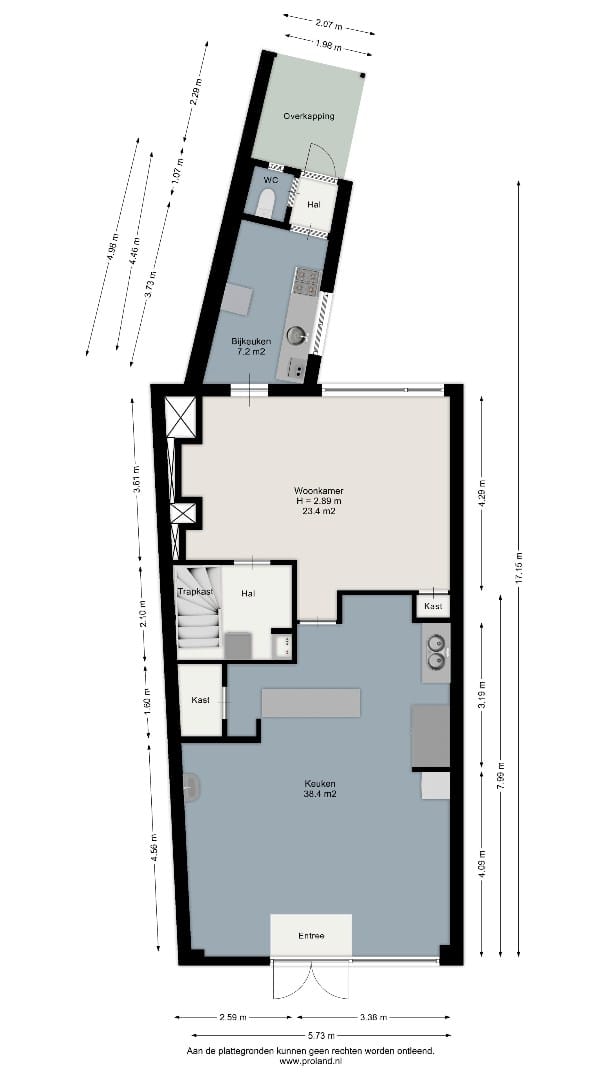 Begane grond: entree van de horecaruimte met keuken, doorgang naar het woongedeelte, bijkeuken, hal met achterentree, toilet en een hal met vaste trap naar de verdieping.