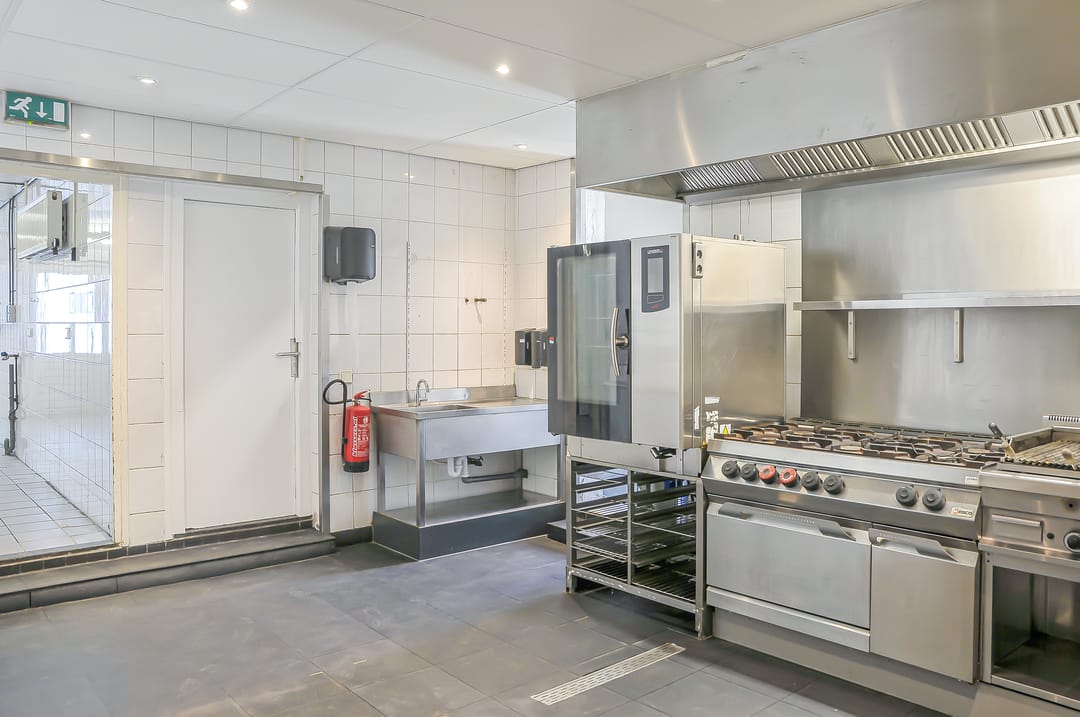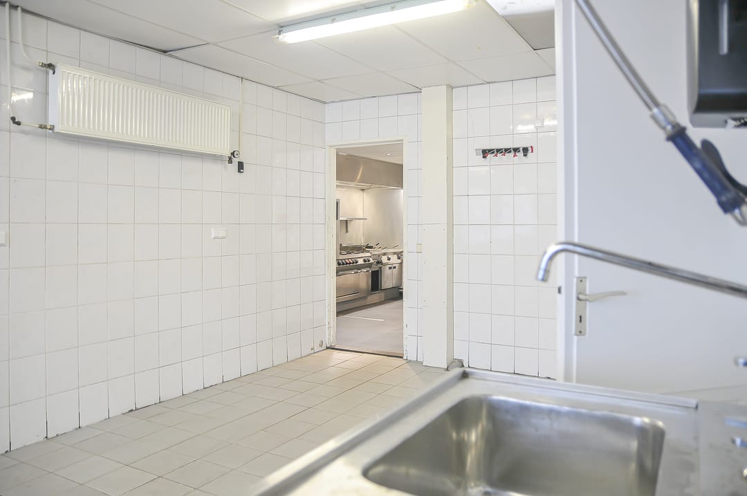 Achter de bar van het eerste restaurantgedeelte bevindt zich een ruime spoelkeuken (ca. 27 m²) met aansluitend de keuken (ca. 22 m²), een koelcelruimte (ca. 6 m²) en een berging (ca. 35 m²).