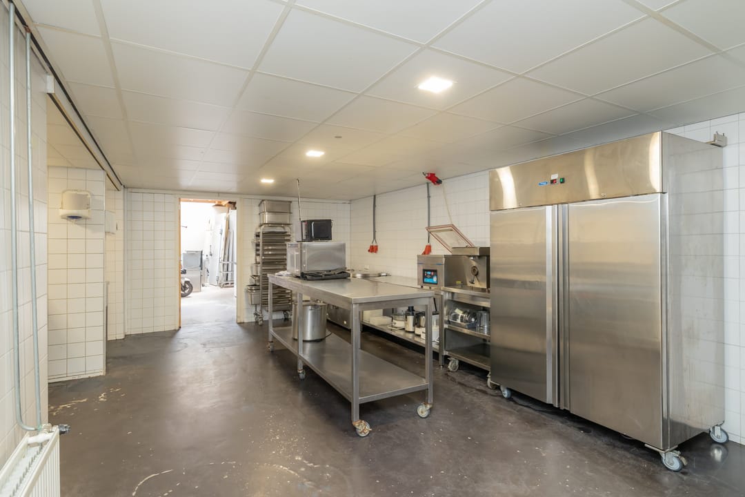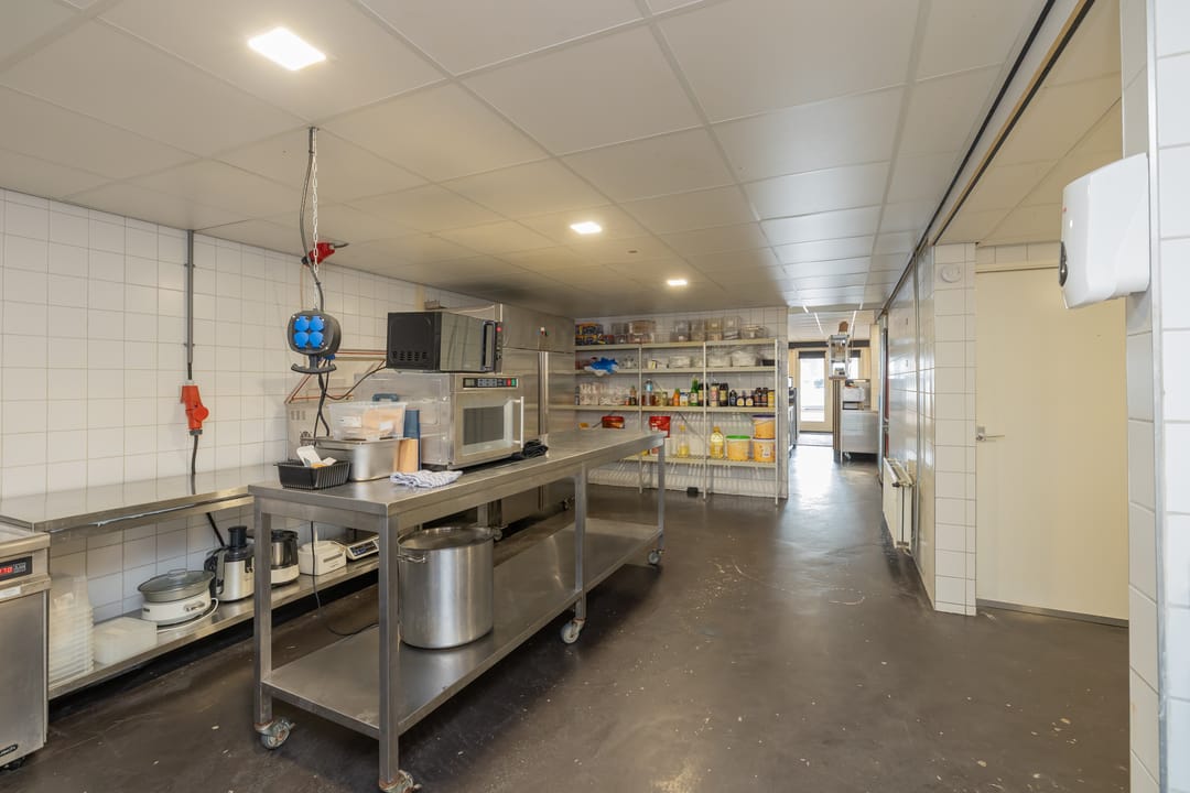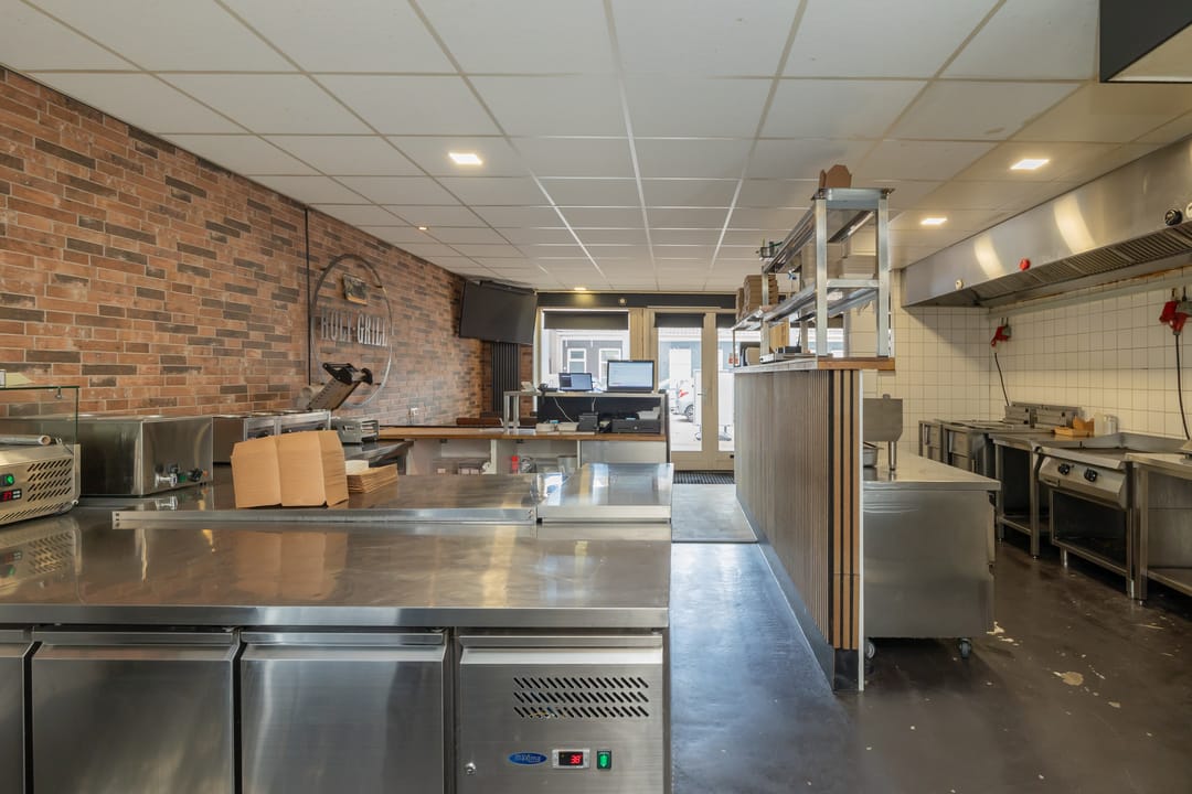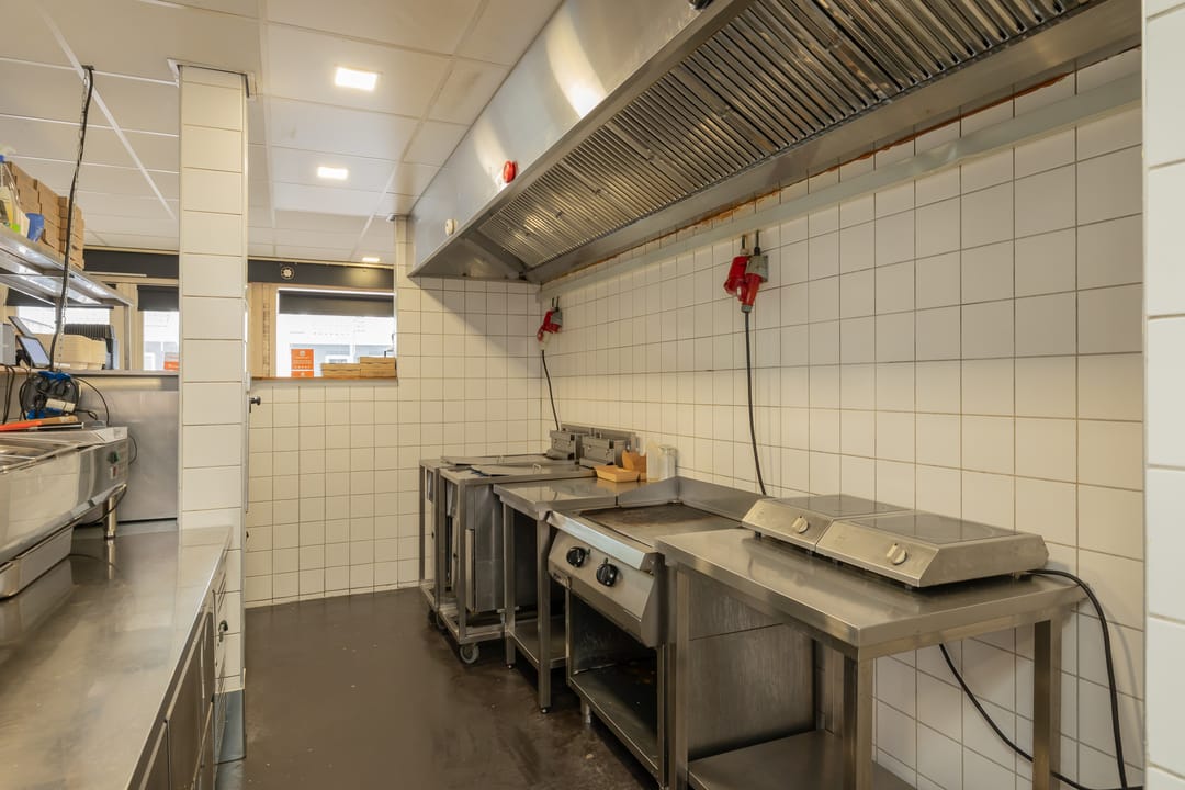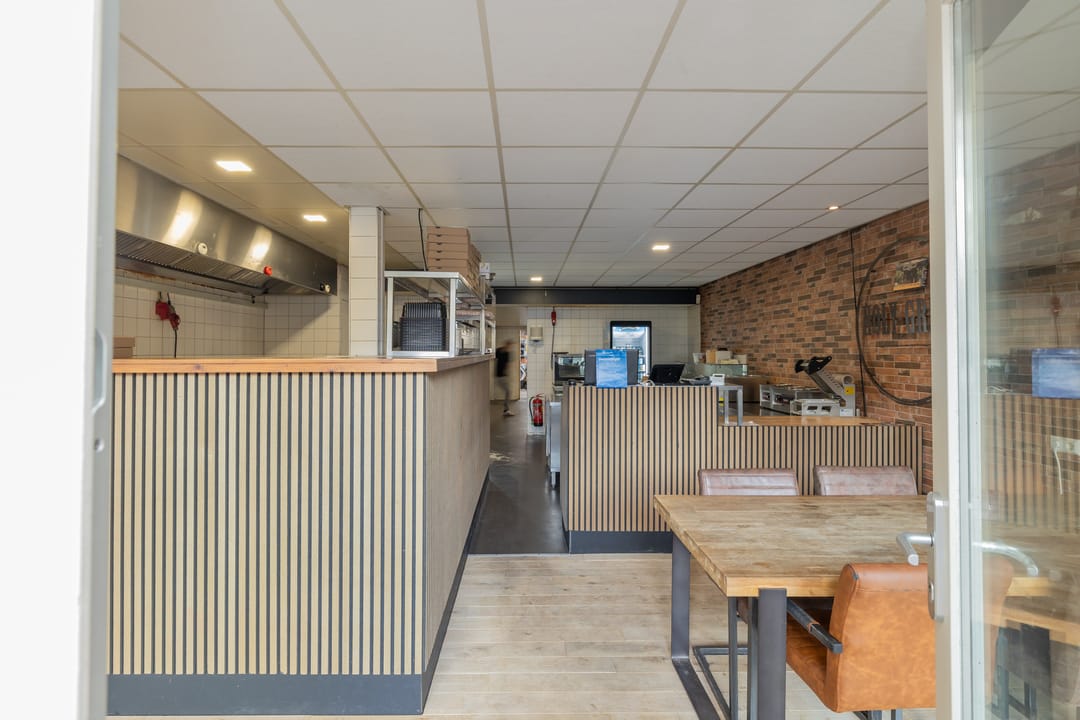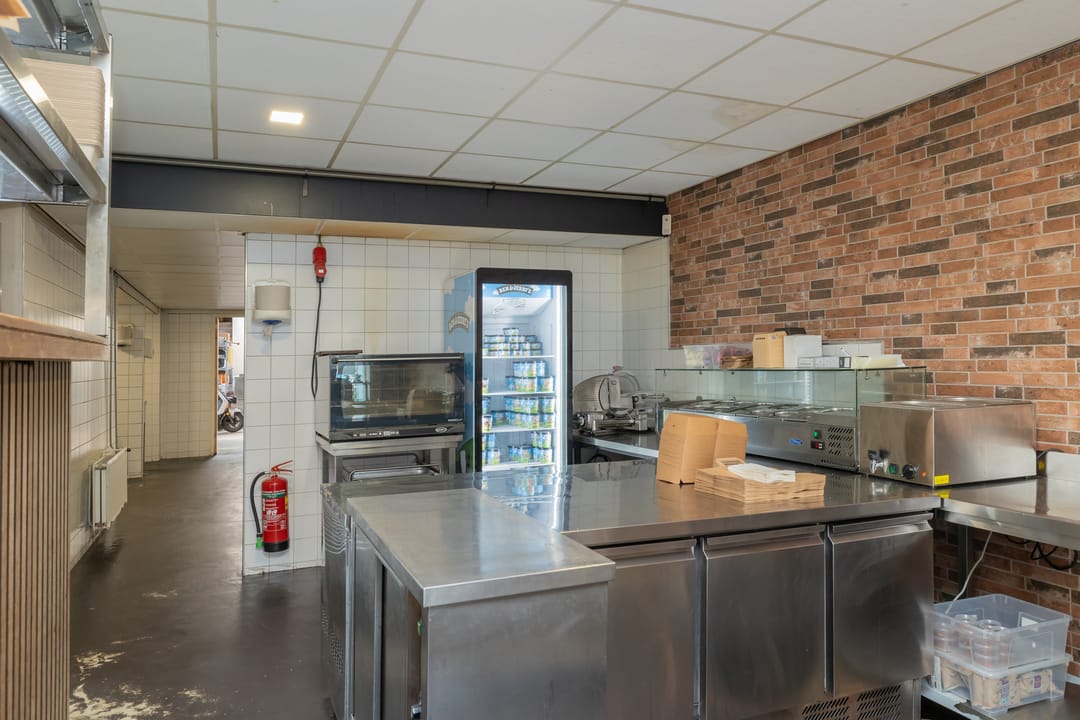 De bedrijfsruimte is efficiënt en professioneel ingericht, met een zeer nette en hoogwaardige inventaris. De keuken is volledig uitgerust voor intensieve productie, inclusief een ruim fornuis, frituurinstallaties, krachtige afzuiging en diverse apparatuur voor de bereiding van warme gerechten. Alle installaties verkeren in goede staat en zijn direct inzetbaar. Aan de voorzijde bevindt zich een klantvriendelijke ontvangstruimte, terwijl achterin een aparte voorbereidingsruimte is ingericht voor mise-en-place werkzaamheden. Deze ruimte beschikt over grote ketels, krachtstroomaansluitingen en is uitermate geschikt voor productie op grotere schaal. De uitbouw aan de achterzijde fungeert als opslagruimte en logistiek vertrekpunt voor bezorgers.
