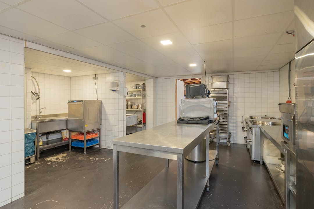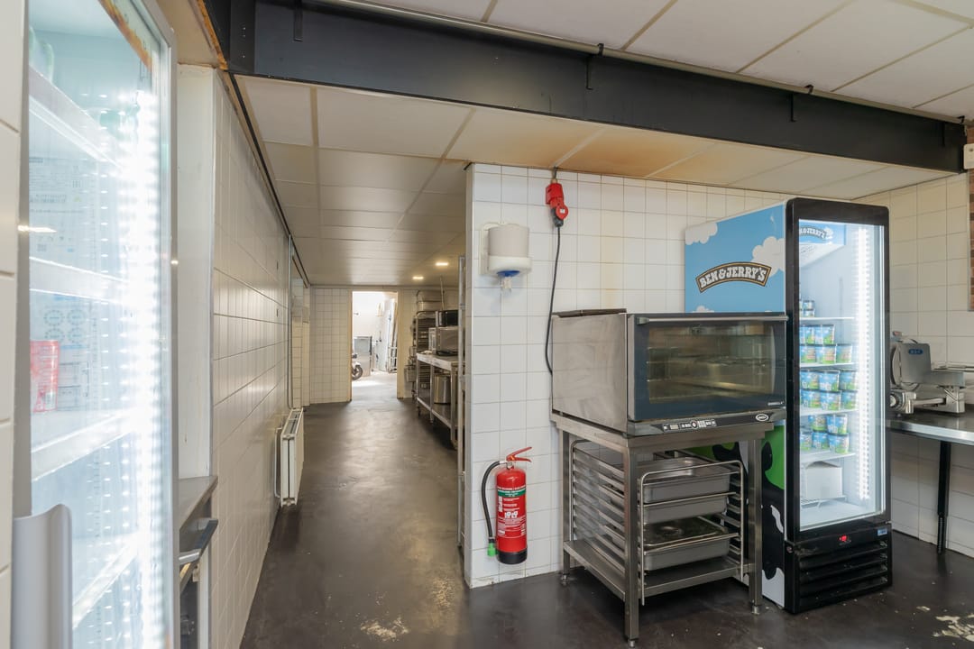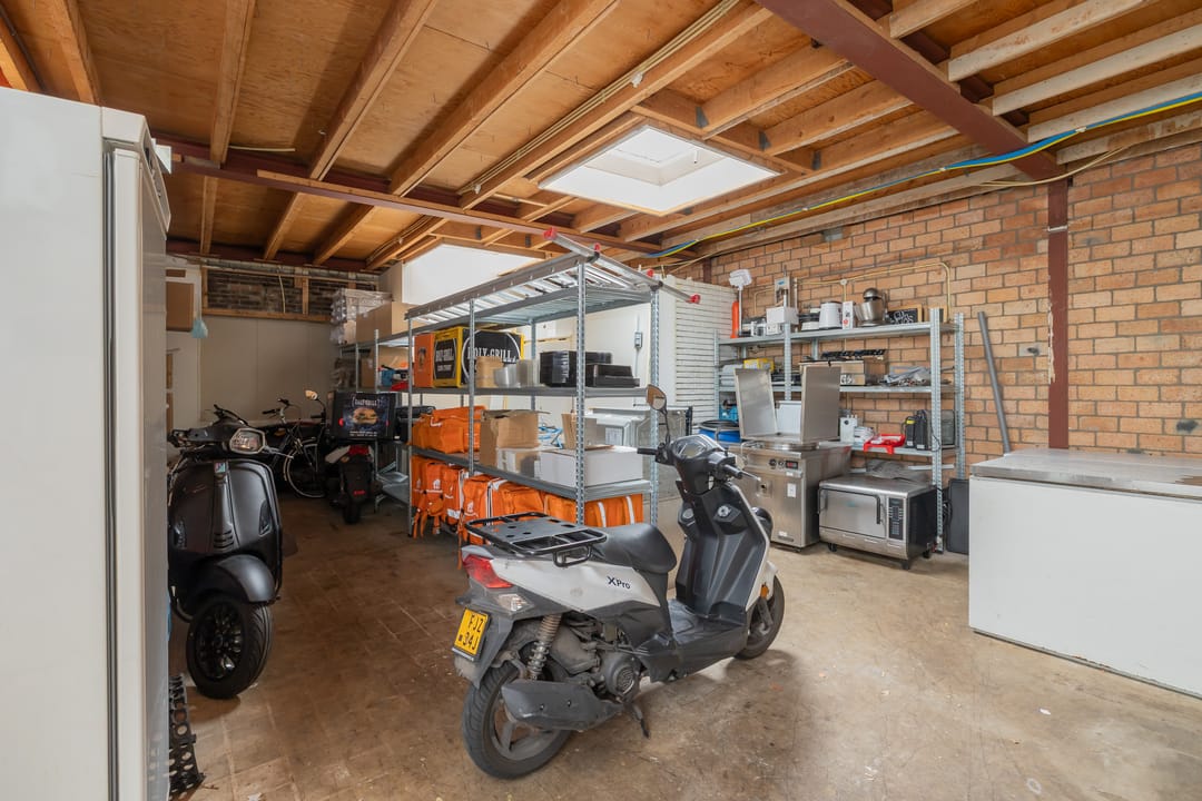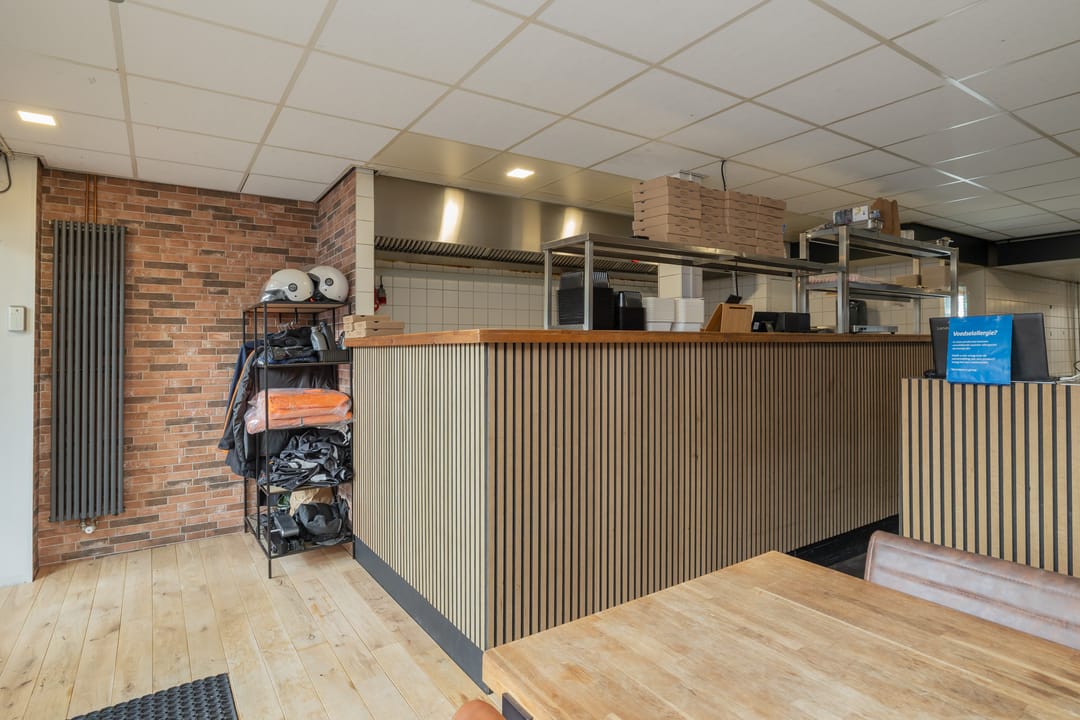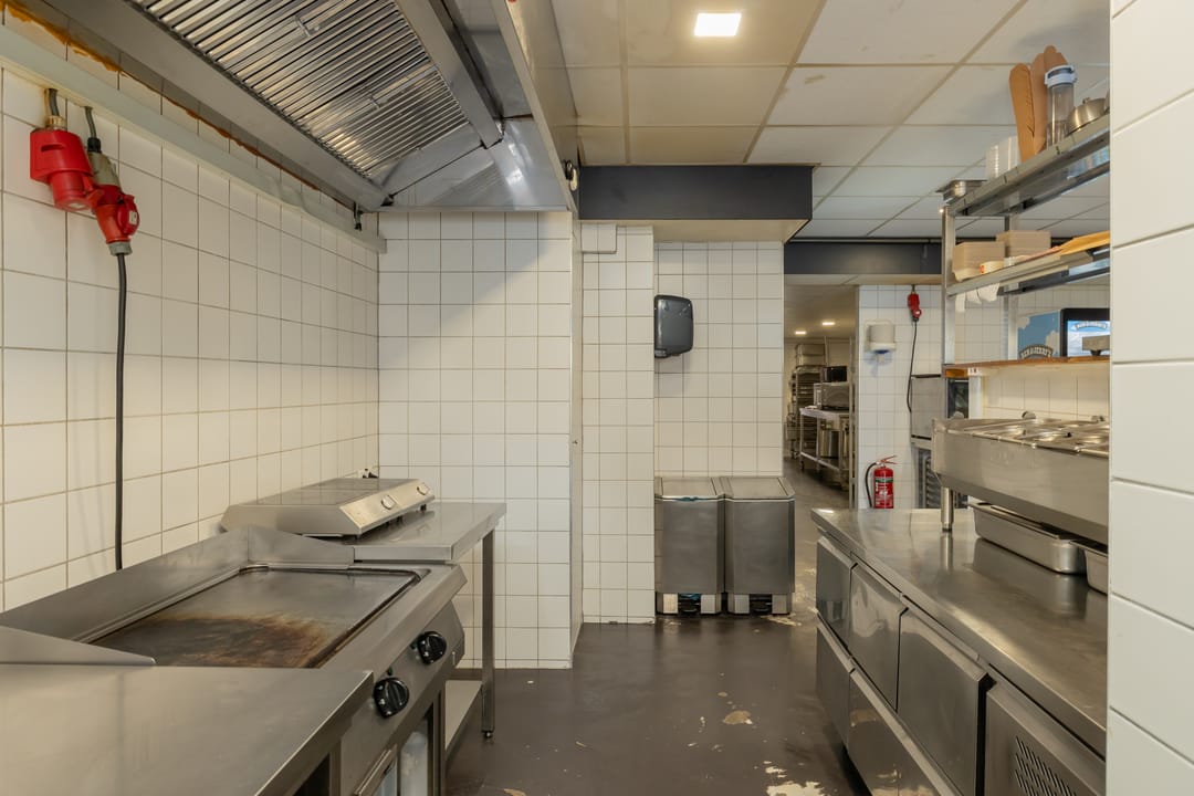 De bedrijfsruimte is efficiënt en professioneel ingericht, met een zeer nette en hoogwaardige inventaris. De keuken is volledig uitgerust voor intensieve productie, inclusief een ruim fornuis, frituurinstallaties, krachtige afzuiging en diverse apparatuur voor de bereiding van warme gerechten. Alle installaties verkeren in goede staat en zijn direct inzetbaar. Aan de voorzijde bevindt zich een klantvriendelijke ontvangstruimte, terwijl achterin een aparte voorbereidingsruimte is ingericht voor mise-en-place werkzaamheden. Deze ruimte beschikt over grote ketels, krachtstroomaansluitingen en is uitermate geschikt voor productie op grotere schaal. De uitbouw aan de achterzijde fungeert als opslagruimte en logistiek vertrekpunt voor bezorgers.