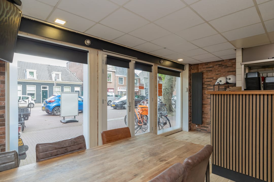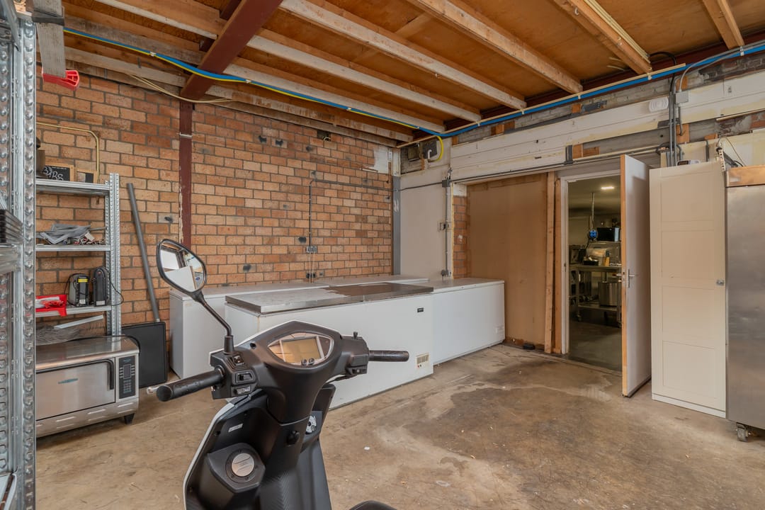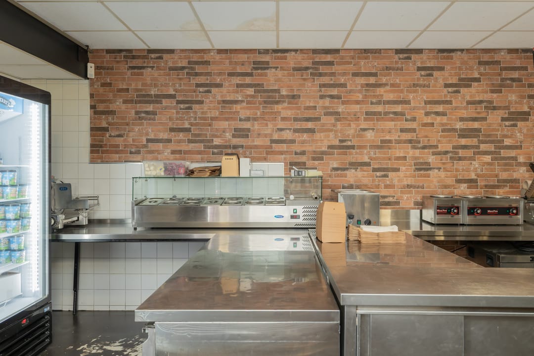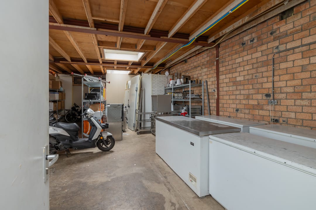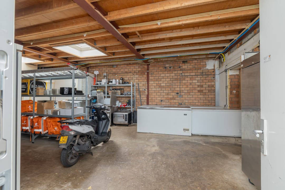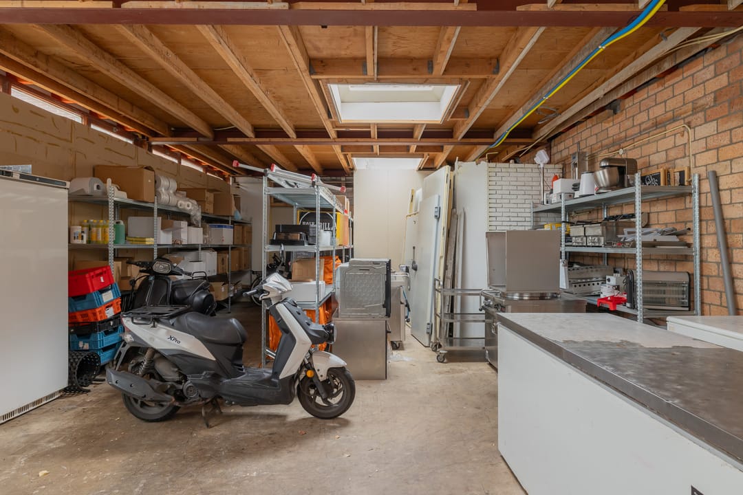 De bedrijfsruimte is efficiënt en professioneel ingericht, met een zeer nette en hoogwaardige inventaris. De keuken is volledig uitgerust voor intensieve productie, inclusief een ruim fornuis, frituurinstallaties, krachtige afzuiging en diverse apparatuur voor de bereiding van warme gerechten. Alle installaties verkeren in goede staat en zijn direct inzetbaar. Aan de voorzijde bevindt zich een klantvriendelijke ontvangstruimte, terwijl achterin een aparte voorbereidingsruimte is ingericht voor mise-en-place werkzaamheden. Deze ruimte beschikt over grote ketels, krachtstroomaansluitingen en is uitermate geschikt voor productie op grotere schaal. De uitbouw aan de achterzijde fungeert als opslagruimte en logistiek vertrekpunt voor bezorgers.