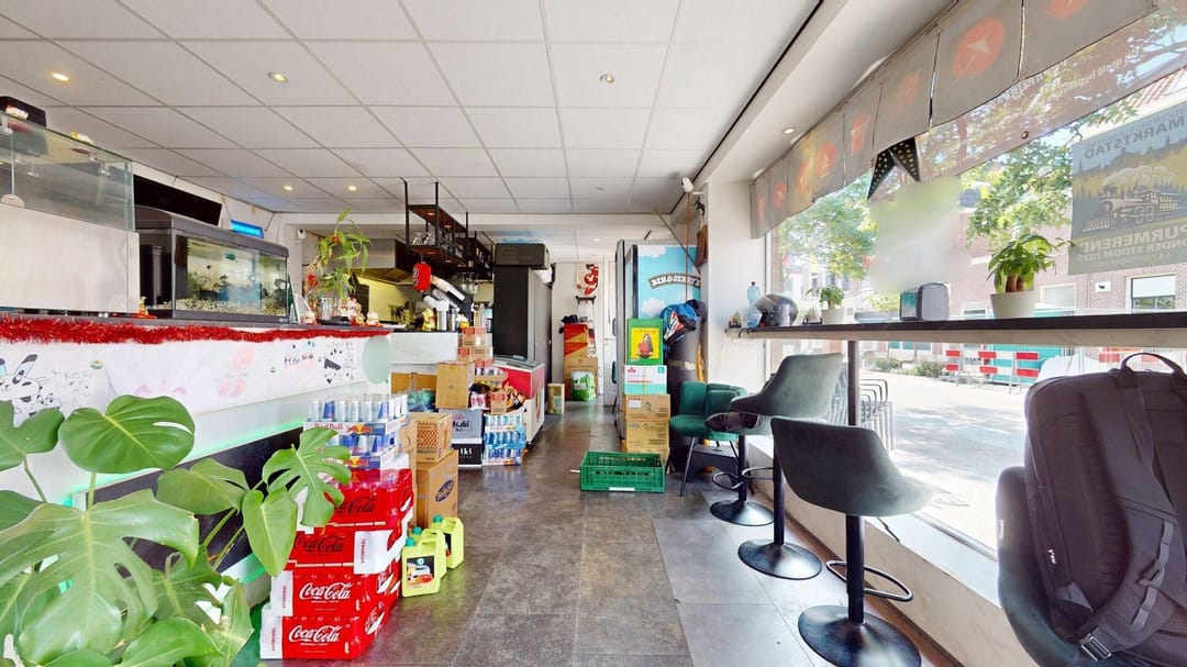 Het restaurant beschikt binnen over een ruim zitgedeelte, een keuken en een toilet. Via een uitpandige trap aan de rechterzijde van het pand bereikt u de eerste verdieping waar de opslagruimte zich bevindt.