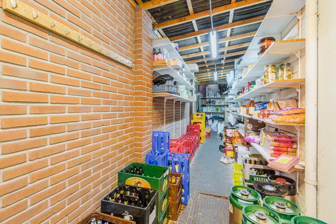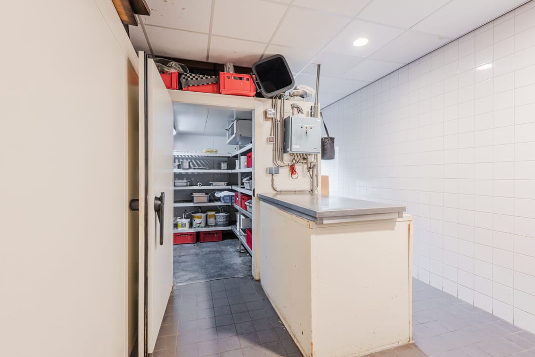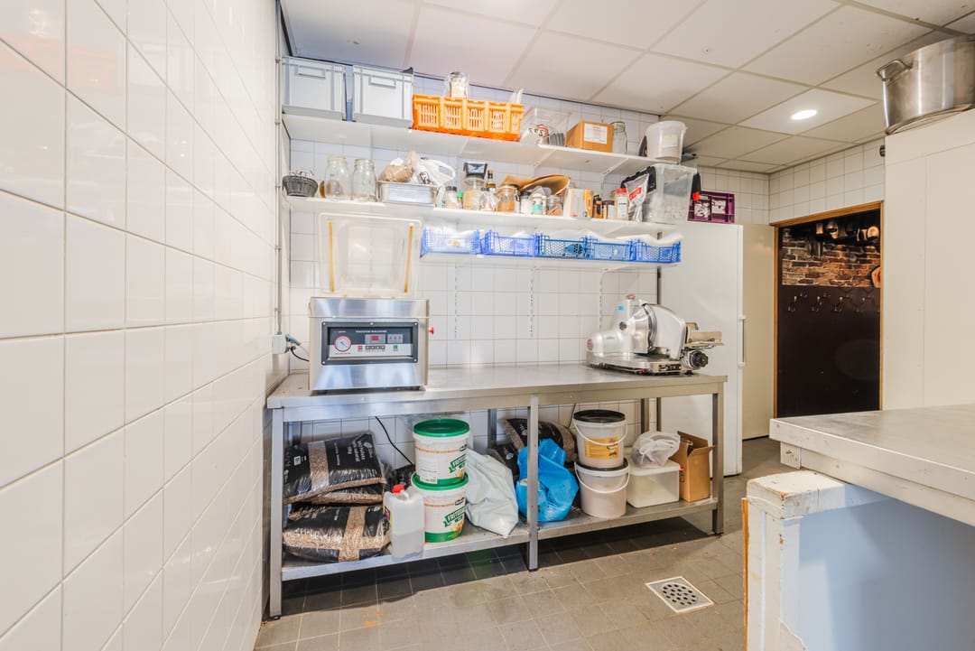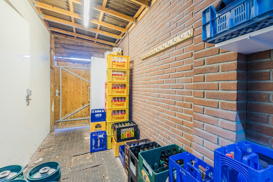 Naast de keuken bevindt zich nog een bijkeuken met toegang tot het een ruime opslag welke zich in de basis buiten bevindt, maar goed is afgesloten tegen de elementen.