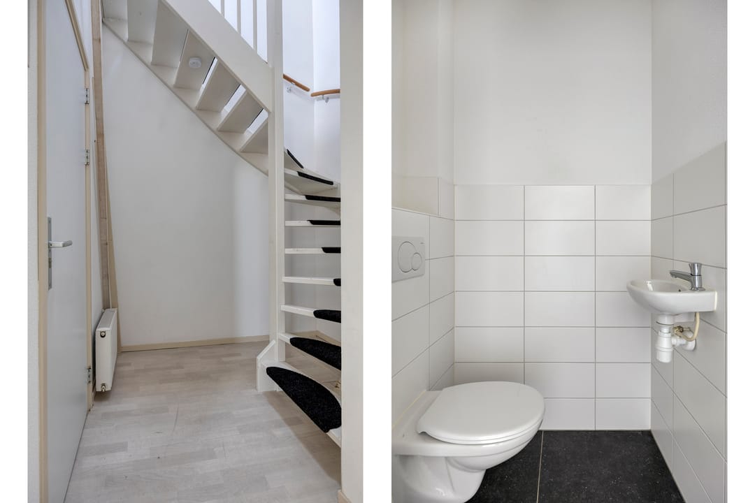 Eerste en tweede verdieping ingericht als woonruimte, De woning beschikt over totaal drie kamers en elke verdieping beschikt over een eigen toilet. Geschikt voor eigen bewoning of verhuur.