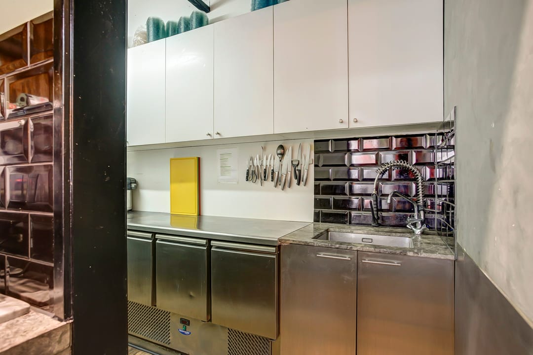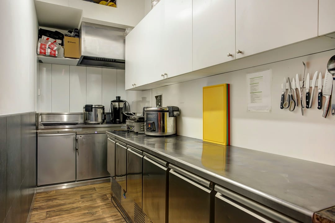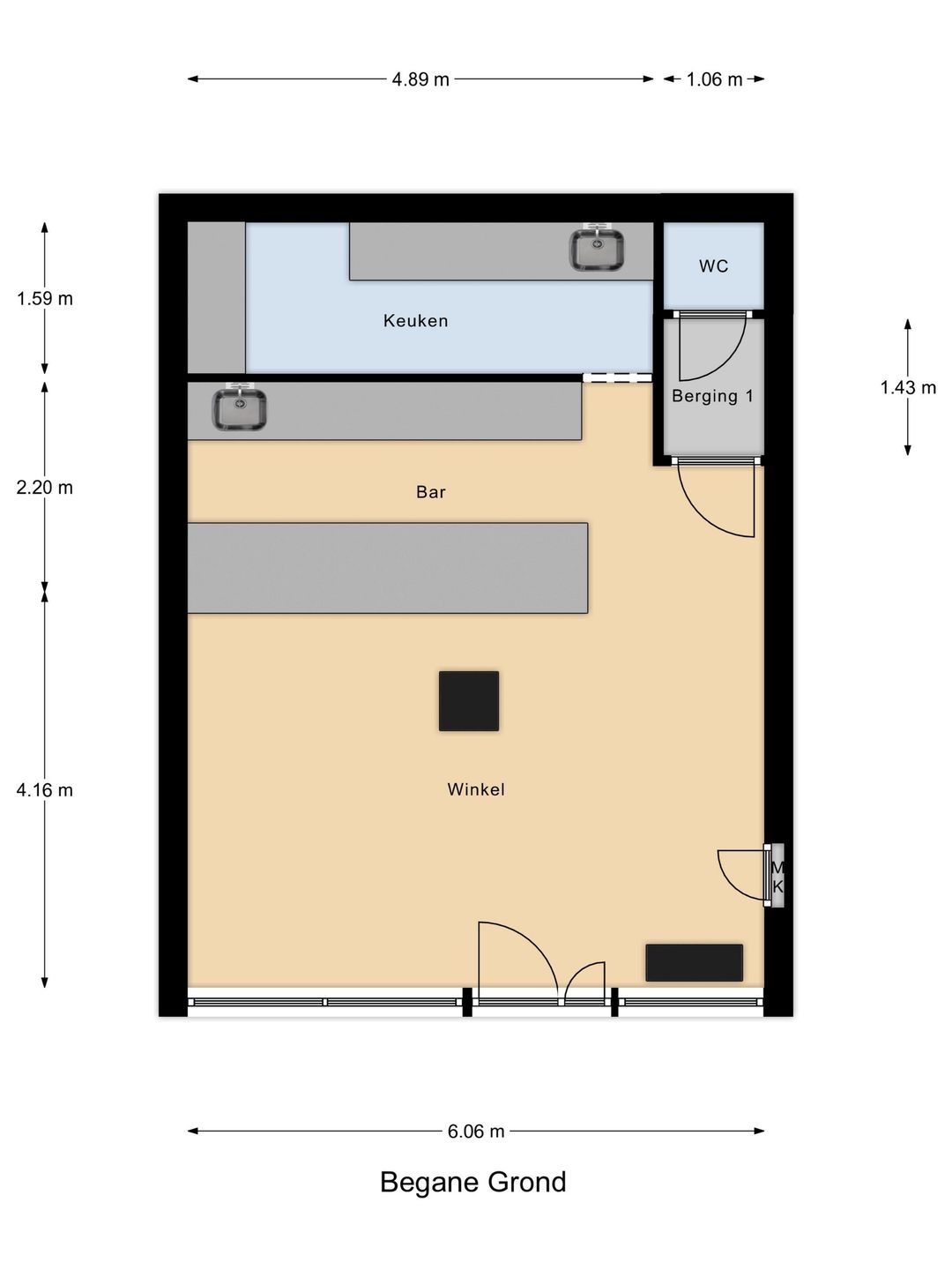Groot vierkant met in het midden de counter, daarachter een gesloten wand met koffieapparatuur, juicers etc. etc. Achter deze wand een aparte keuken met ruimte voor productie en afwas, op de verdieping is nog wat opslagmogelijkheid te bereiken middels een vlizotrap.