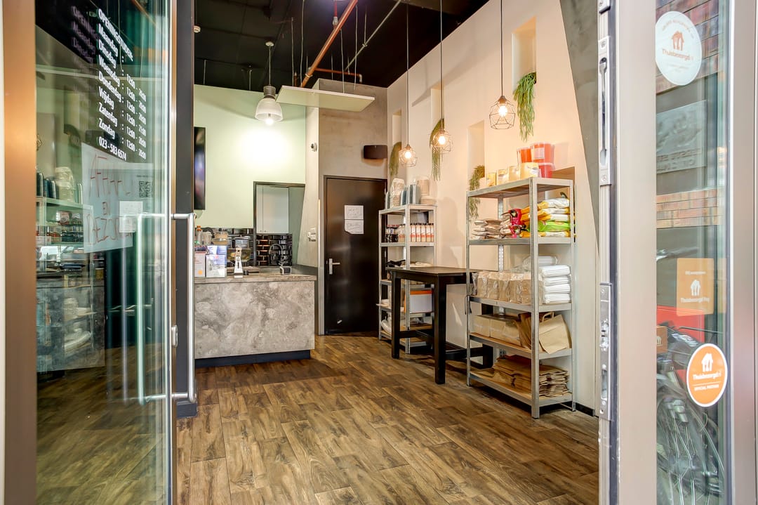 De zaak is voornamelijk ingericht op Take Away, aan een counter aan het raam zijn er ca. 8 zitplaatsen mogelijk, tevens is er ruimte voor een beperkt aantal stoelen en tafels. Totale BVO 55m2, zitplaatsen ca 16 stuks.