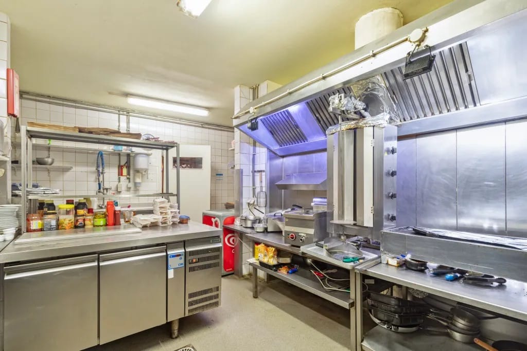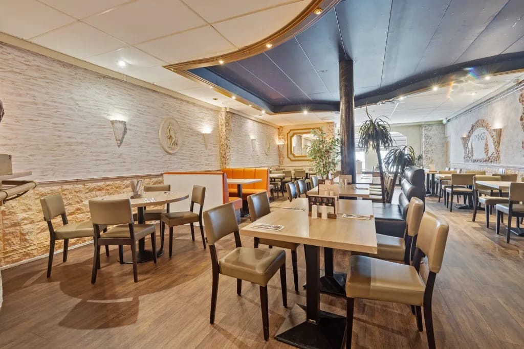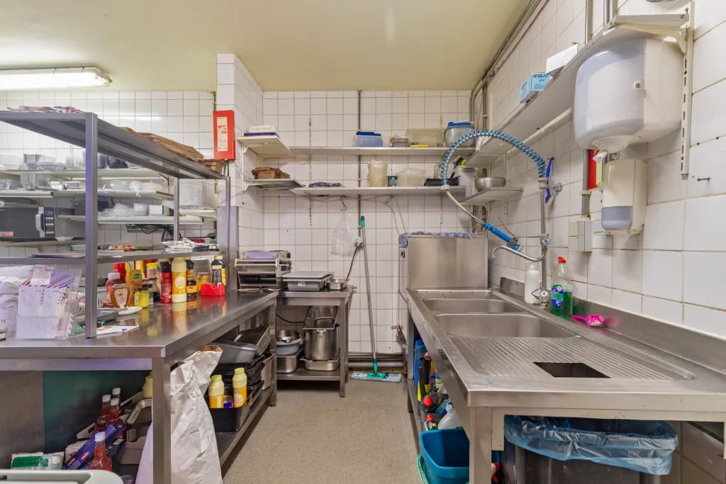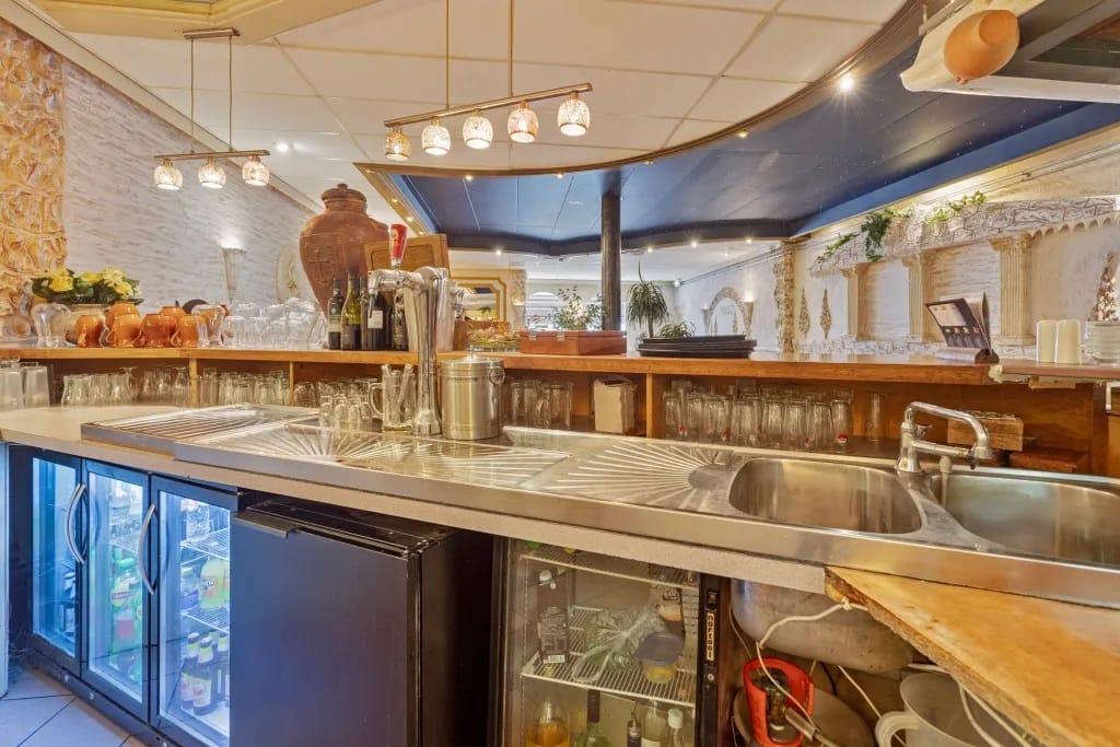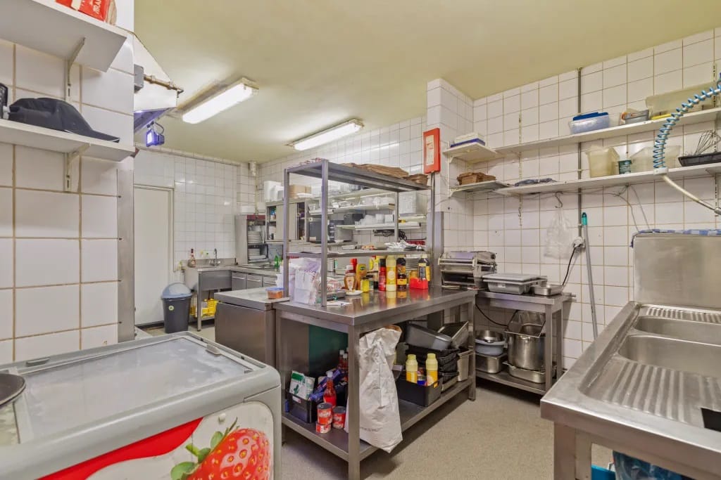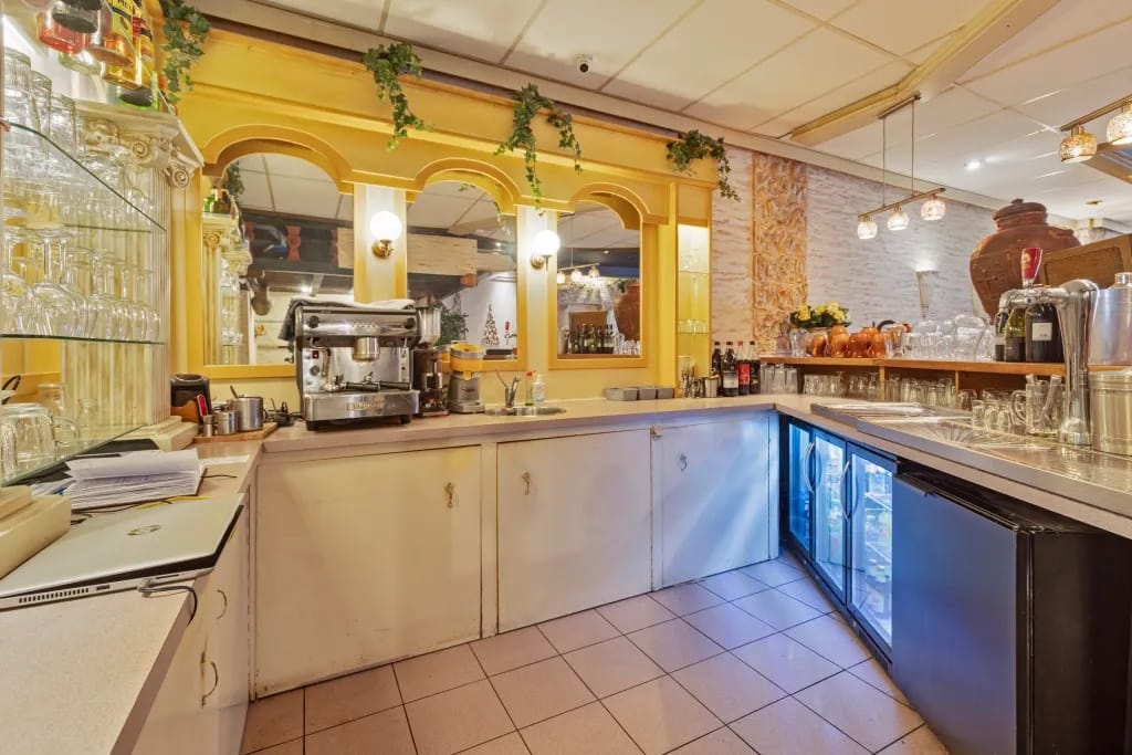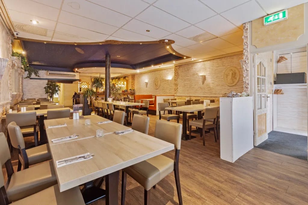Entree, grote open restaurant die naar wens is in te delen. Achter in het restaurant is de bar die toegang geeft naar de keuken en toiletten. Aan de achterzijde is een buitenopslag die overdekt is. Via de trap in een separate zijingang is