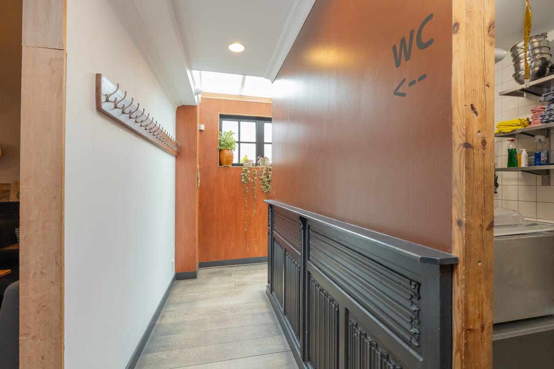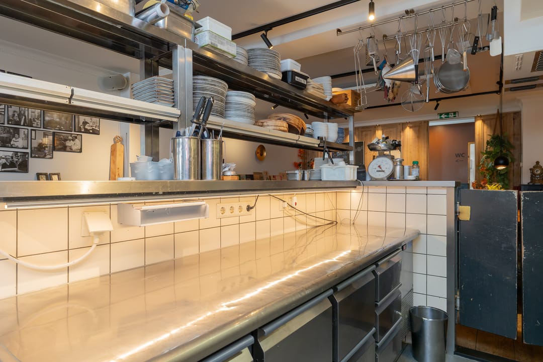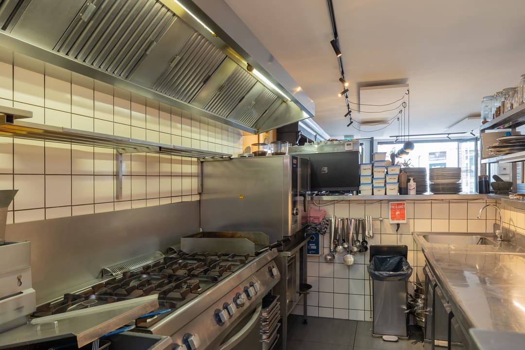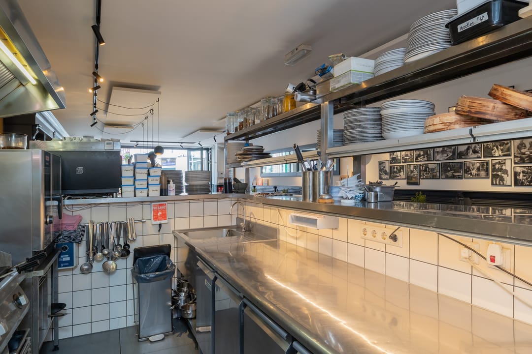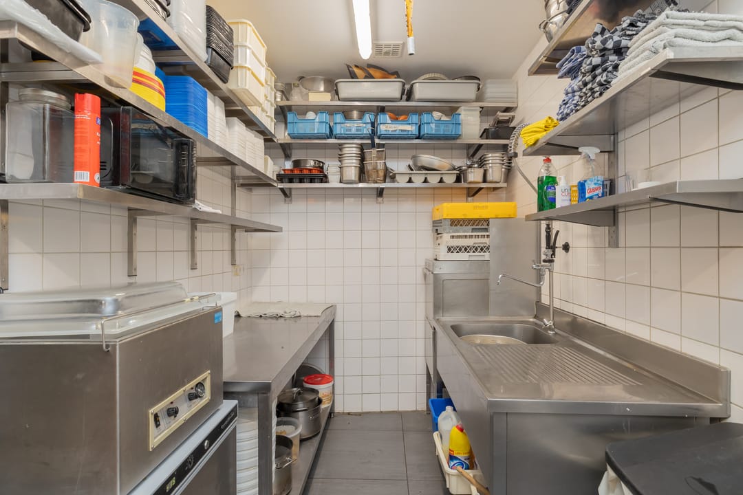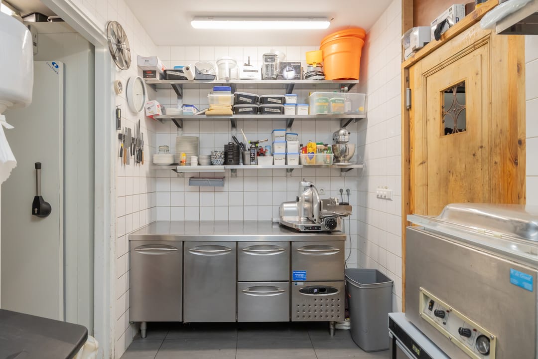De indeling is overzichtelijk, met de bar en open keuken centraal in de zaak. De keuken is professioneel ingericht en voorzien van alle benodigde apparatuur, waaronder een krachtige afzuiginstallatie, koelwerkbanken en een efficiënte werkindeling. Achter in het pand bevinden zich de spoelkeuken, mise-en-place-ruimte en een gang naar de toiletten. Via deze gang is tevens de achterplaats bereikbaar, gelegen aan de Achteromstraat, ideaal voor afvalafvoer en extra opslag. Daarnaast beschikt het restaurant over een praktische opslagkelder.