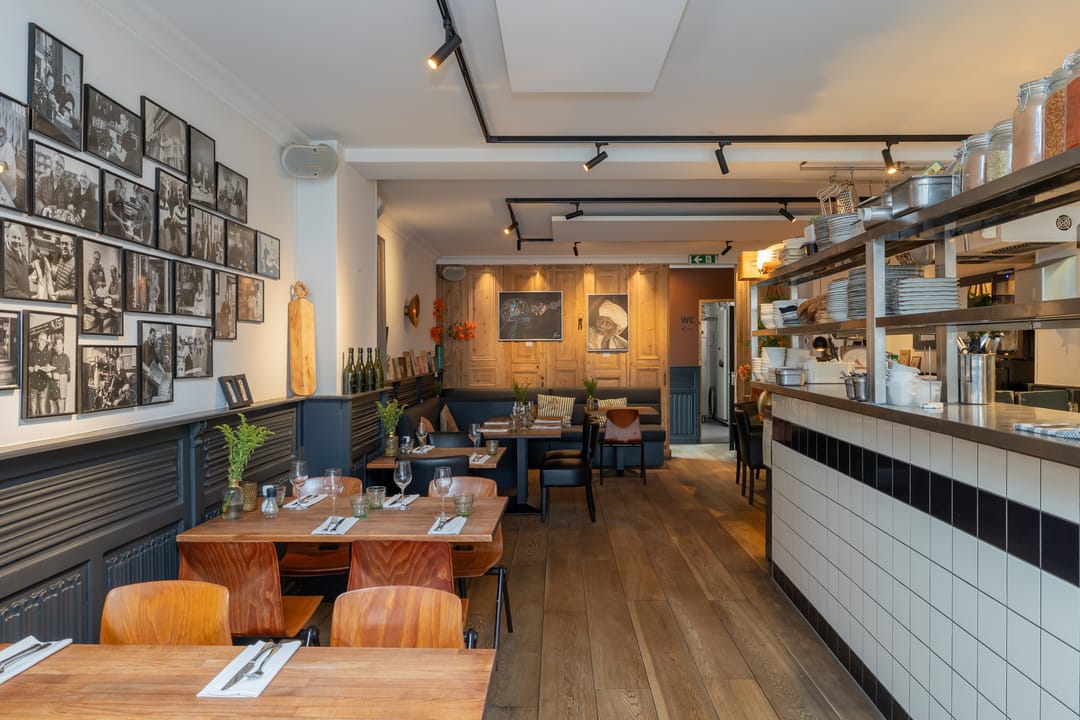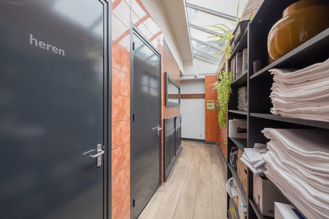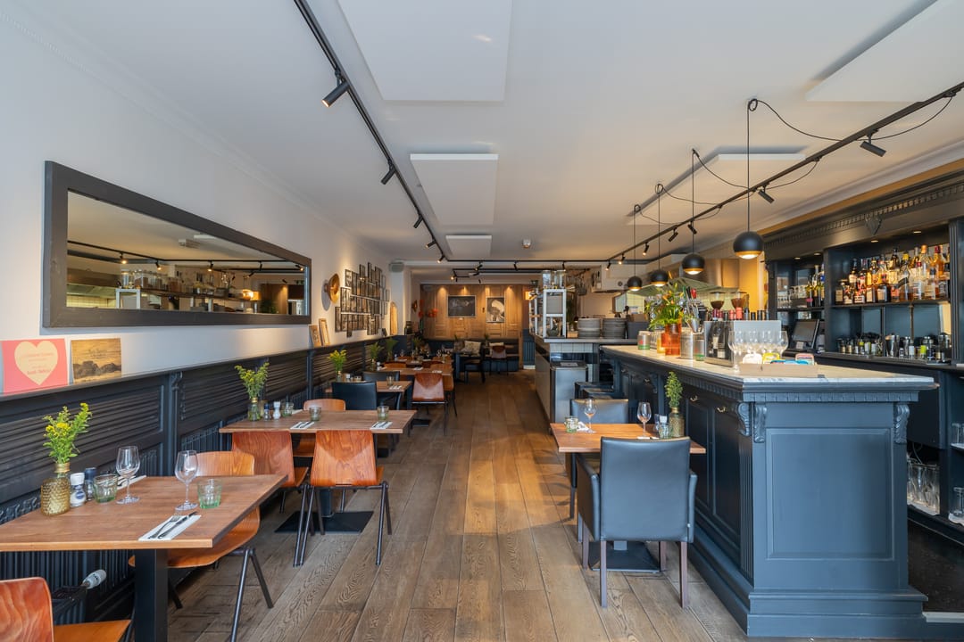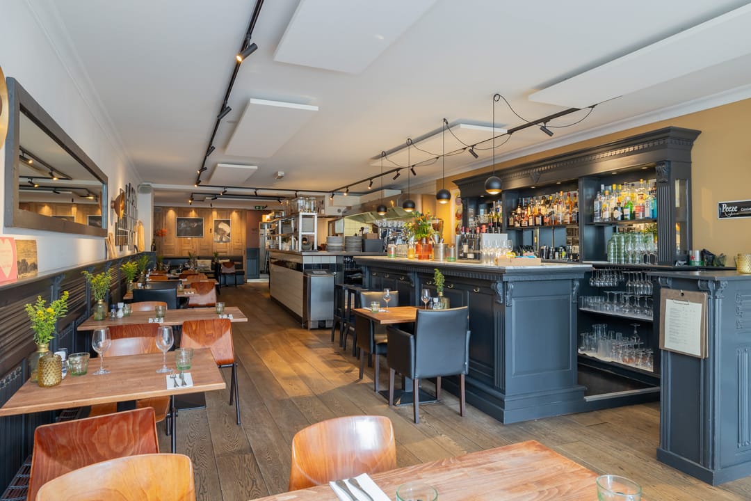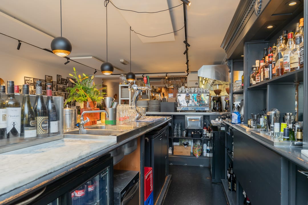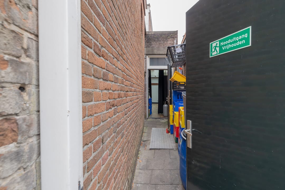 De indeling is overzichtelijk, met de bar en open keuken centraal in de zaak. De keuken is professioneel ingericht en voorzien van alle benodigde apparatuur, waaronder een krachtige afzuiginstallatie, koelwerkbanken en een efficiënte werkindeling. Achter in het pand bevinden zich de spoelkeuken, mise-en-place-ruimte en een gang naar de toiletten. Via deze gang is tevens de achterplaats bereikbaar, gelegen aan de Achteromstraat, ideaal voor afvalafvoer en extra opslag. Daarnaast beschikt het restaurant over een praktische opslagkelder.