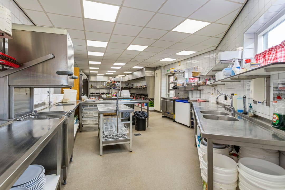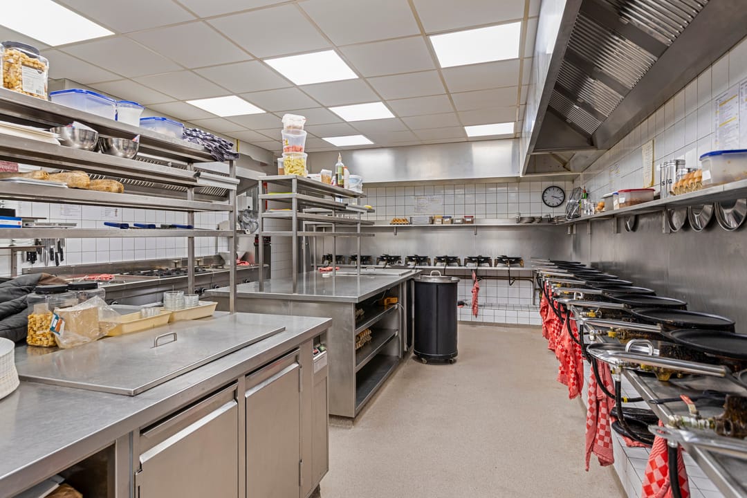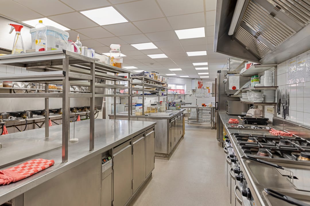 Boven het restaurant bevindt zich een ruime bedrijfswoning met vier slaapkamers, een woonkamer met open keuken, badkamer en een dakterras – ideaal voor eigenaren die wonen en werken willen combineren.