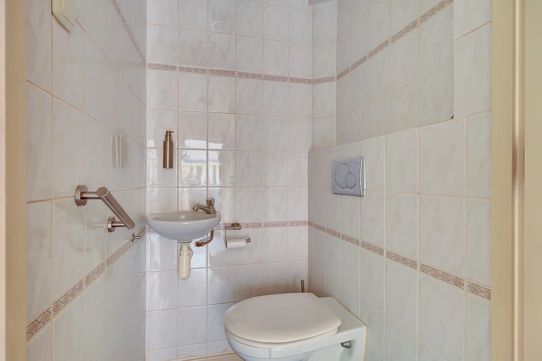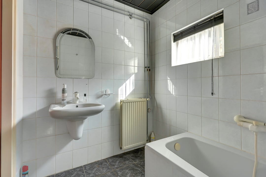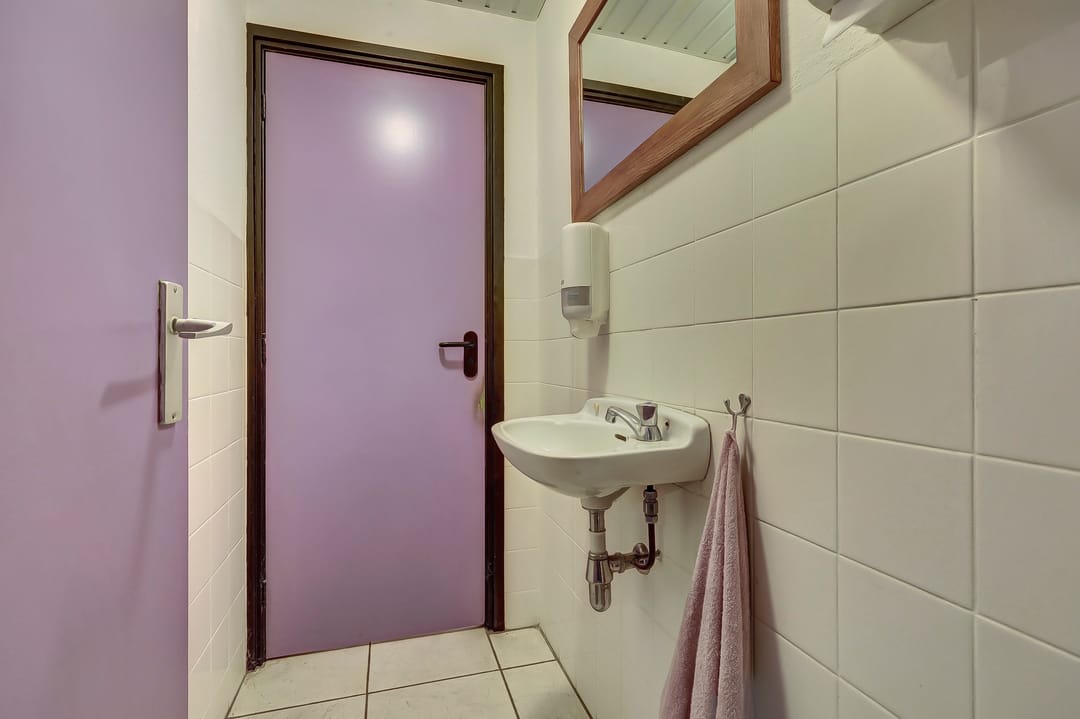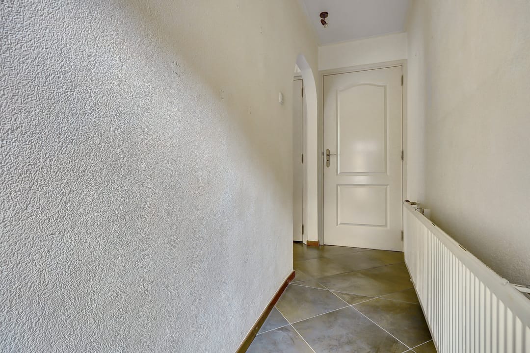 Naastgelegen de gang naar de achteruitgang en de toegang tot de badkamer met ligbad, douche, wastafel en het separate toilet met fontein. De voordeur heeft een rolluik. Deze woning is zeer geschikt voor gelijkvloers wonen.