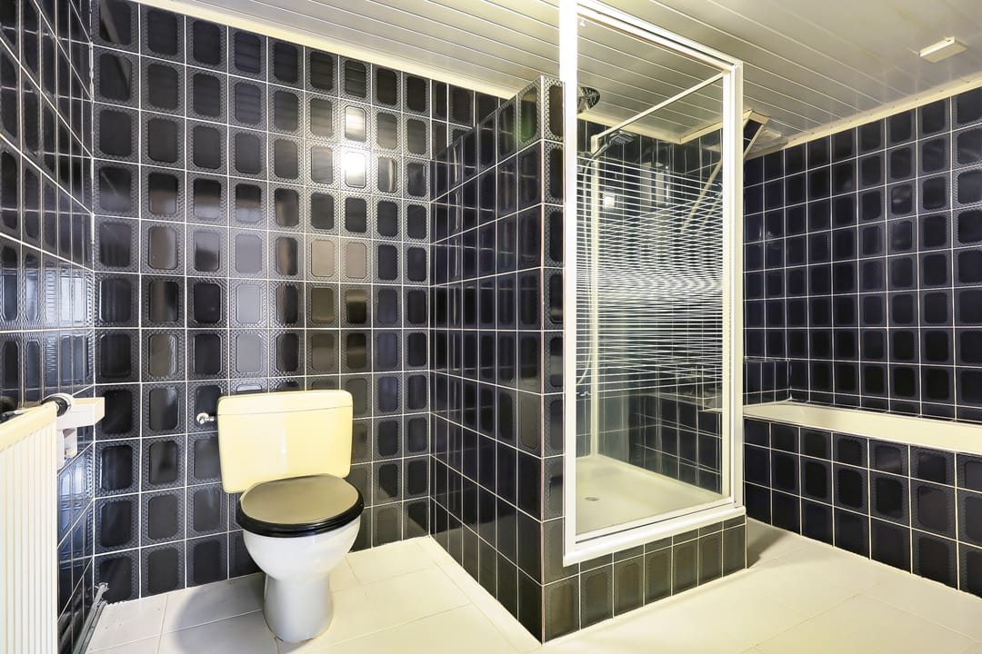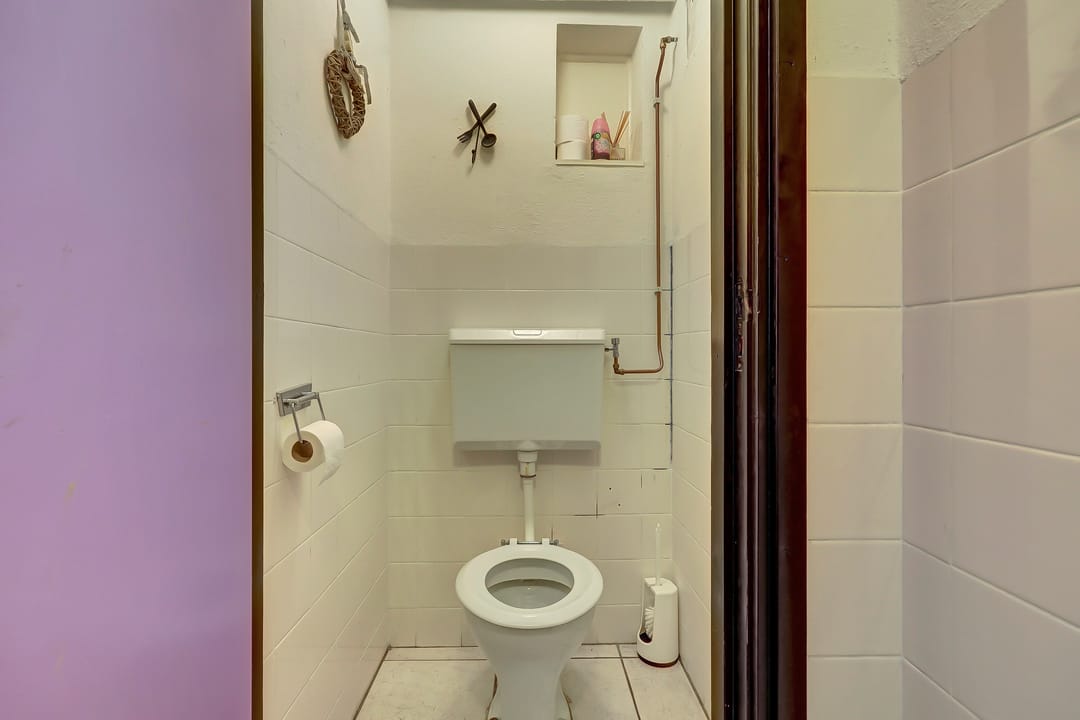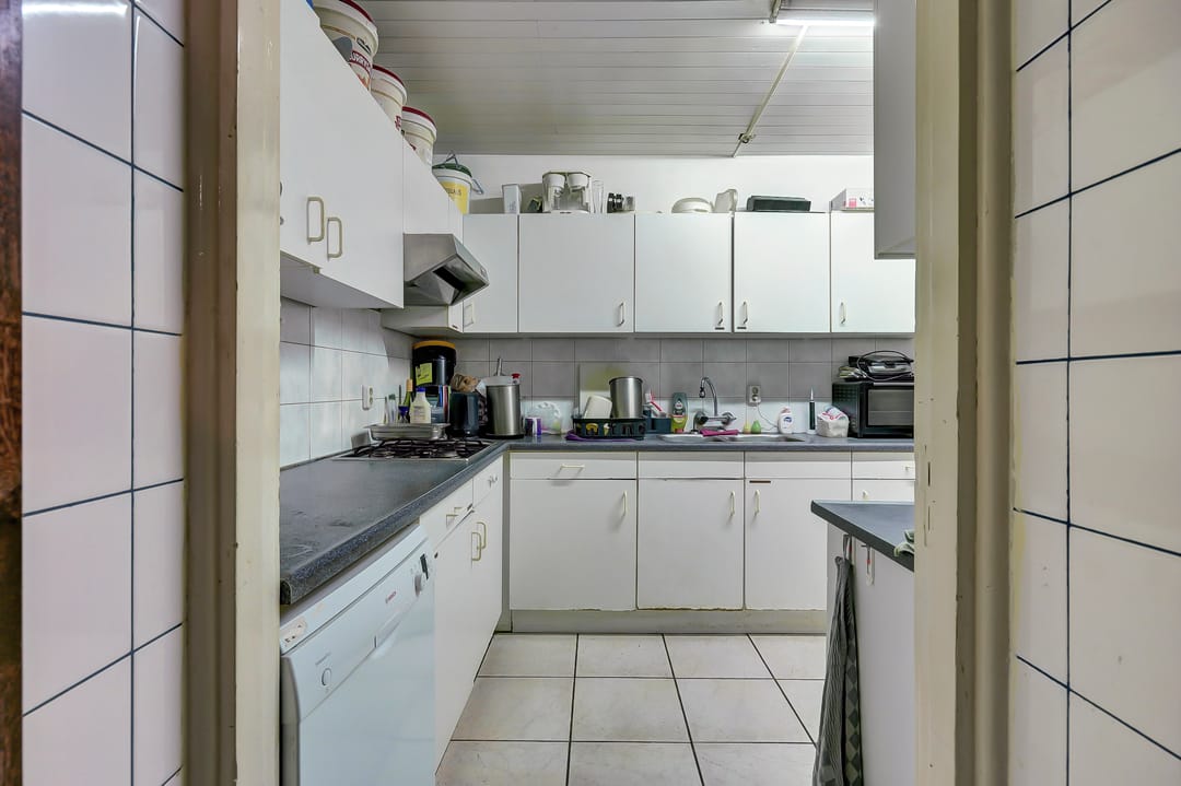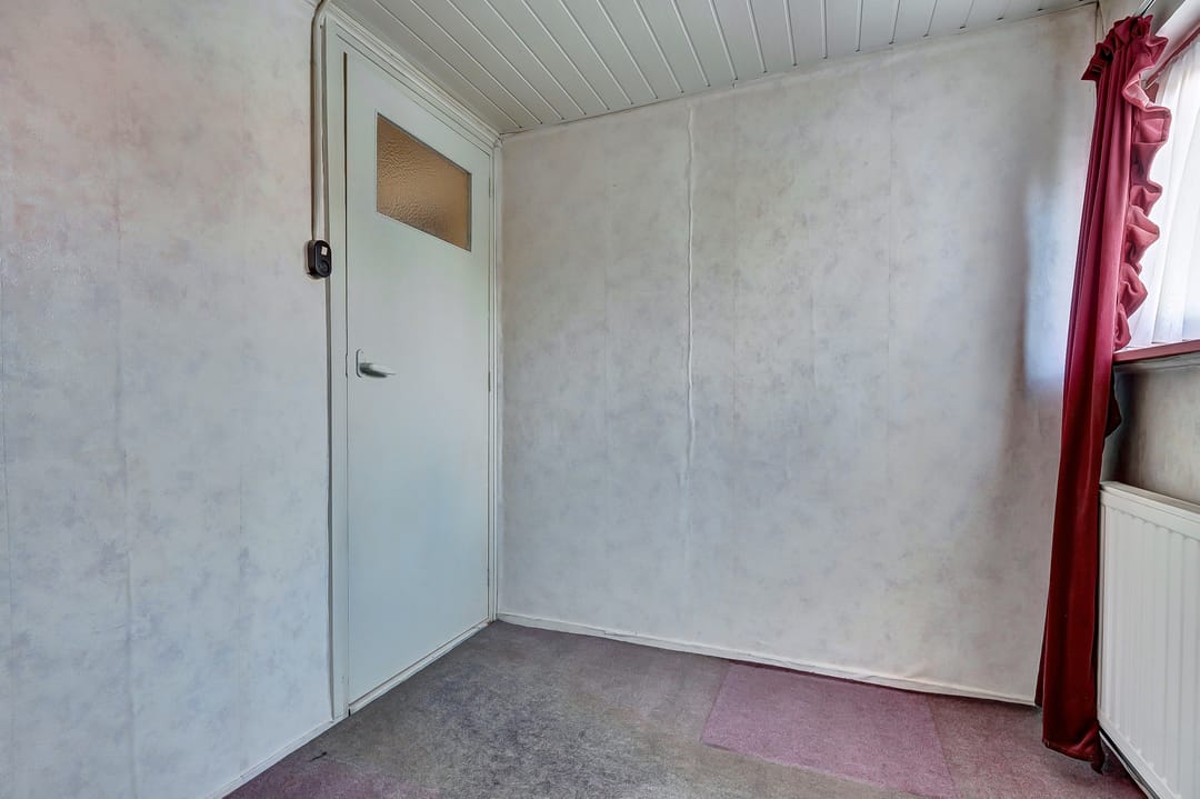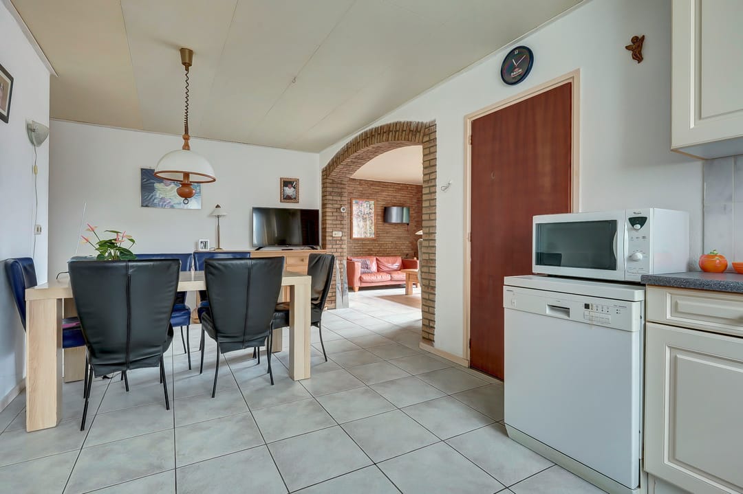 Naastgelegen de gang naar de achteruitgang en de toegang tot de badkamer met ligbad, douche, wastafel en het separate toilet met fontein. De voordeur heeft een rolluik. Deze woning is zeer geschikt voor gelijkvloers wonen.