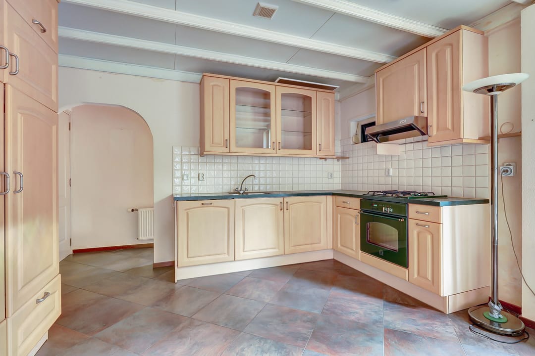Toegang via de inrit aan de rechterzijde, entree, gang, toilet met fontein, woonkamer met aansluitend de open keuken met vaatwasser, gaskookplaat en oven, afzuigkap, boiler, koelkast/diepvries, trapkast met wasmachine aansluiting, doorgang mogelijk naar de cafetaria, trapopgang, meterkast. Watermeter woning zit in de kelder van de cafetaria.
