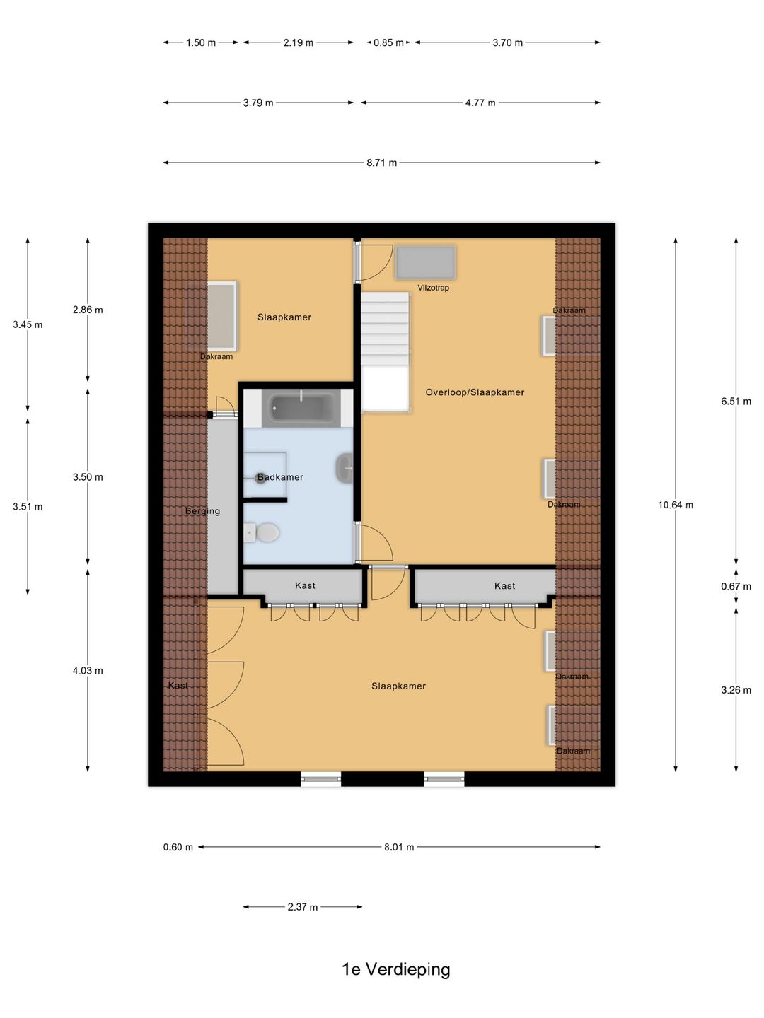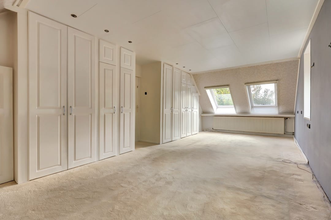 Ruime overloop met twee Veluxramen, hier is eenvoudig een extra slaapkamer te realiseren, slaapkamer met Veluxraam en aansluitend een opslagruimte, badkamer met toilet, douchecabine, wastafelmeubel en ligbad. Slaapkamer voorzijde over de gehele breedte met twee Veluxramen met zonwering, kastenwand en onder het dakbeschot een kastenwand, 2x handmatige rolluiken.