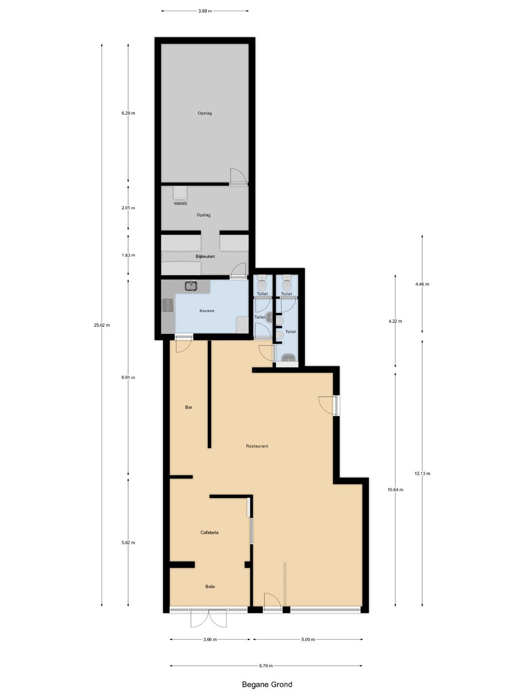 - Vloeren: Betonnen vloer cafetaria, houten 1e verdiepingsvloer